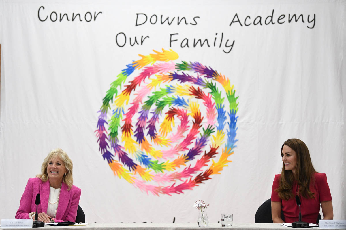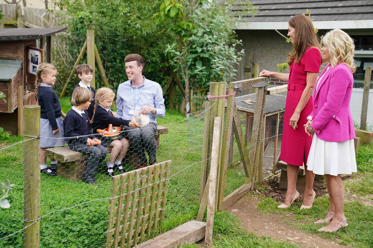 Anyway, since the UK is hosting the Summit, British dignitaries are being called to show up for the nation. And that’s where we find Catherine of House Cambridge today, at a school visit with First Lady Dr Jill Biden. They look like they got on well and Dr Biden’s easy, friendly demeanor, which you can see in several of these shots, as she gesticulates with her arms while talking, is matched by Kate’s relaxed body language. It was similar when Michelle Obama made trips to the UK and you’ll recall some of the commentary then about whether or not she was too familiar with the Queen when she hugged her. The Queen didn’t seem to mind, it was all kinds of other pearl-clutchers who made a fuss about it.