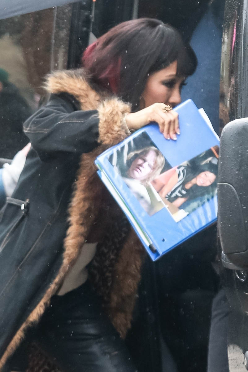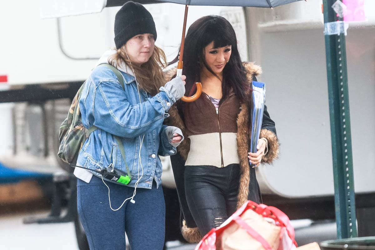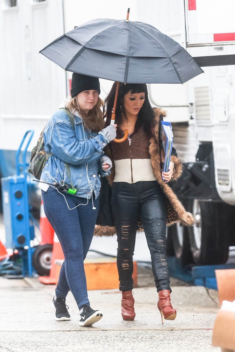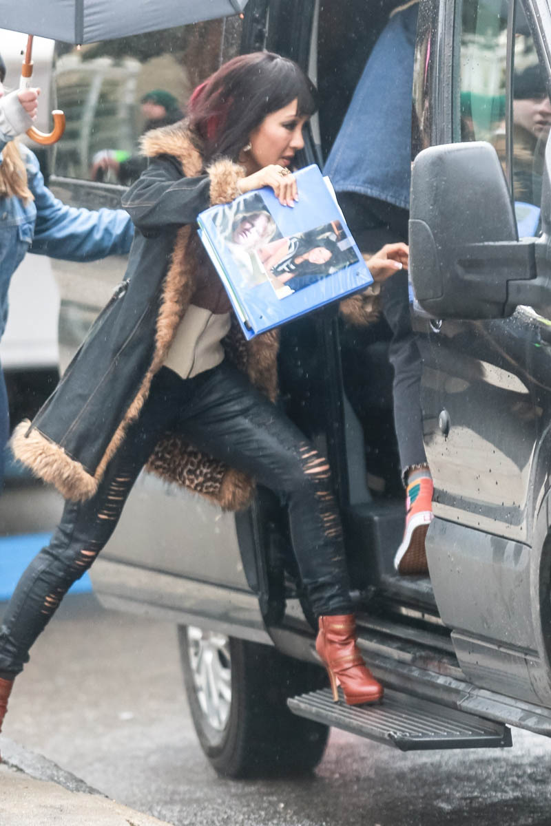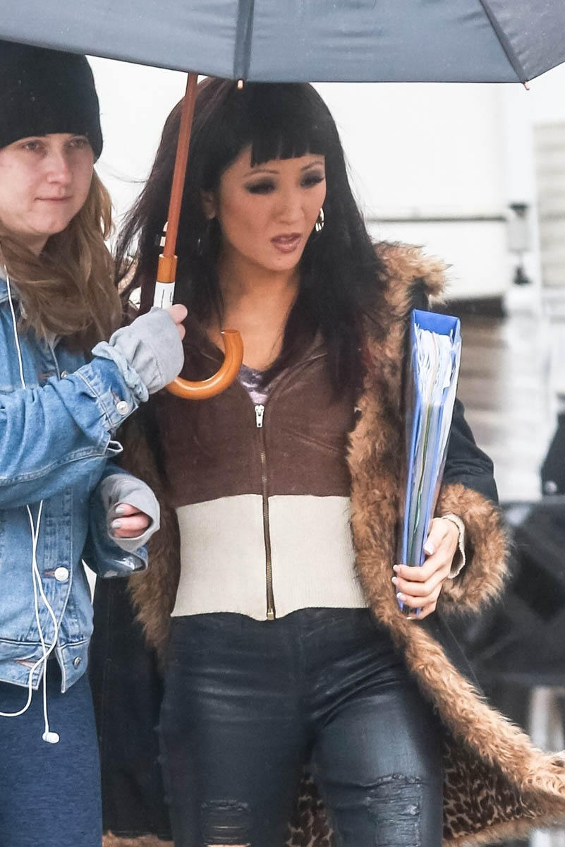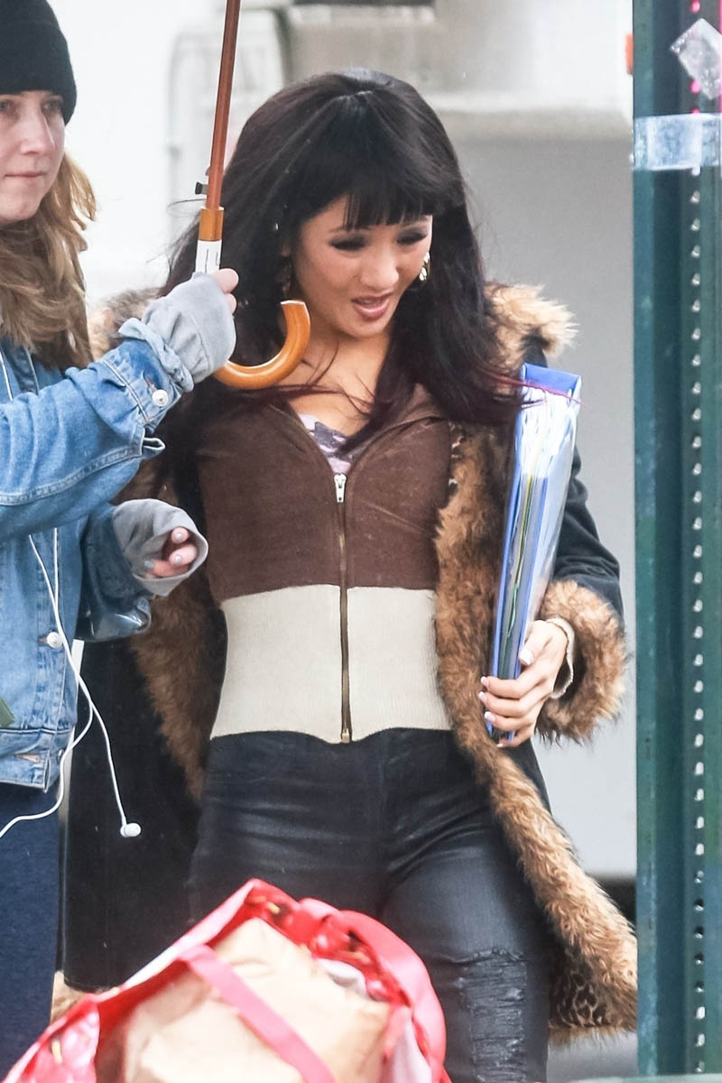 Sarah wrote earlier this week about Hustlers, the movie based on The Hustlers at Scores who scammed the wealthy men patronising the establishment. With casting now complete, filming is underway – here’s Constance Wu in costme today in New York fully looking the part. This is not Rachel Chu. This is french manicures and eyelashes and tight pants and fur-trimmed cheap coats and chunky red highlights.