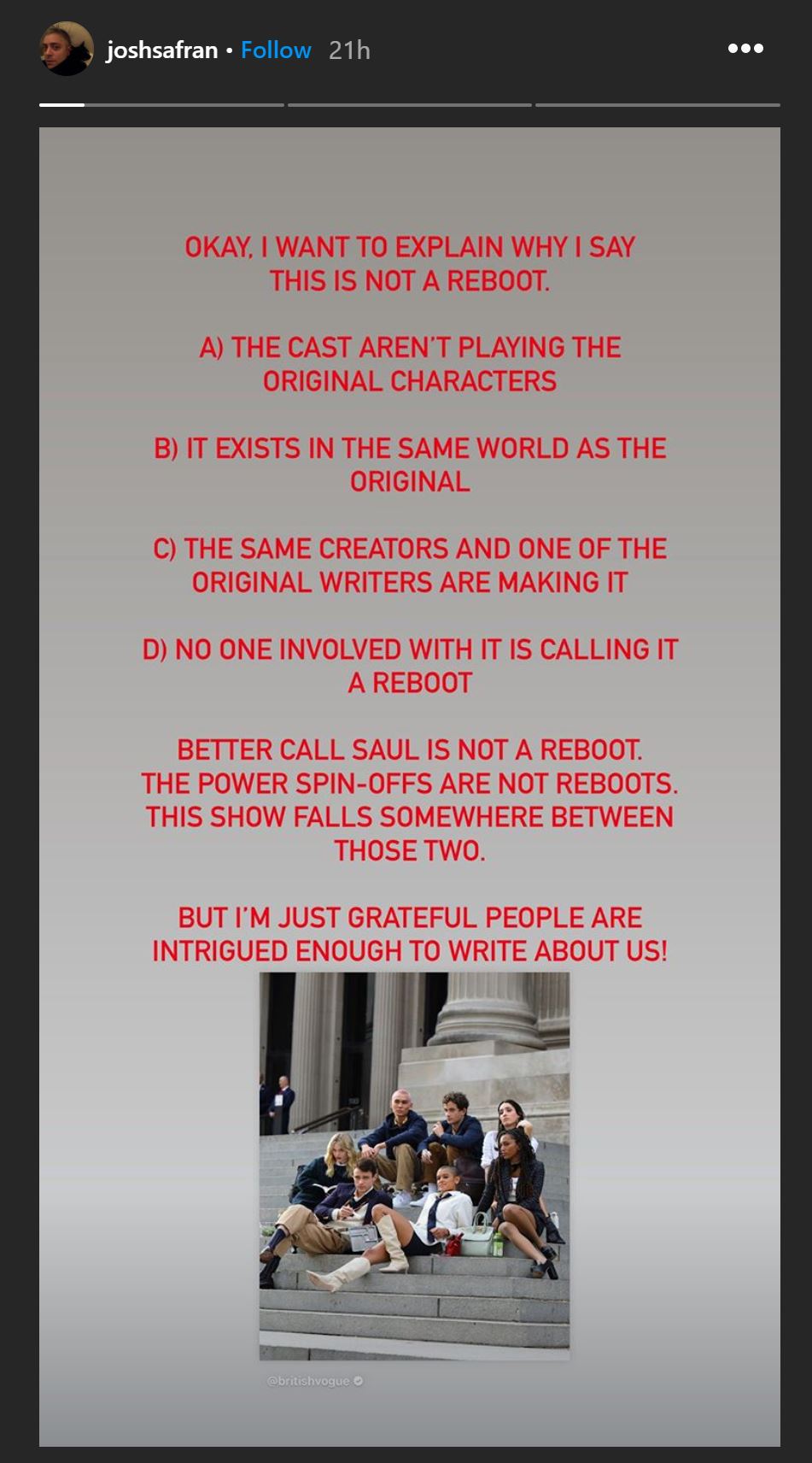 Speaking of Instagram, the new Gossip Girl will still be about private school kids and their dramas, and likely feature a ball every episode (there was a ball for everything!), this time social media is in play. Which means one character, for sure, will be a TikTok star. So, no, this is not a reboot, even though it’s constantly referred to as one. Showrunner Joshua Safran prefers a different word: extension. This is what he posted on Instagram stories: