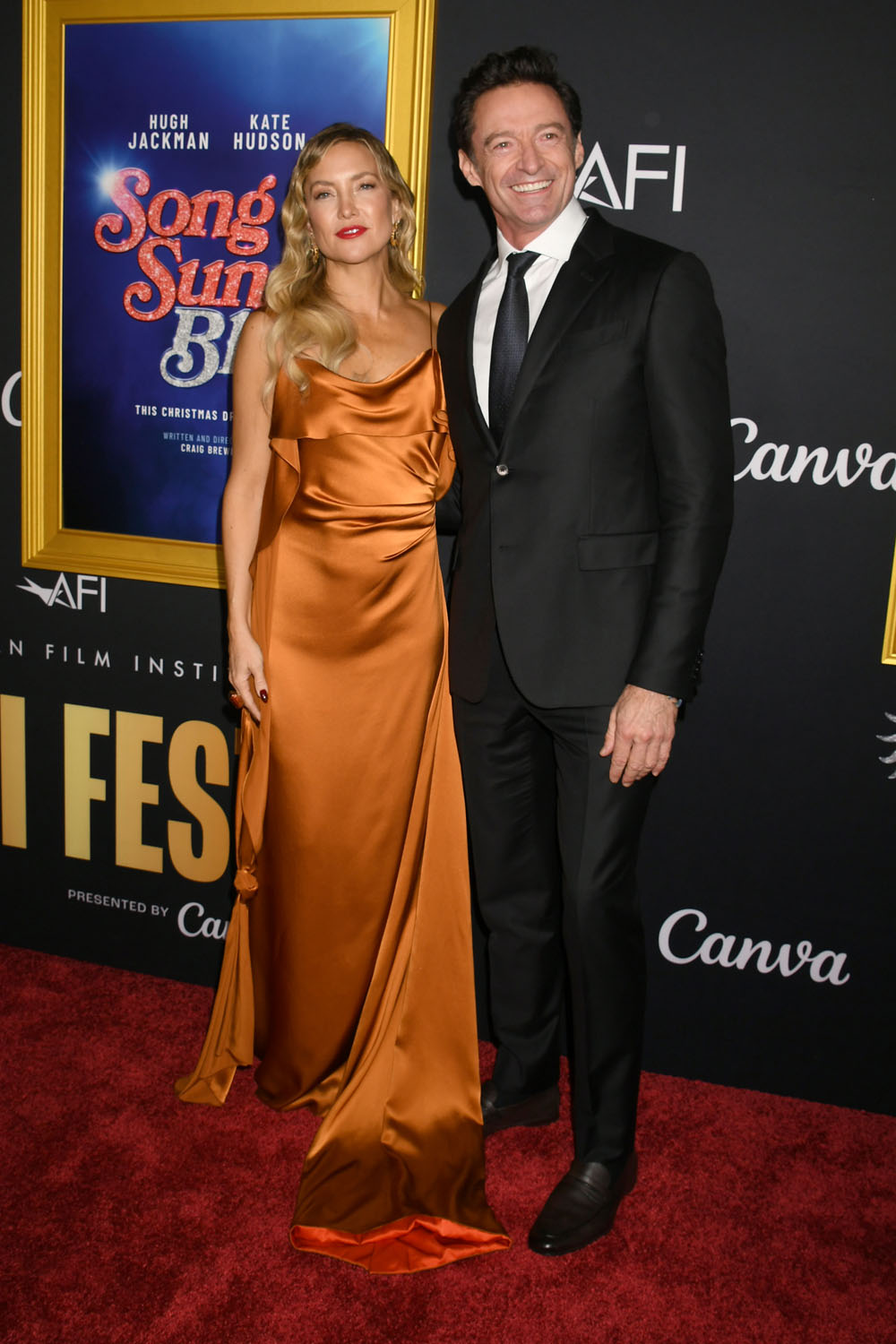 Here are Kate and Hugh on the carpet last night. She did not wear blue, for Song Sung Blue, but she did match her dress to the poster.