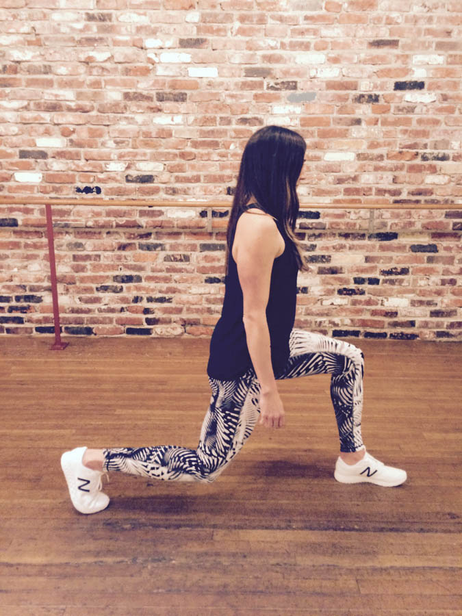 I love this exercise because it is going to hit all 360 degrees of your legs, a definite leg burner. Begin with your feet together and then step forward into a lunge with your right foot. Press yourself back to center but rather than placing your right foot back down on the floor, step out into a side lunge. Press yourself back towards center before stepping back into a reverse lunge and then the for last one, step your right foot behind your left and lunge down as if you are doing a curtsy. Start by doing 5 sets on one side, then 5 on the other and work your way up to 10.