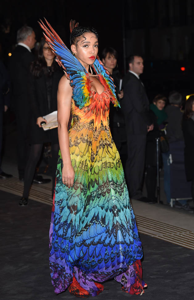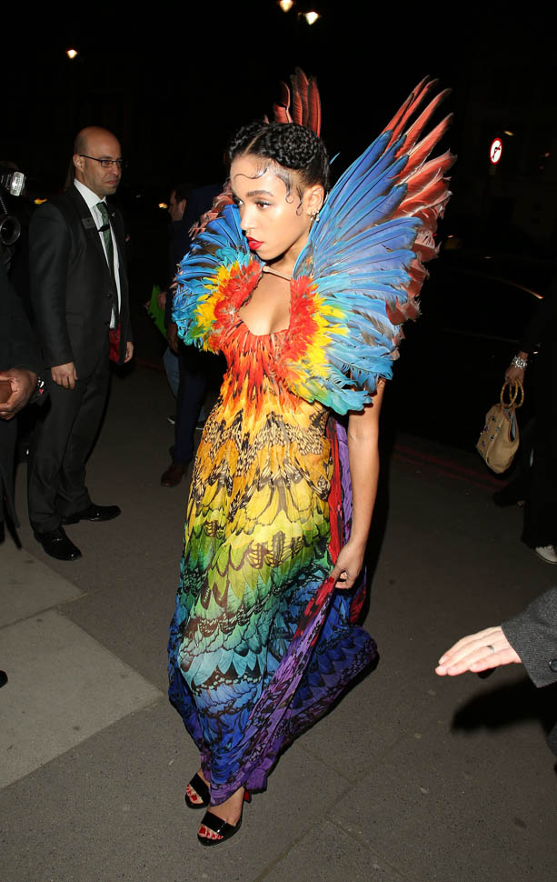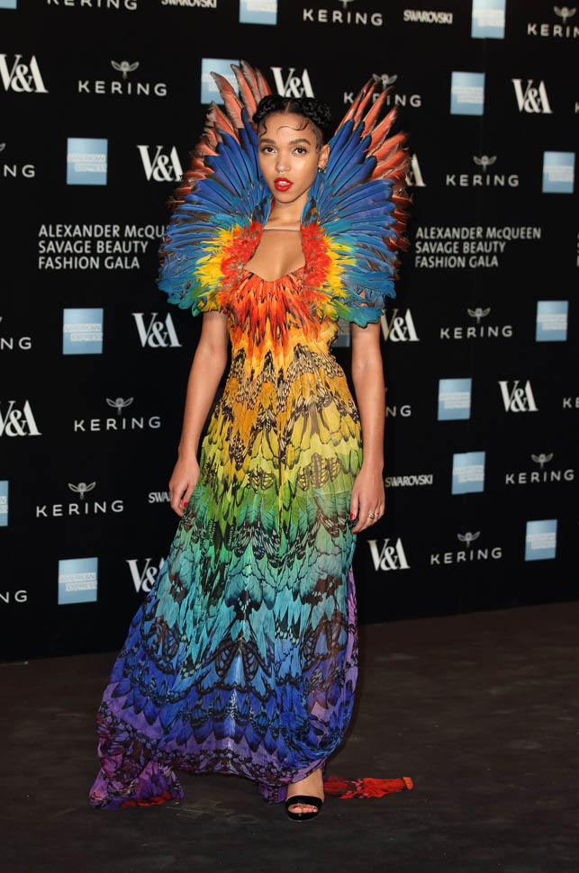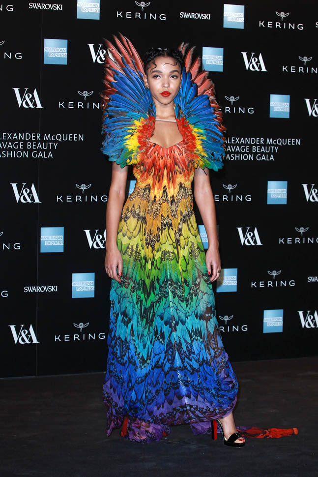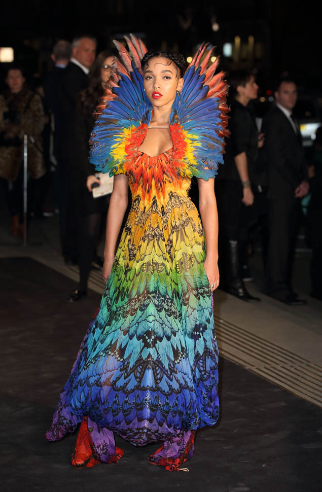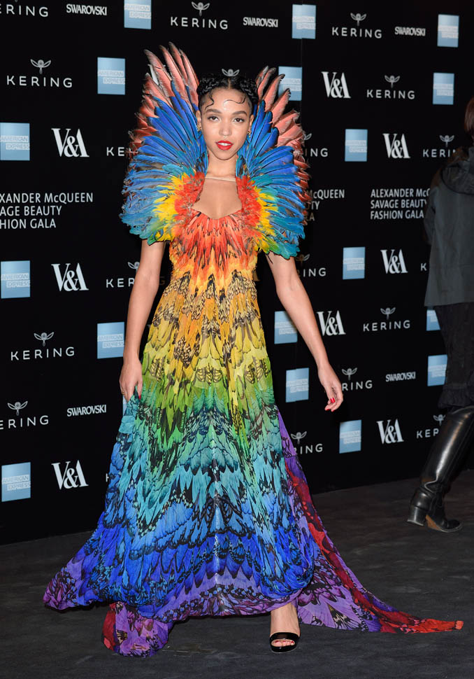 Anyway, Savage Beauty has finally arrived in London. I’ll be there in a month. I’m going. And I’m not f-cking fainting. The gala opening was last night. A lot of notables in attendance. Including FKA twigs who had the honour of wearing McQueen’s memorable Bird of Paradise dress. And you know, the curators of the brand, the people who protect the designer’s legacy, they don’t just loan that sh-t out to any Kardashian who comes calling. They’re works of art. So they’re selective about the McQueen spirit. And, evidently, they’ve decided that FKA twigs has the McQueen spirit, not only because she’s wearing the Birds but also because she performed at the event IN the dress.