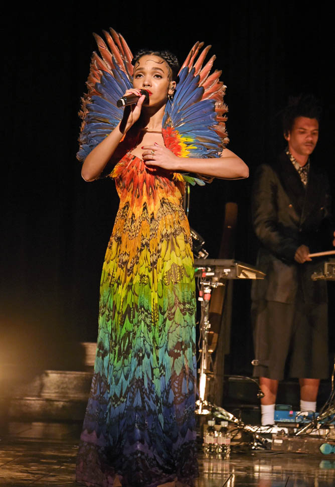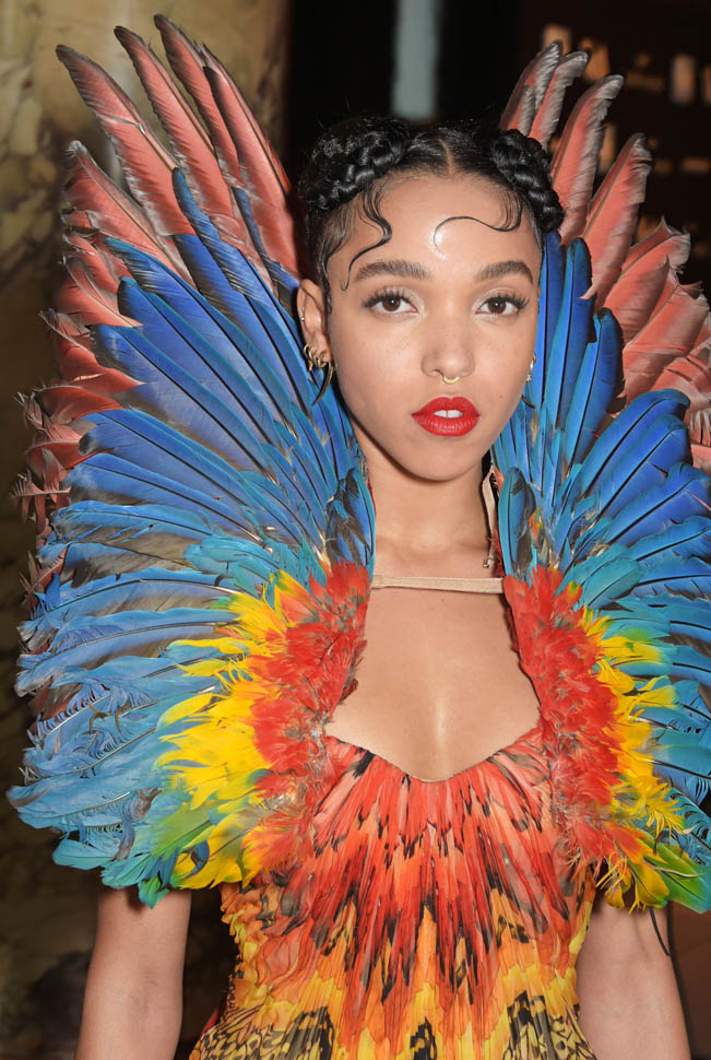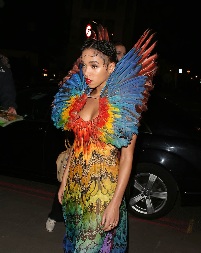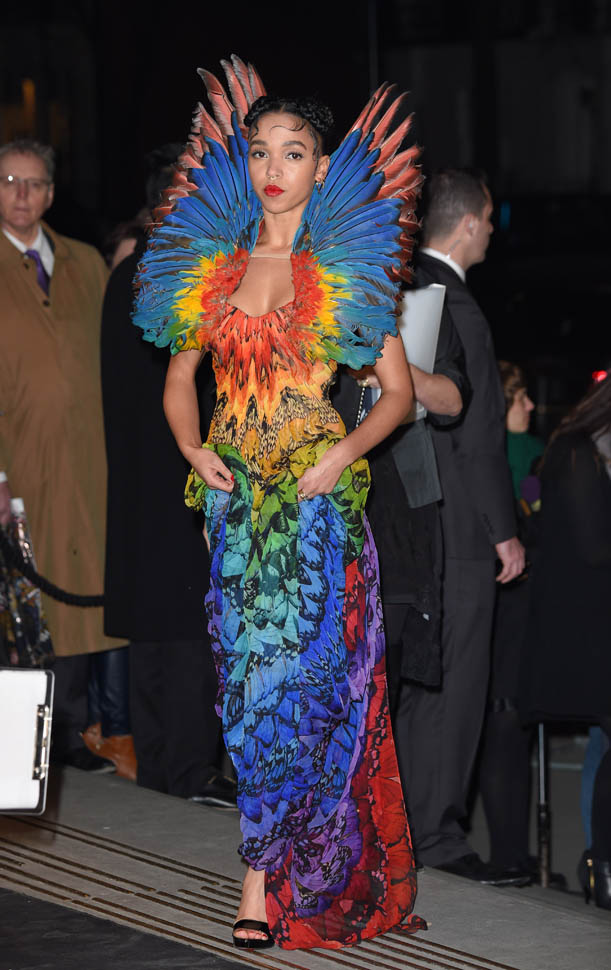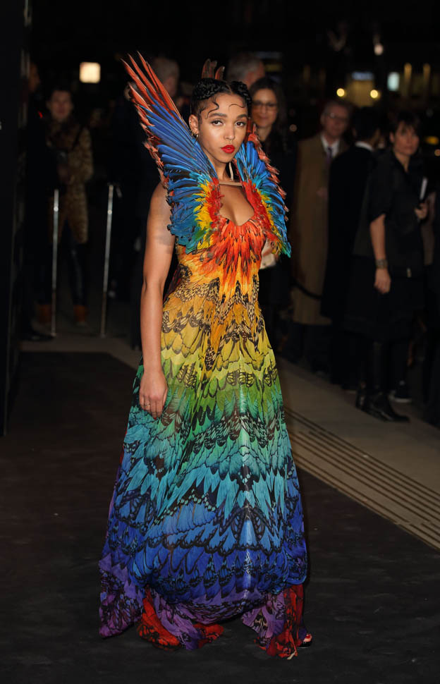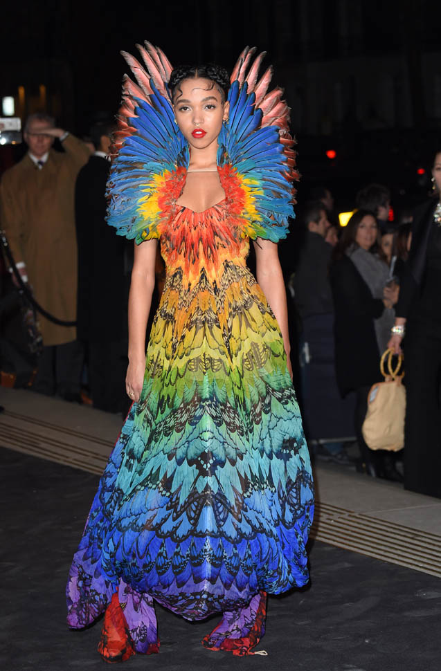 Anyway, Savage Beauty has finally arrived in London. I’ll be there in a month. I’m going. And I’m not f-cking fainting. The gala opening was last night. A lot of notables in attendance. Including FKA twigs who had the honour of wearing McQueen’s memorable Bird of Paradise dress. And you know, the curators of the brand, the people who protect the designer’s legacy, they don’t just loan that sh-t out to any Kardashian who comes calling. They’re works of art. So they’re selective about the McQueen spirit. And, evidently, they’ve decided that FKA twigs has the McQueen spirit, not only because she’s wearing the Birds but also because she performed at the event IN the dress.