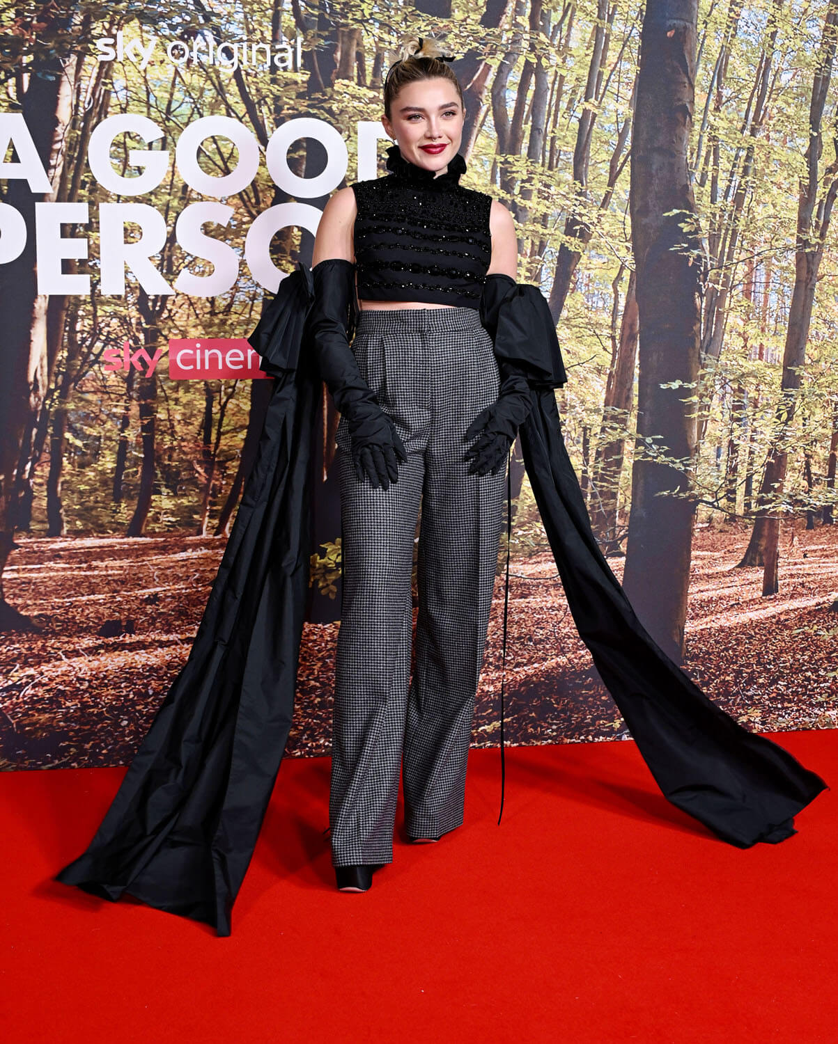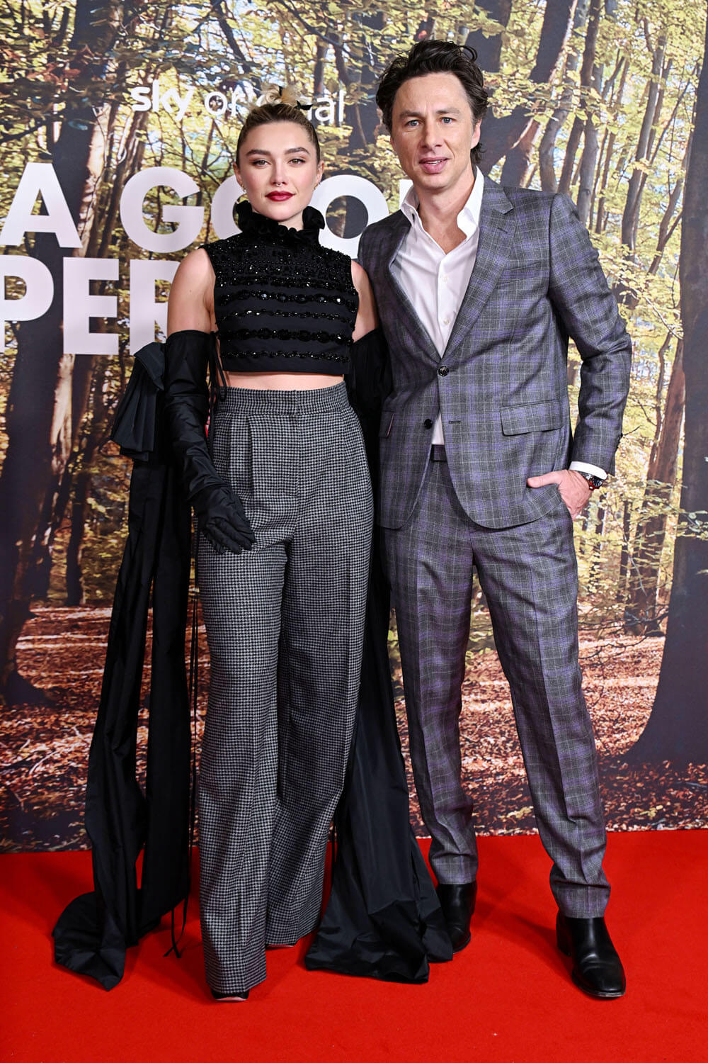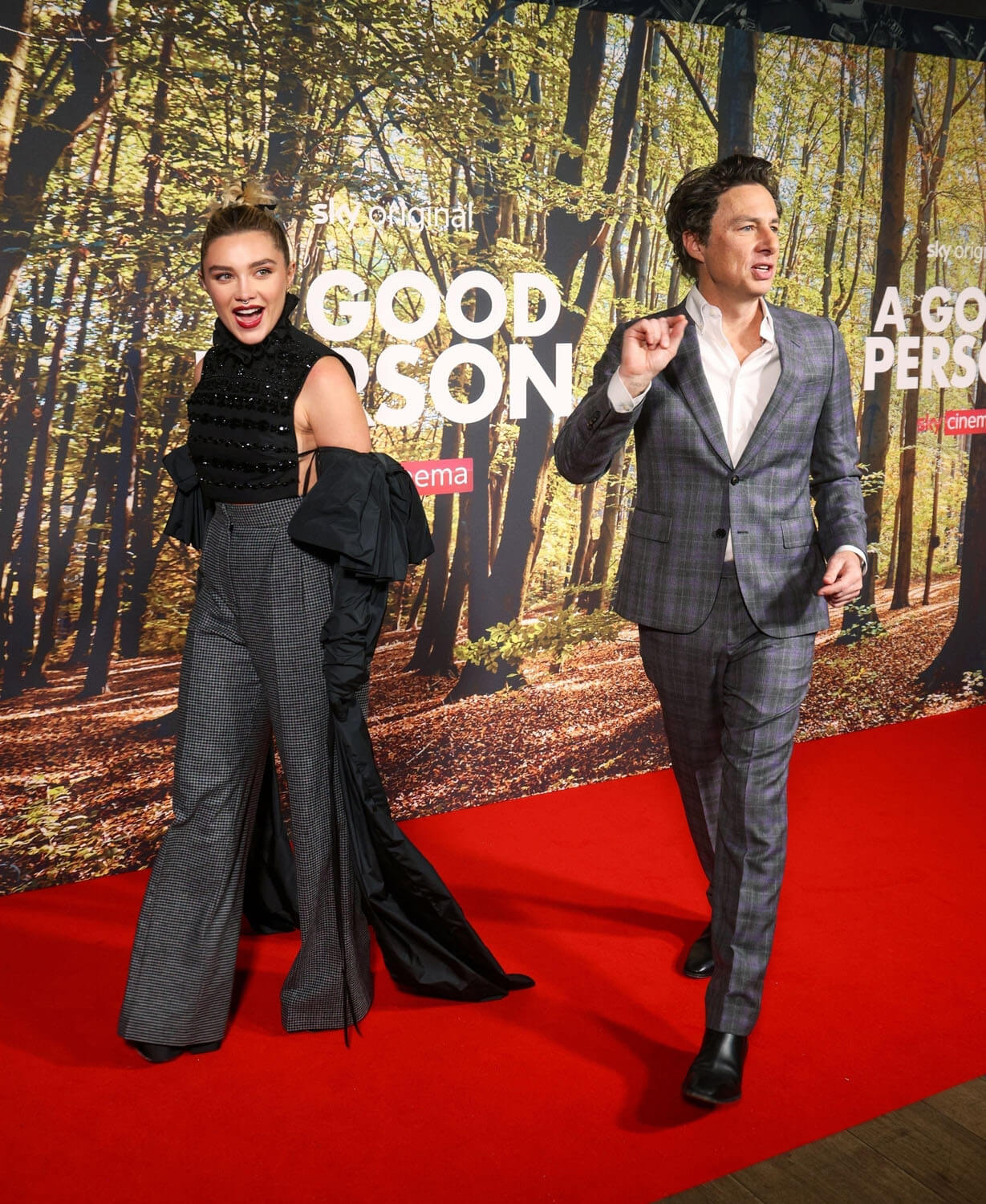 A Good Person will be released on March 24. Zach wrote, produced, and directed the film; Flo is also a co-producer, and the star, alongside Morgan Freeman. So here they are, Flo and Zach together again, last night in London at the premiere. They even coordinated their outfits and posed side-by-side on the red carpet without, seemingly, any awkwardness. Which, obviously, is indicative of how amicable their breakup was and also how good at business they are – this, after all, is a project they’ve both invested in, and the priority is for it to succeed. Presenting a united front helps everyone…