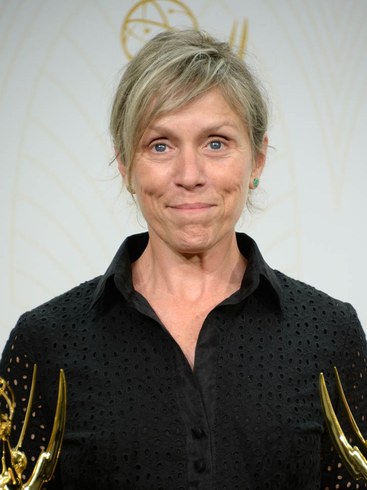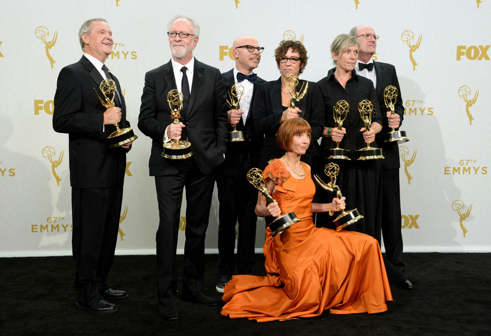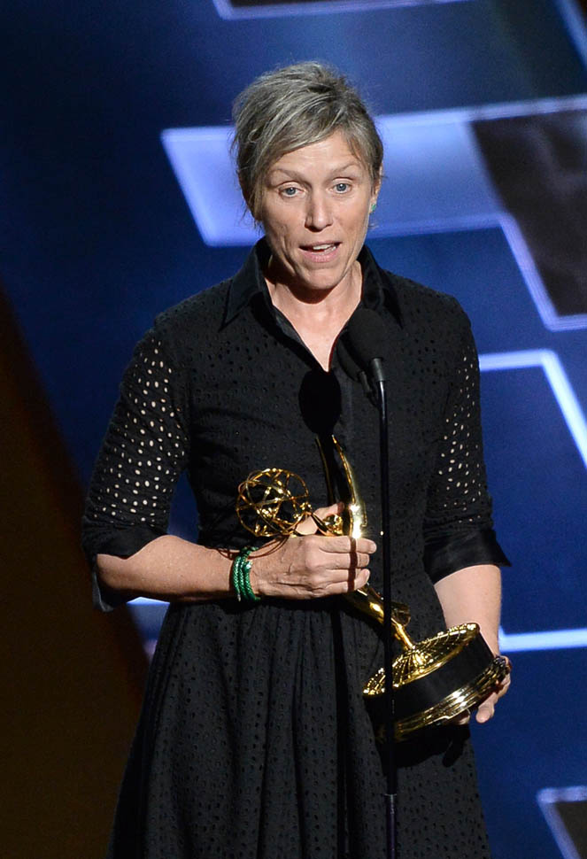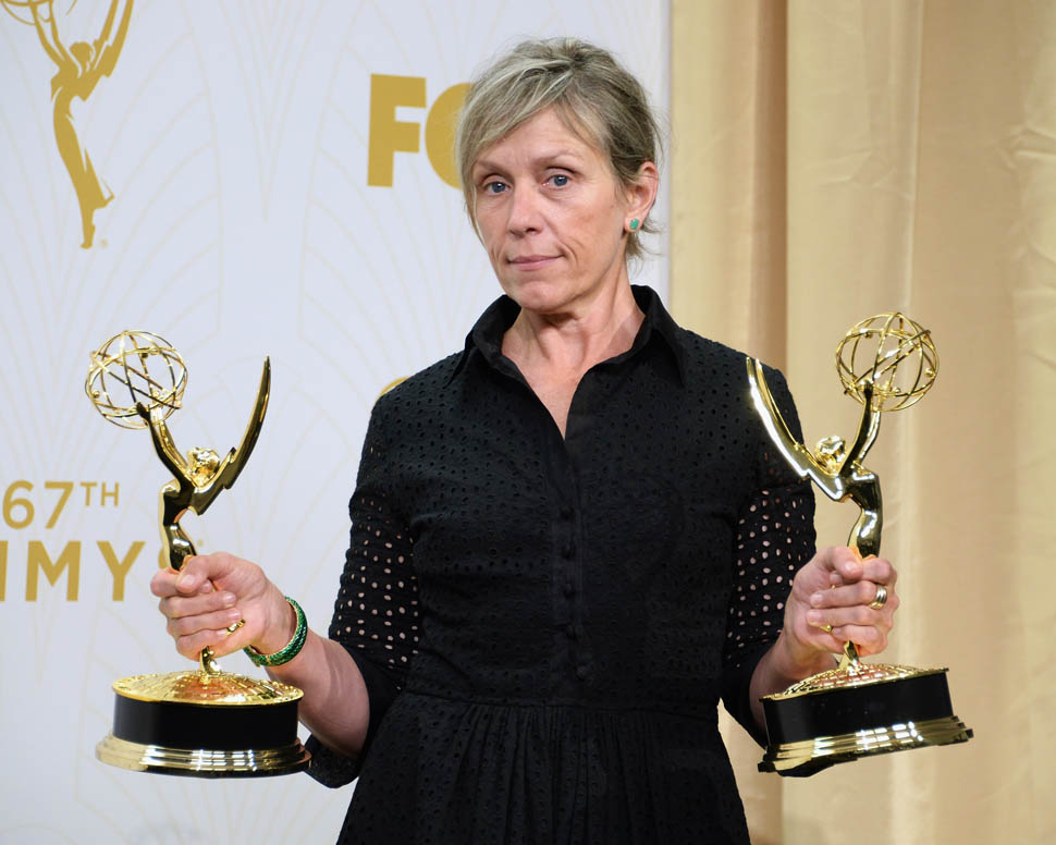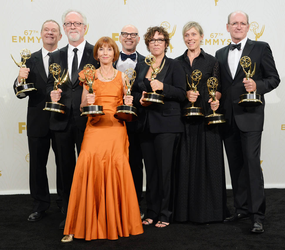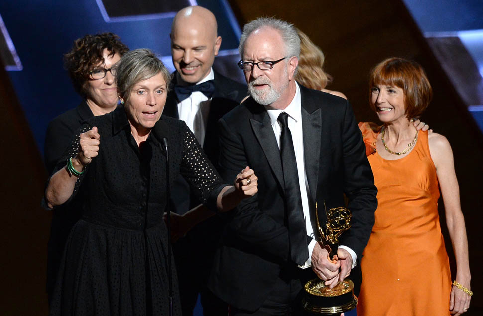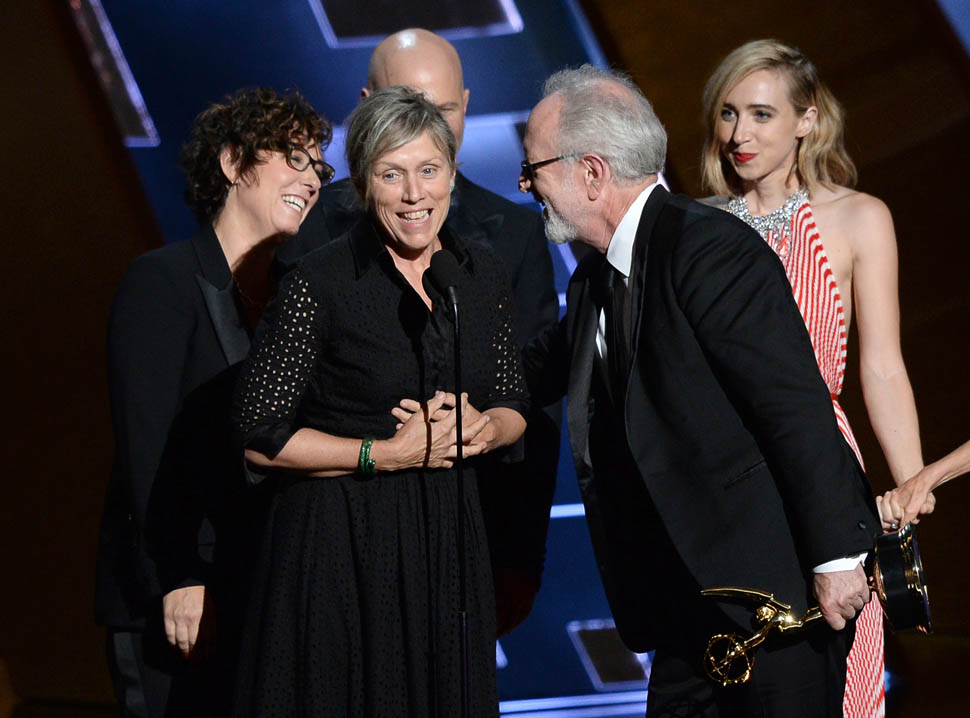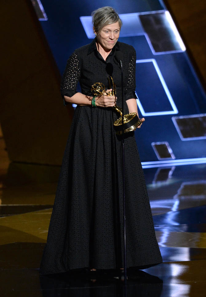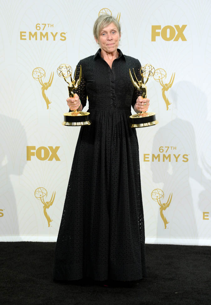 Frances McDormand won the Emmy for Outstanding Lead Actress in a Miniseries/Movie for Olive Kitteridge, which gives her a TOE (Tony-Oscar-Emmy). This is a not insignificant achievement, and as icing on her cake, Kitteridge also won a boatload of other Emmys, including ones for writing, directing, lead and supporting acting for Richard Jenkins and Bill Murray, respectively, and Outstanding Limited Series. It was a banner night for Kitteridge, but you wouldn’t know it by looking at Frances McD. She looked like she’d rather be doing anything else other than being at the Emmys, including polishing the silver, bathing the dog, and doing her taxes. Bill Murray no-showed, and you could see McDormand thinking, “Why didn’t I do that?!”
