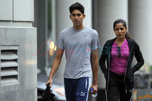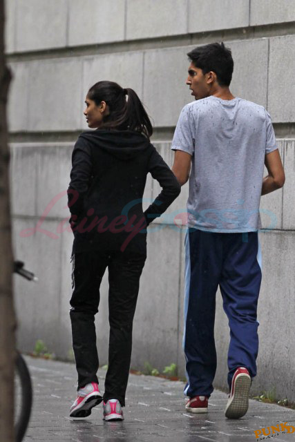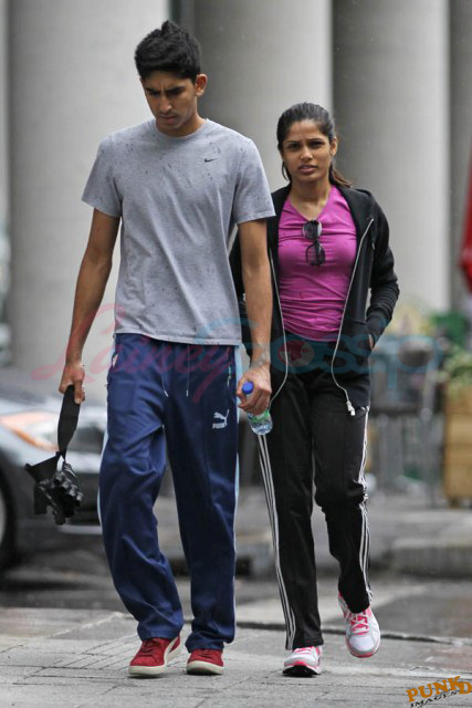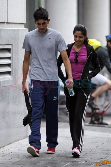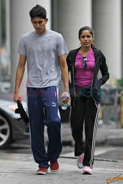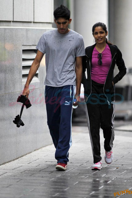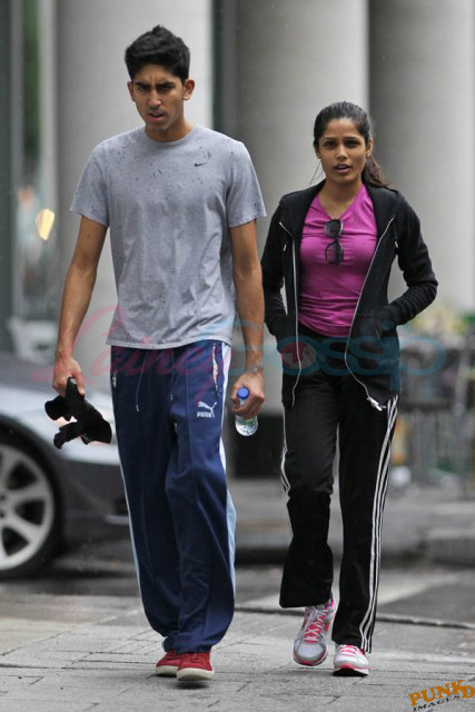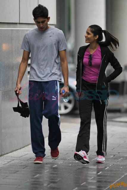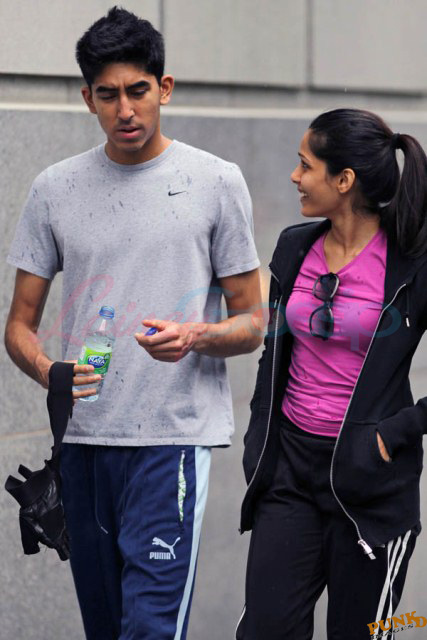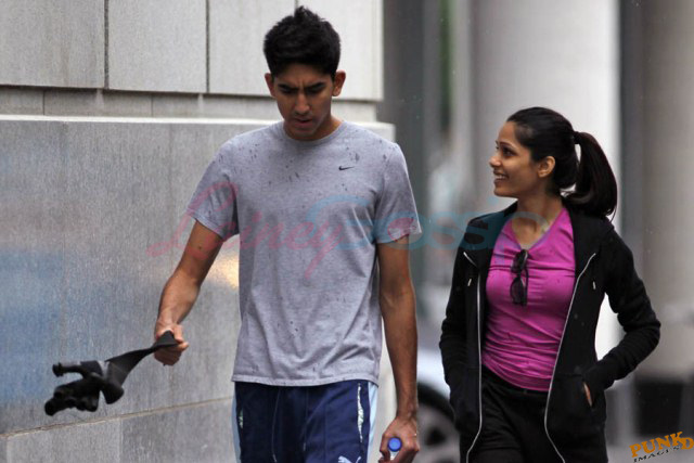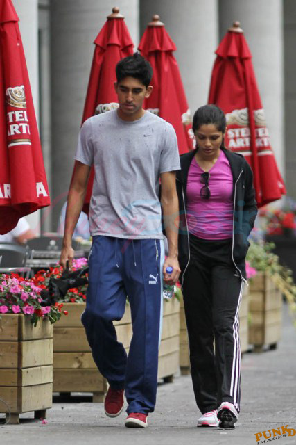 Freida Pinto has been in Montreal shooting Immortals. Her boyfriend Dev Patel is in town to join her, seen here together leaving the gym yesterday after a workout.