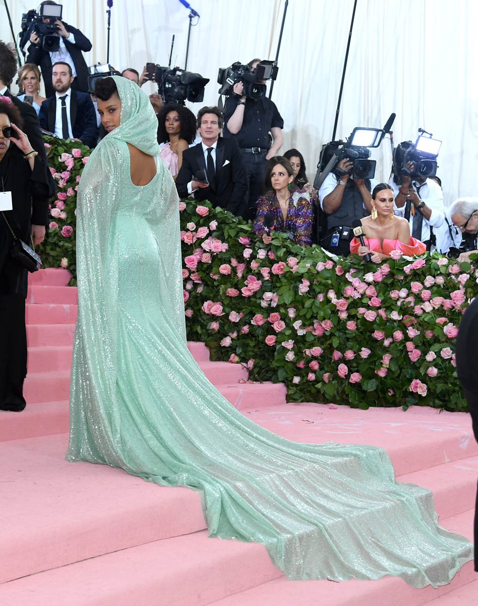 I don’t have enough knowledge of various Catholic orders to have the exact words for what they’re wearing, but together, his hood and her… what is that, a wimple? A wrap? BET.com called it a swim cap, so sure, let’s go with that. They look like renegades from a futuristic community who have had to go dark to escape some nefarious overlord in their previously peaceful community and remade their outfits to reflect their new affiliations, like in Captain Marvel. And – it cannot be overstated here – they are literally dripping in diamonds.