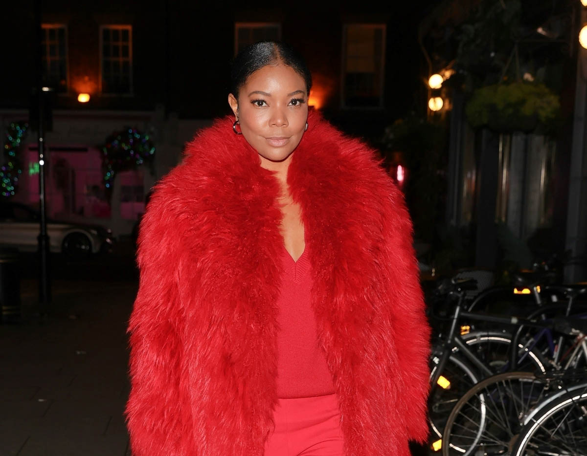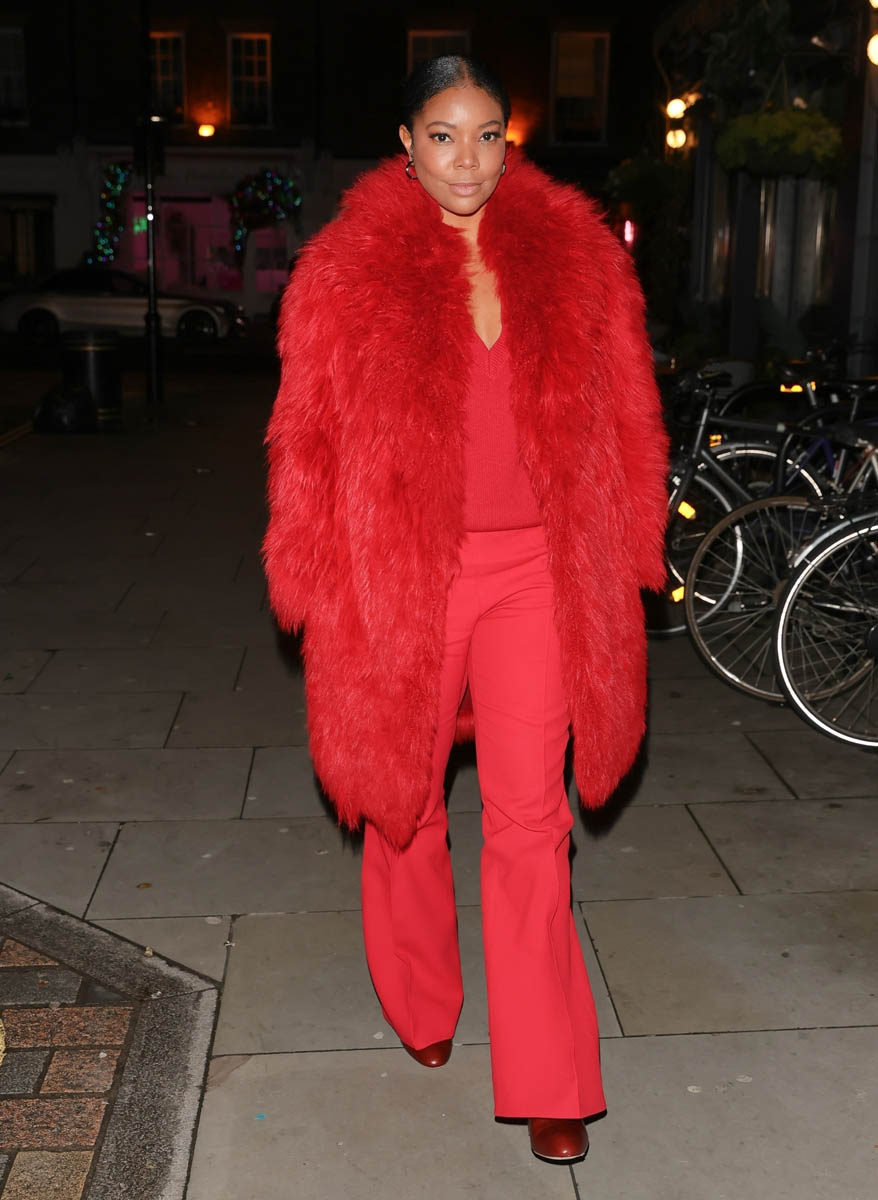 Doesn’t seem like Gabrielle stayed the weekend though because yesterday she was in London, seen in a couple of different outfits. She attended the WizKid show at the O2 and she also partied at Chiltern Firehouse in a glorious red monochrome look featuring a fluffy coat, top, and matching trousers and boots. And she was feeling herself.