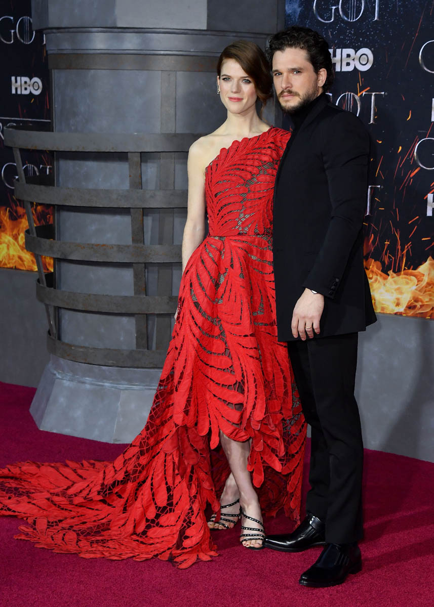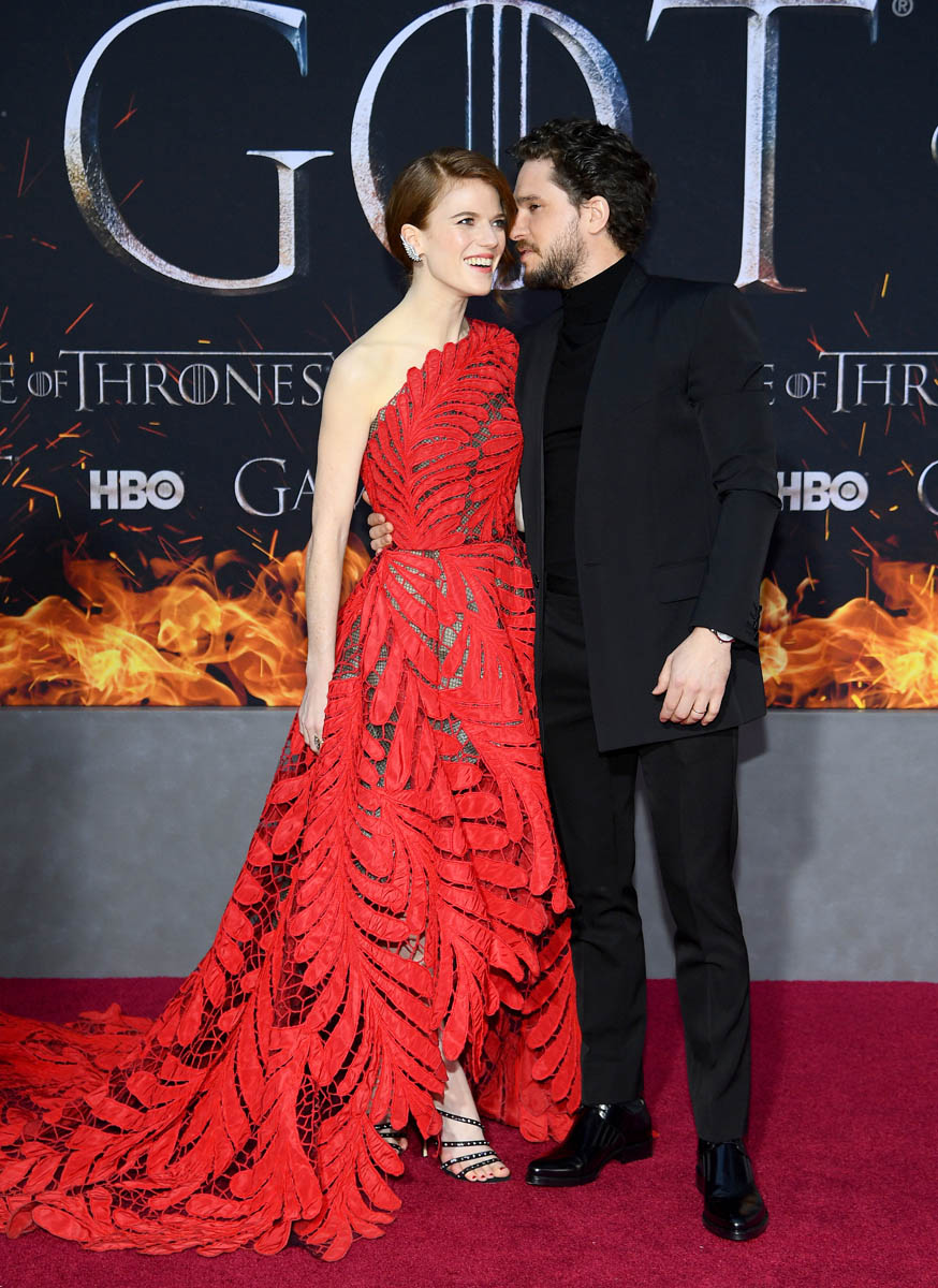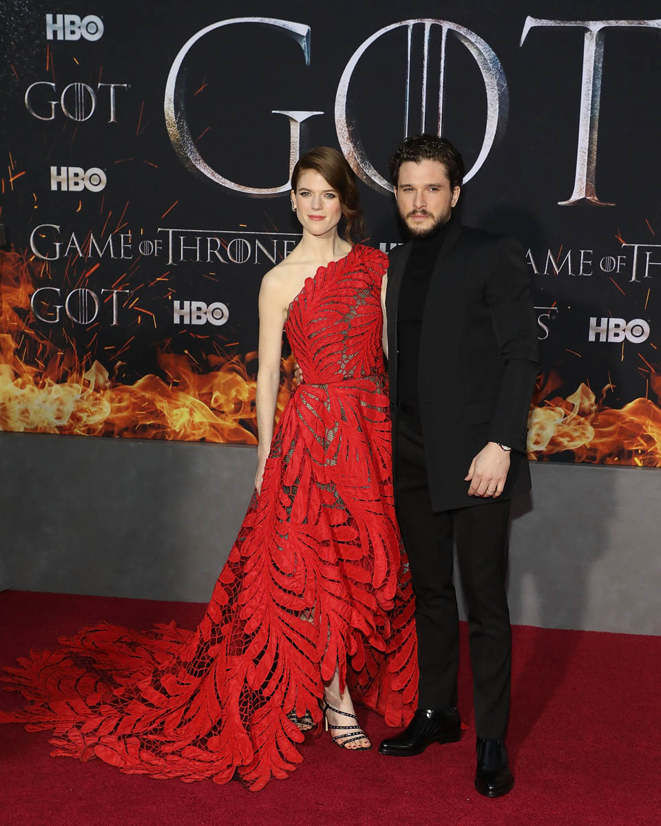 Last night was the last red carpet, the final premiere, which brought out those who remain and many who have fallen. We are separating the GoT event into several posts. For this one, let’s focus on a few of the most prominent main characters, starting with Jon Snow/Kit Harington who was joined by Ygritte/Rose Leslie in a f-cking spectacular red one-shoulder Oscar de la Renta dress, for their first GoT carpet since their marriage. Jon, as you know, is now in love with Daenerys. Jon, as you know, doesn’t know that he’s banging his aunt, the woman who’s grown some dragons but has also, steadily, been growing the vengeful, destructive urge that is characteristic of her House. How will this end? Are Jon and Dany the show’s OTP? Or… has his true love already died in his arms?