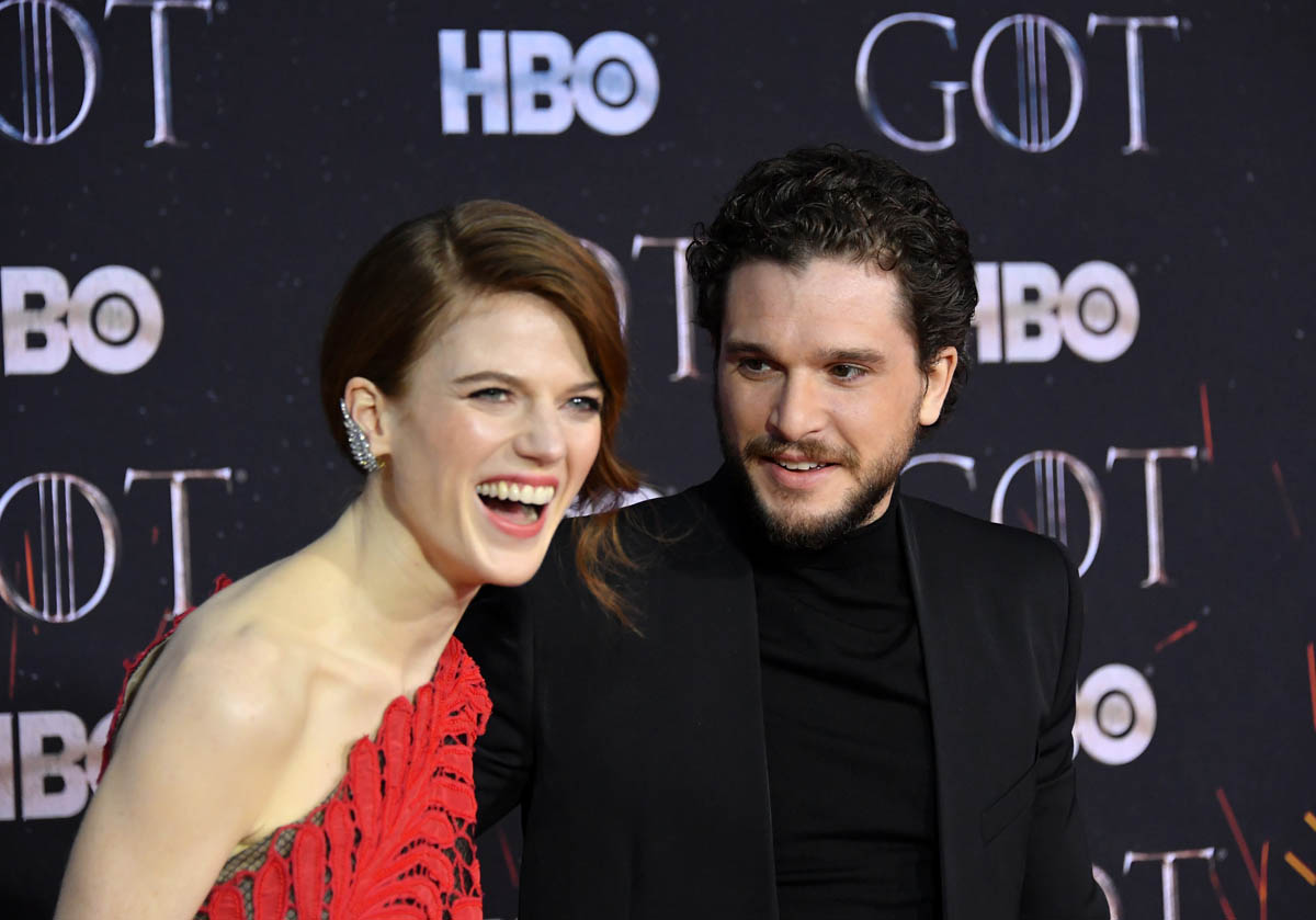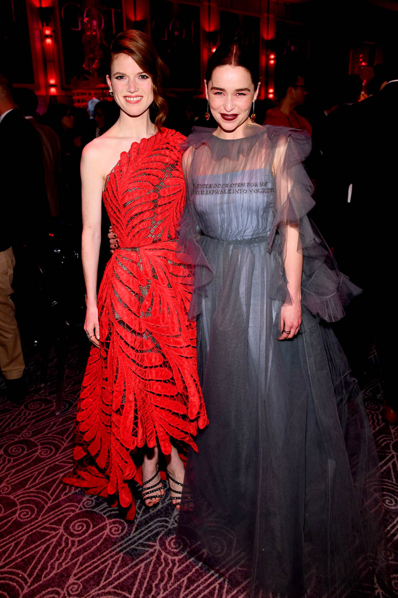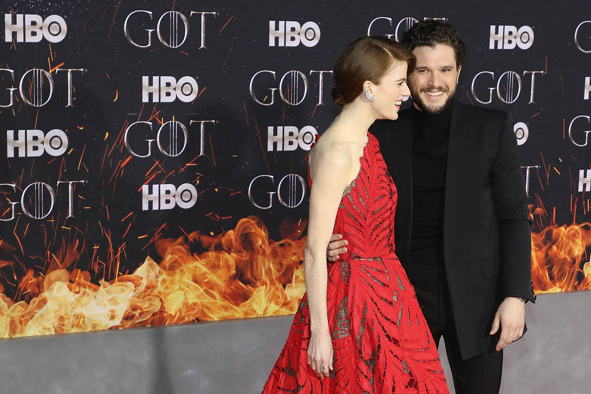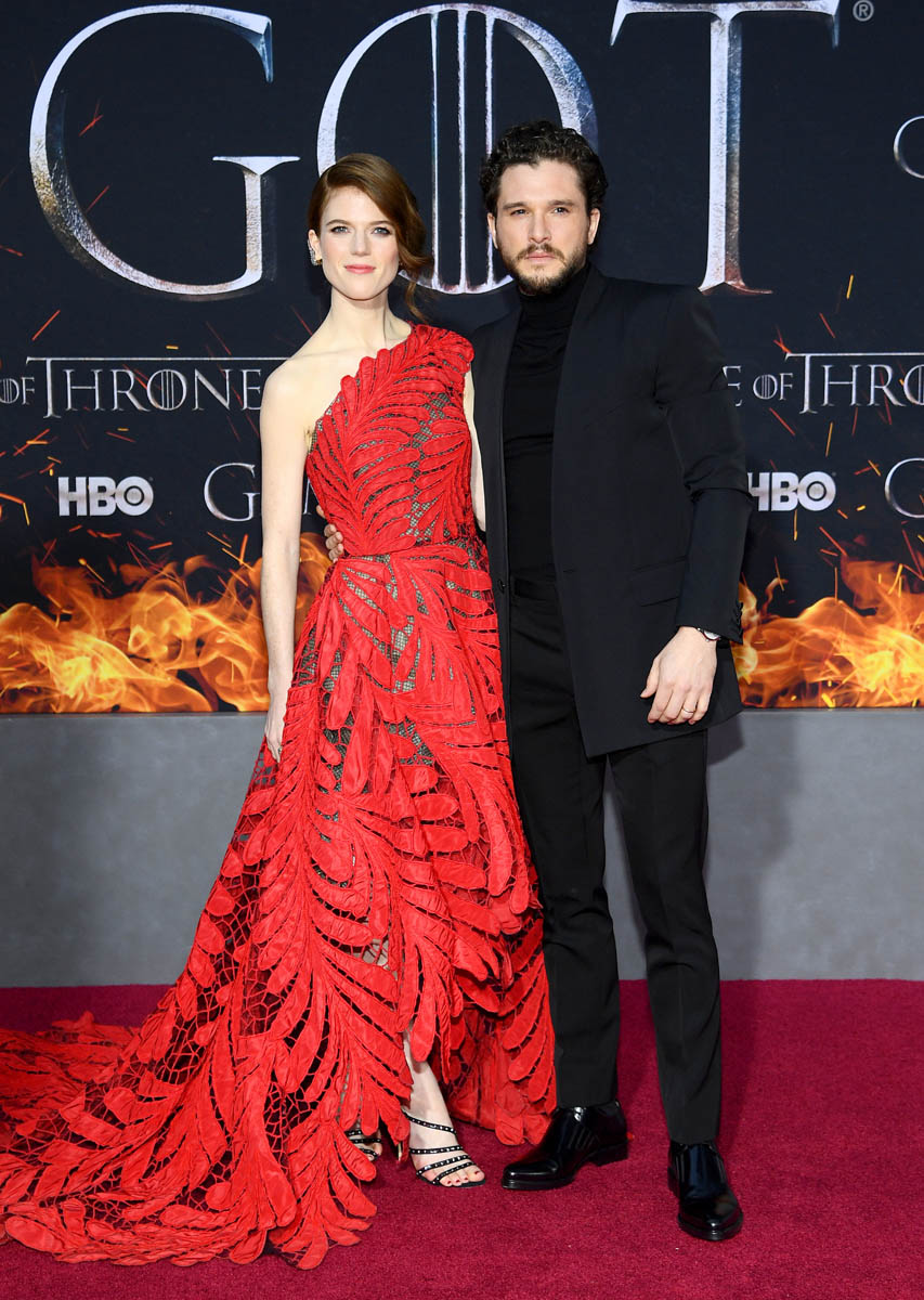 Last night was the last red carpet, the final premiere, which brought out those who remain and many who have fallen. We are separating the GoT event into several posts. For this one, let’s focus on a few of the most prominent main characters, starting with Jon Snow/Kit Harington who was joined by Ygritte/Rose Leslie in a f-cking spectacular red one-shoulder Oscar de la Renta dress, for their first GoT carpet since their marriage. Jon, as you know, is now in love with Daenerys. Jon, as you know, doesn’t know that he’s banging his aunt, the woman who’s grown some dragons but has also, steadily, been growing the vengeful, destructive urge that is characteristic of her House. How will this end? Are Jon and Dany the show’s OTP? Or… has his true love already died in his arms?