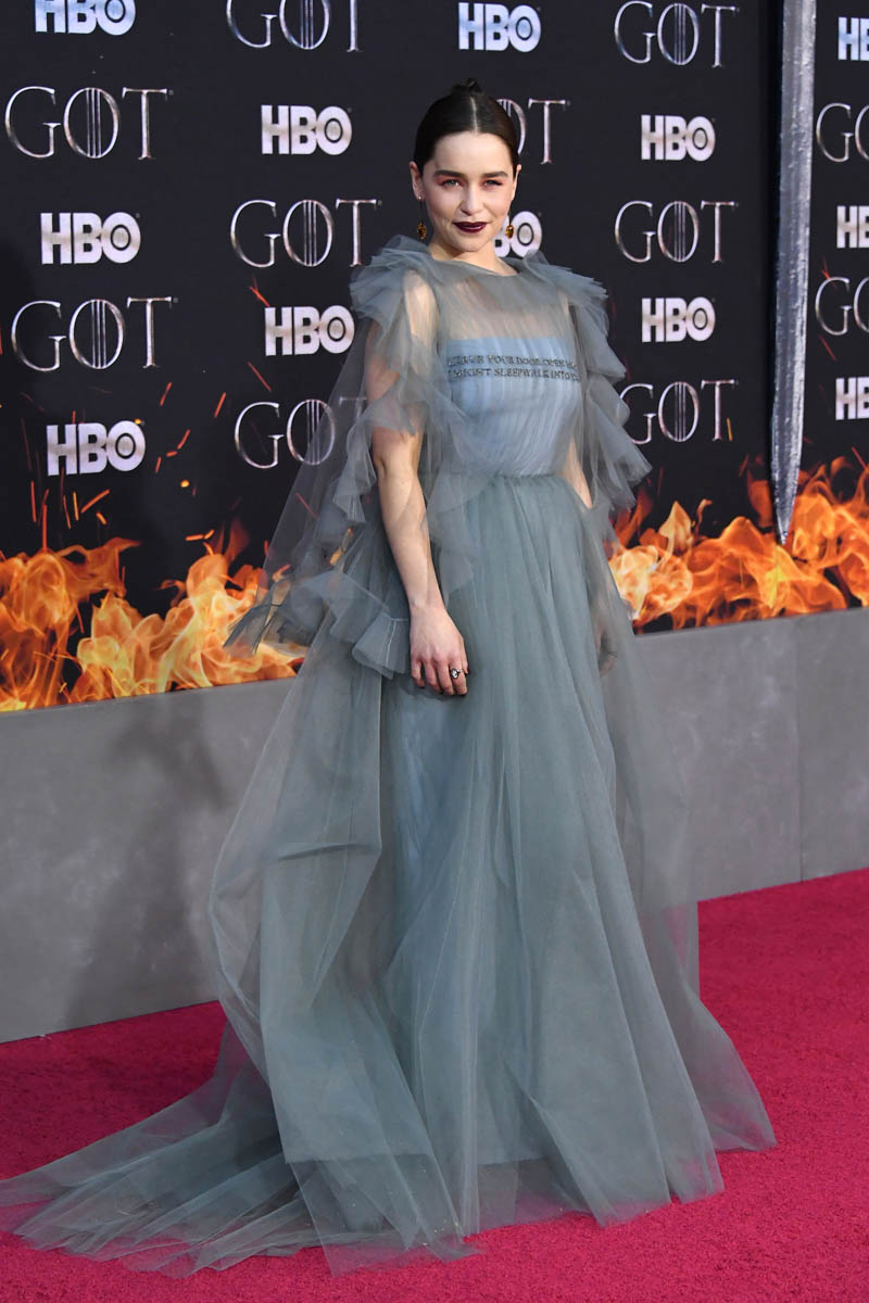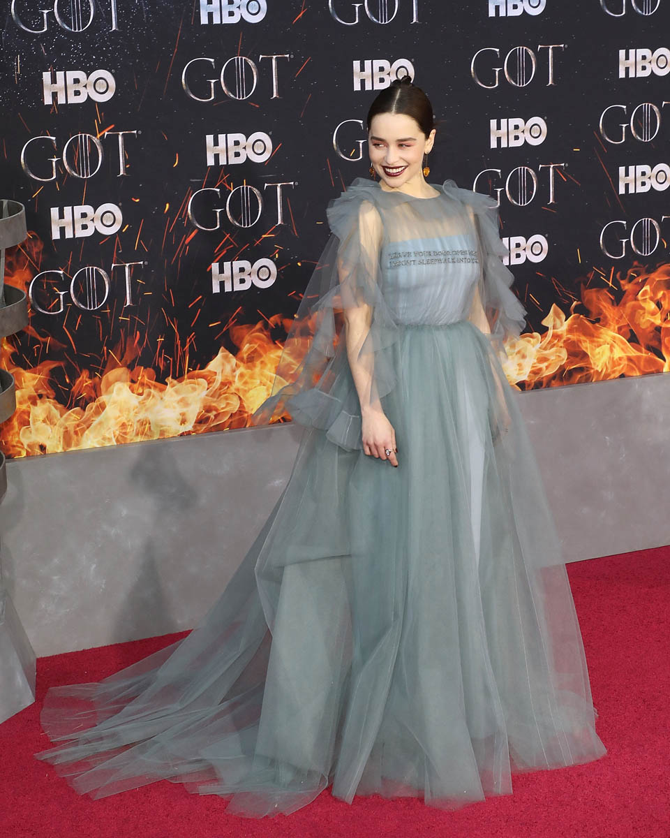 Anyway, not really feeling Emilia Clarke’s look last night. Hair and makeup? Into it. It’s the dress that’s kind of underwhelming although maybe we can take something away from that, like foreshadowing. Because the hair and makeup is fire and heat – dragons, Targaryen. The dress is ice and cool – Stark…or Night?