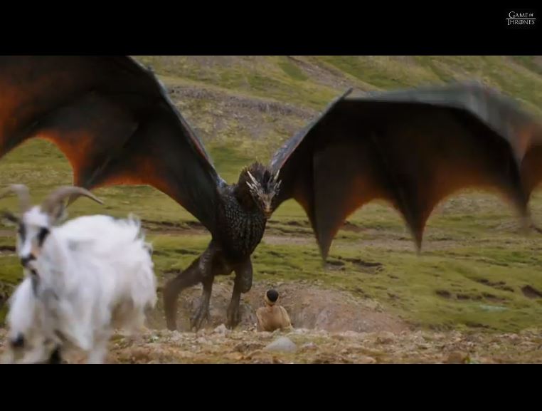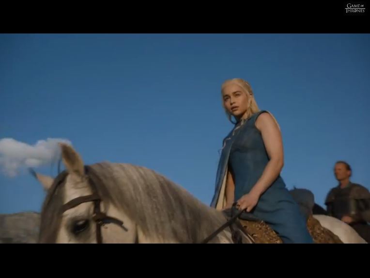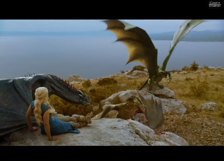 Oh yes, the Khaleesi’s dragons look enormous now, circling their mother, the mother of dragons, as she leans back wantonly on a cliff, overlooking that which she aims to conquer. Finally.