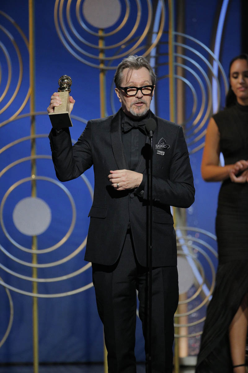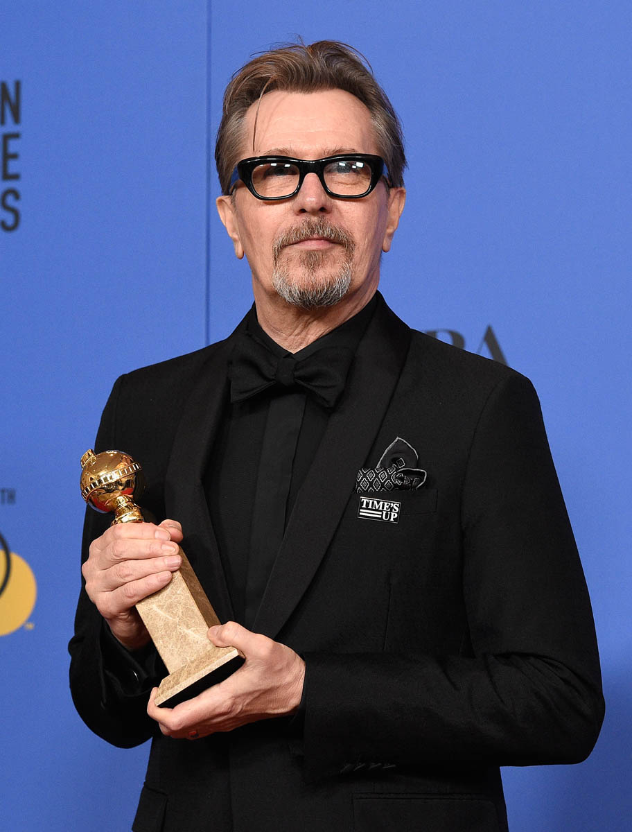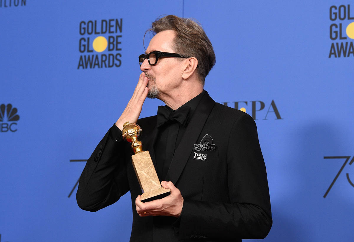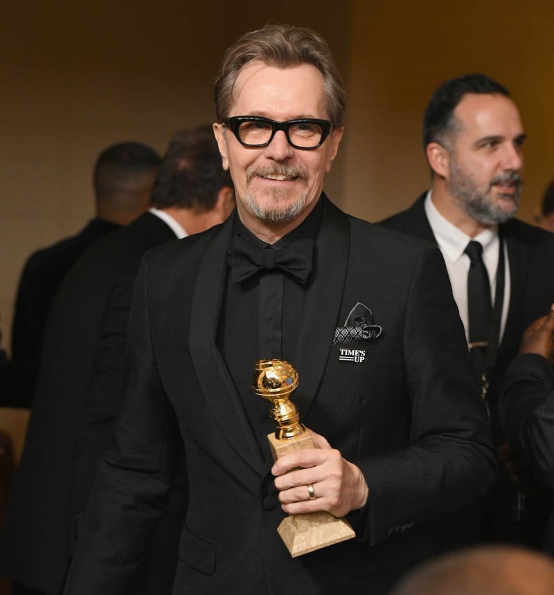Timing was on Casey Affleck’s side. Because six months later, The New York Times and The New Yorker blew open the Harvey Weinstein story and the Hollywood Predator Advent Calendar decided to show its ass every single day. And now we have another Best Actor Oscar frontrunner with some sh-t on his card. (Two, actually, but we’ll get to James Franco later.) Gary Oldman won the Golden Globe for Best Actor in a Drama last night for his performance as Winston Churchill in Darkest Hour. Gary wants this bad. Gary is hustling. Gary is playing the game. And Gary is not unpopular in Hollywood. In 2012 at the Palm Springs Film Festival, I watched Jessica Chastain fall to pieces when she met him, her favourite actor. Here’s what Hugh Jackman tweeted a few days ago: