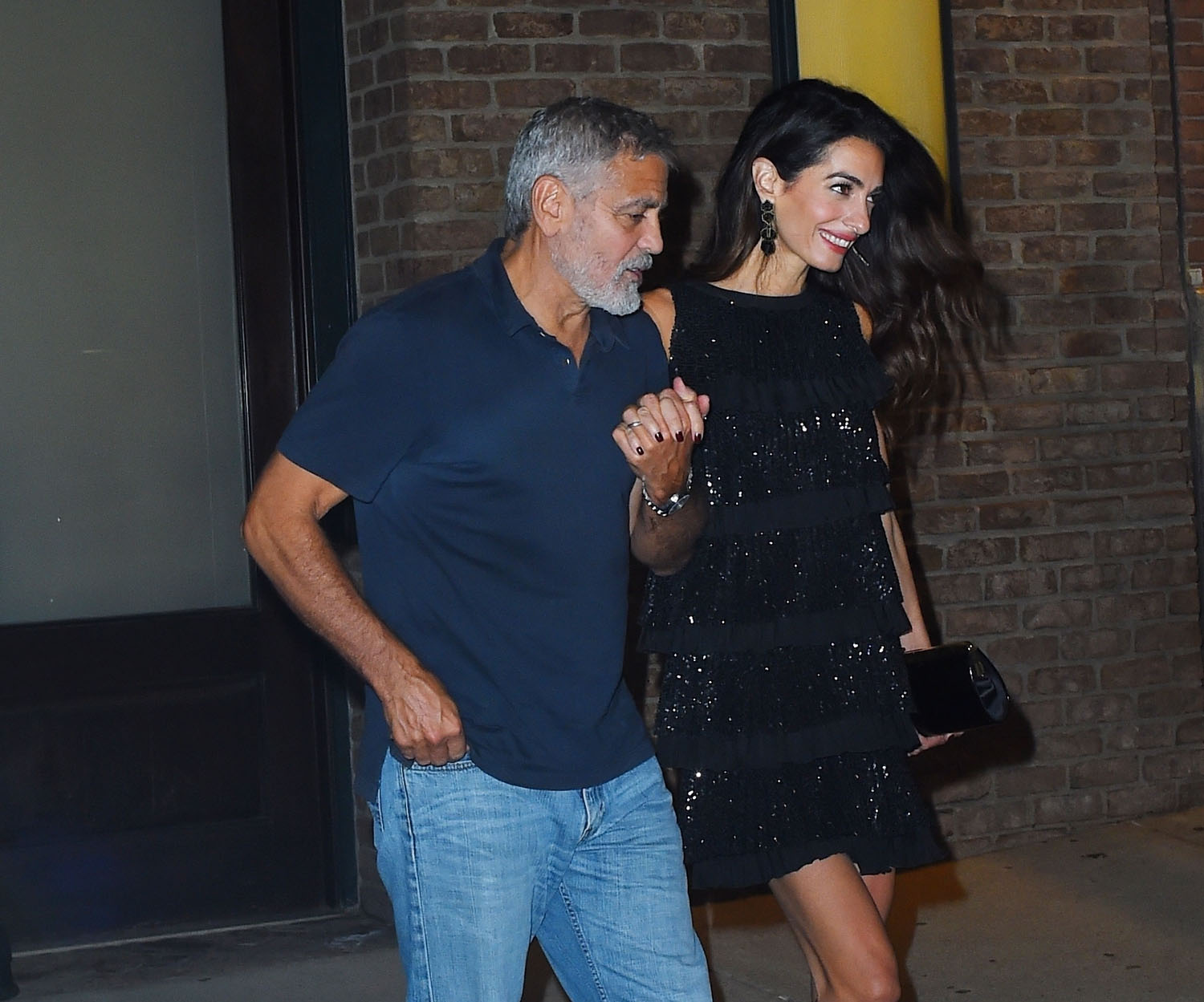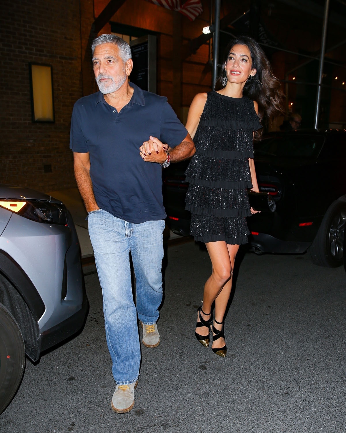 Renowned human rights barrister Amal Clooney stepped out for dinner in New York City last night, accompanied by her husband, George. OF COURSE, they’re this couple, where she’s all dressed up and his vibe is “you’re lucky I’m not wearing flip-flops”. It’s been a relatively busy month for the Clooneys, with the premiere of Ticket to Paradise a couple weeks ago in London. Strangely, that movie doesn’t come out till October 21 in the North America. It just seems like a really long time. Why the holdup? And there’s been a drought of major films in theaters since mid-August, that would have been the perfect time to drop a George Clooney-Julia Roberts rom-com. Instead, Paradise will come out in the middle of the awards season crunch. Bad planning, Bob.