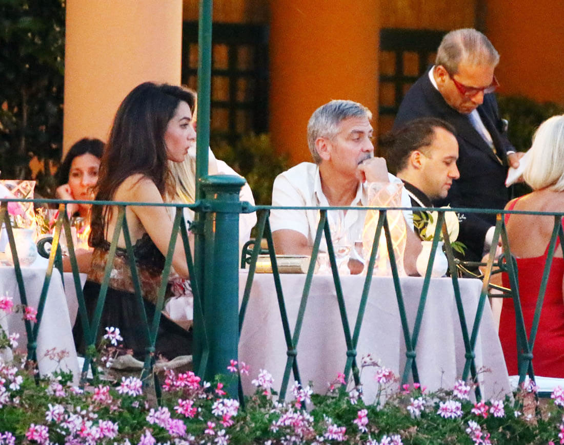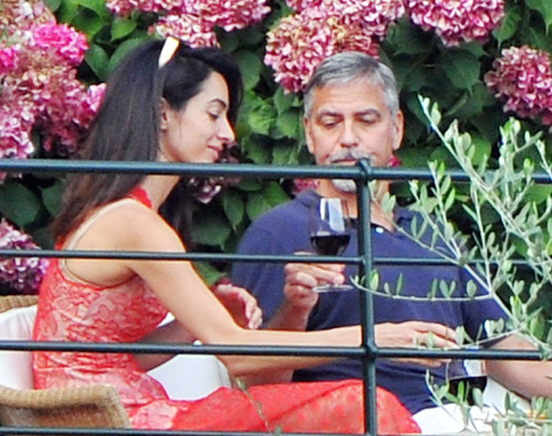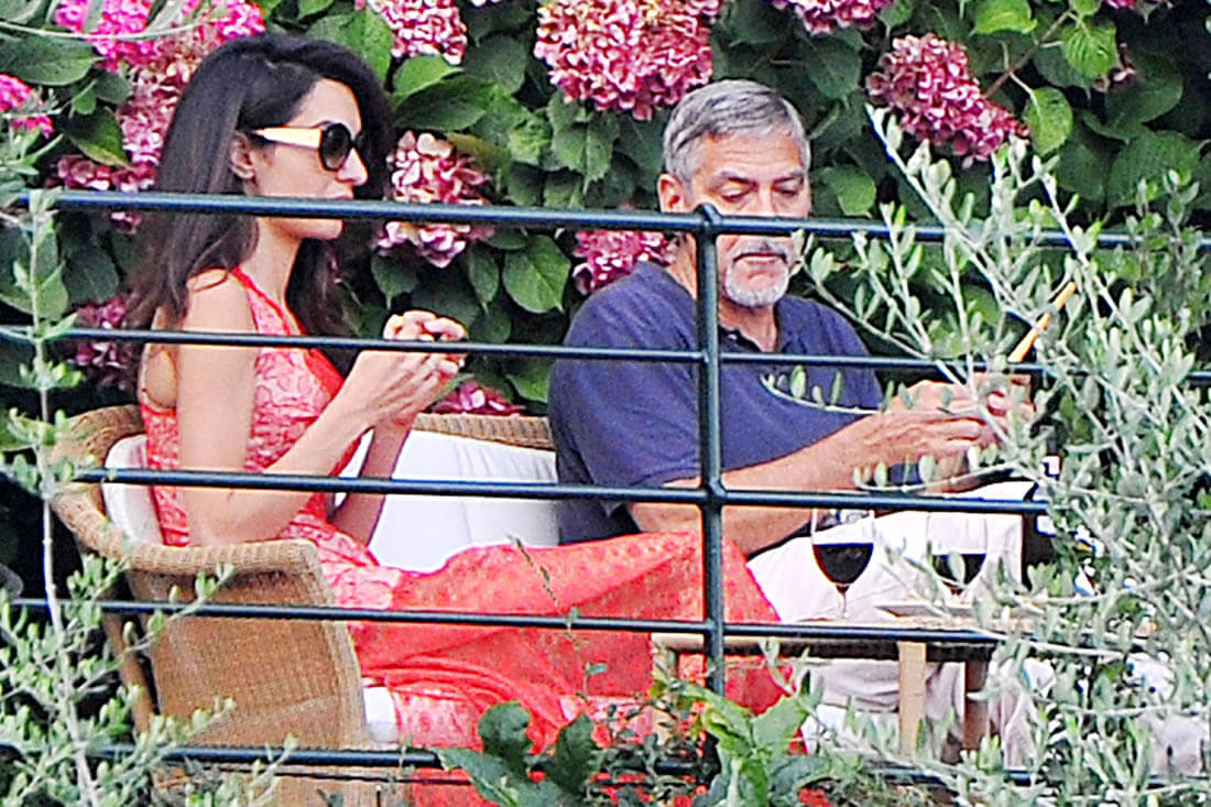 George Clooney summers in Italy. Not just Lake Como where he has a villa and spends a lot of his time, but he’s known to hop around, his fondness for the country demonstrated by the fact that he chose to get married there. And here they are, the Clooneys, Amal and George, on Sunday in Portofino having dinner. A romantic dinner. As always, Amal is DRESSED.