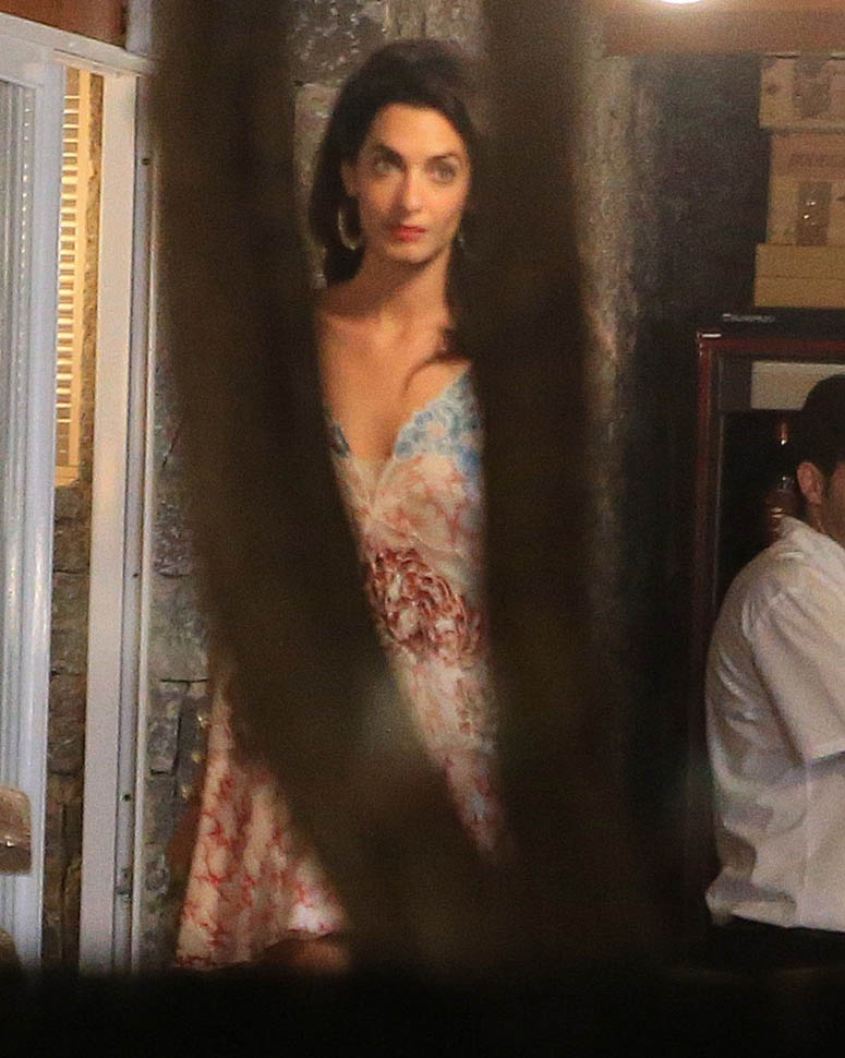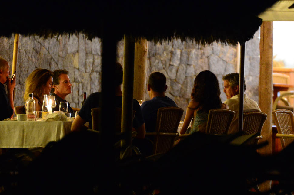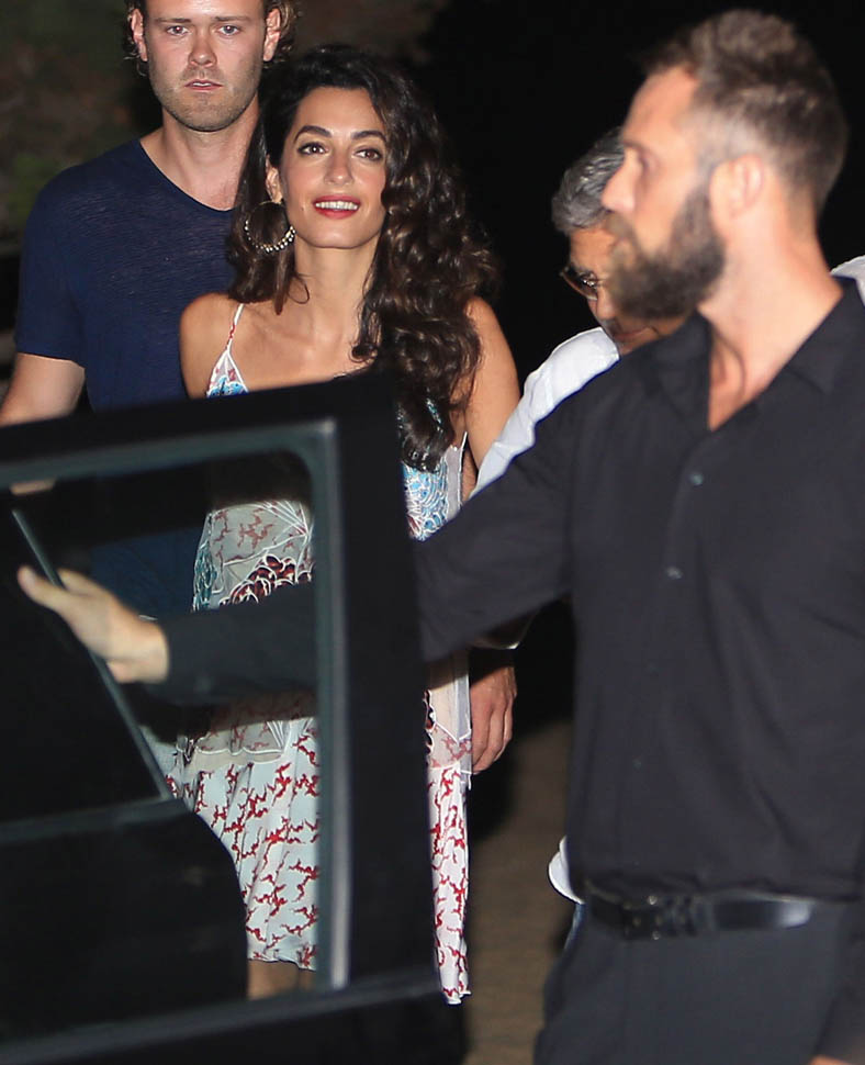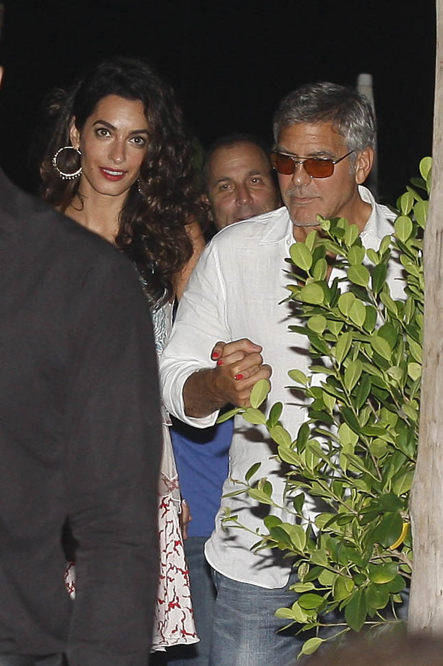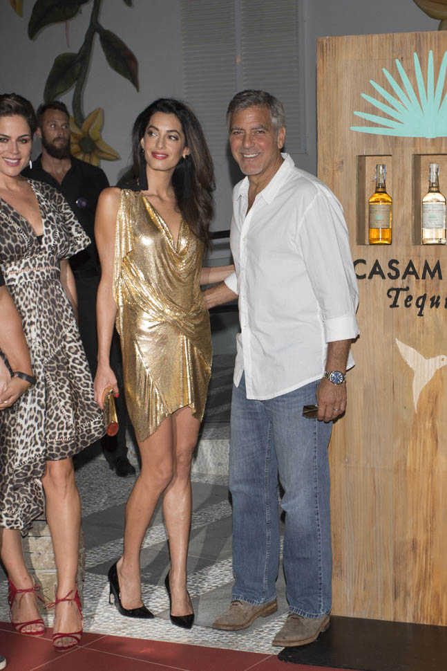 On Saturday night, Amal, George, Cindy, and Rande went out for dinner. Amal decided not to go with a blowout and wore her hair much wavier than we’ve ever seen it, in a really cute Stella McCartney dress. Then, on Sunday, she went gold disco for club night. You think there was foam? I would f-cking love to see George Clooney at a foam party. Instead I’m seeing pictures of him nuzzling noses with his wife with a photographer 3 feet away. Well, George Clooney knows what makes a great photo opportunity. And Casamigos needs every club in Ibiza to be ordering their brand by the boatload. This is why I’m not sure about those rumours about him running for office. Unless of course he’s using booze to raise money for a political campaign. Totally Boardwalk Empire.