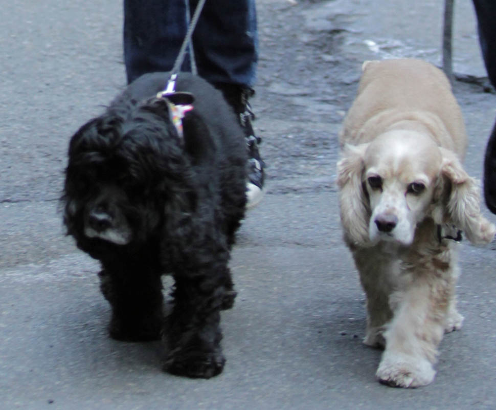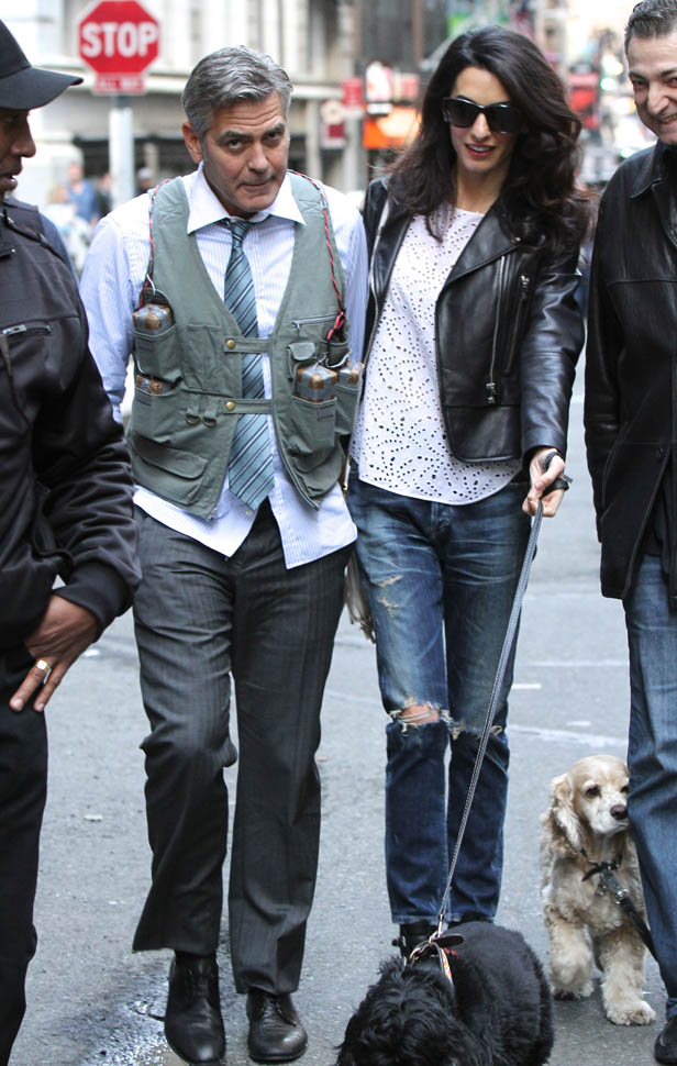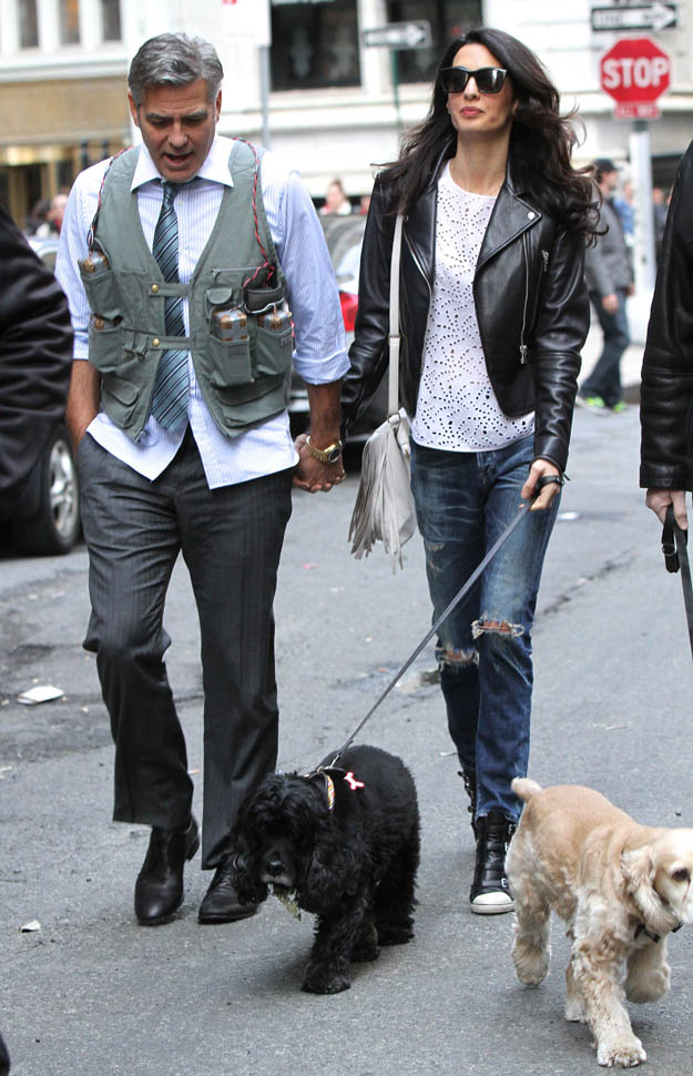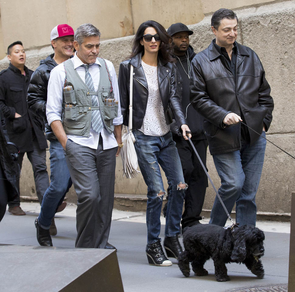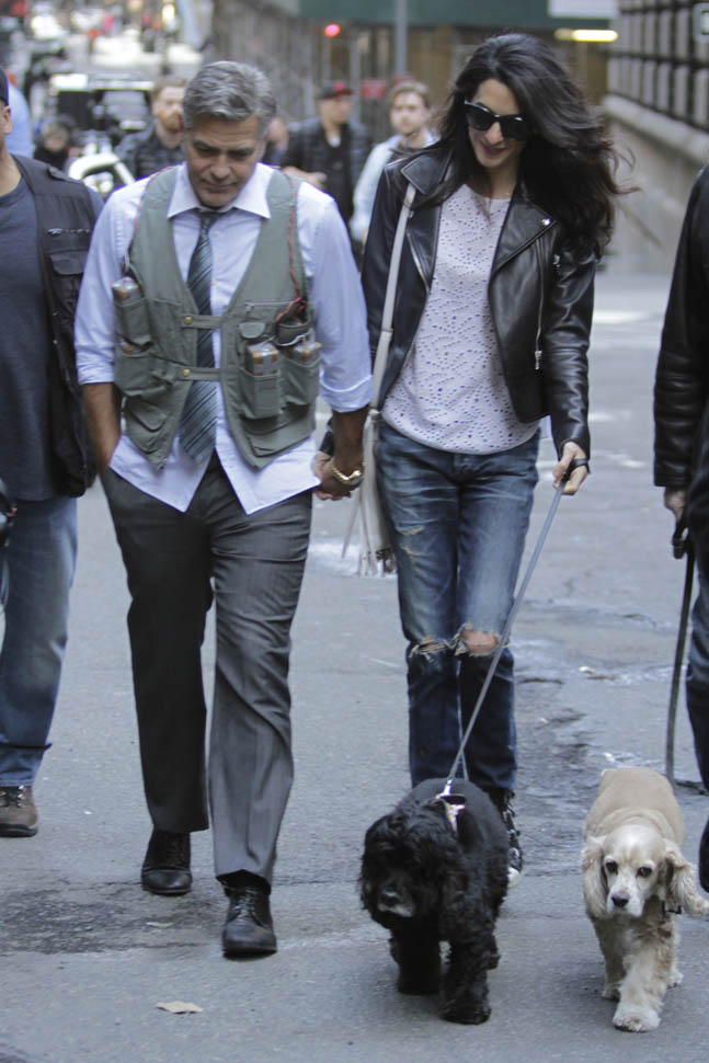 George has talked often about Einstein, the black cocker spaniel, in interviews. As you can see, Einstein has a sibling now. They’re saying the blonde spaniel was a wedding gift from Amal. So the entire family has relocated temporarily to NYC for the duration of production. That’s probably the only way I can relate to the Clooneys. We too have two dogs. And they go everywhere. They are the children. They are more than enough.