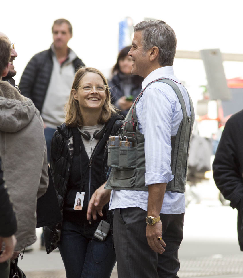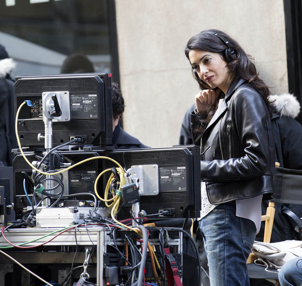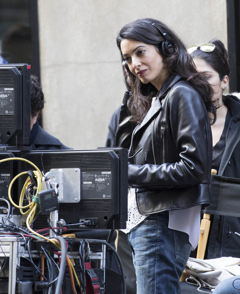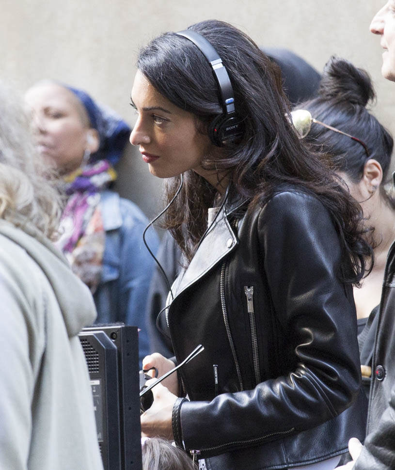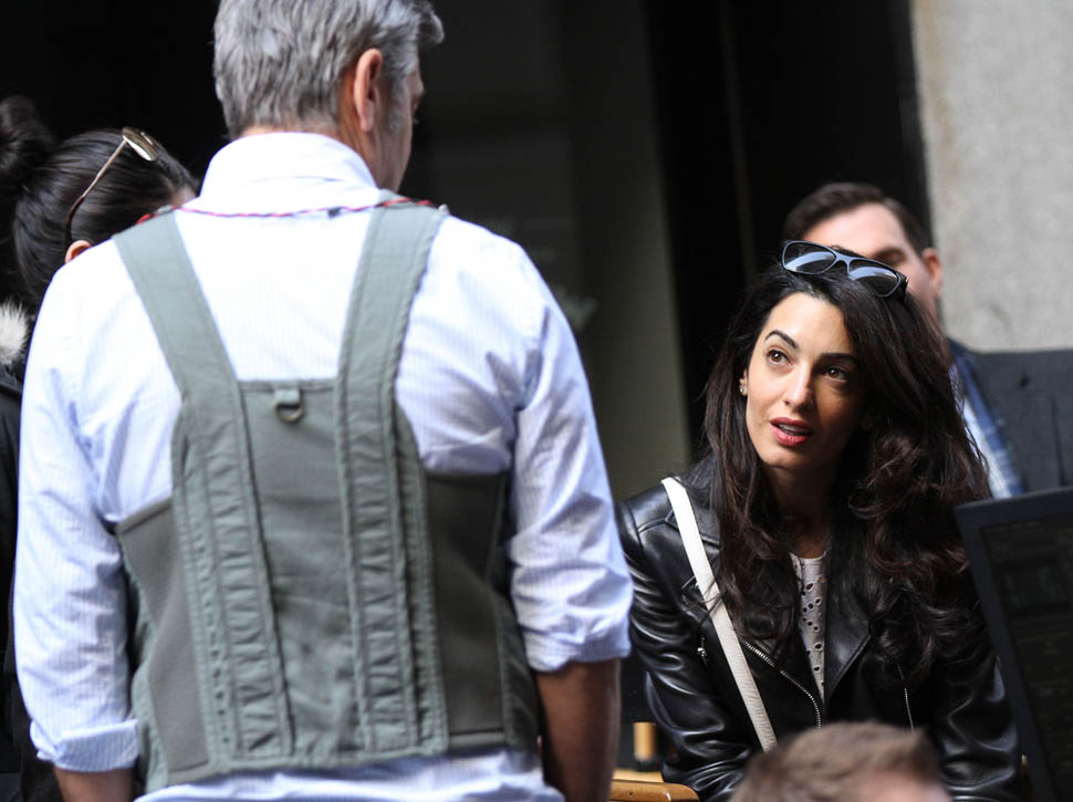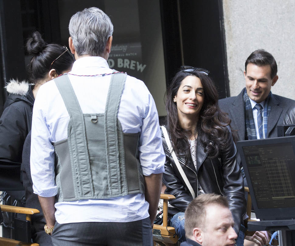 It was a working weekend for George Clooney as he continues to shoot Jodie Foster’s Money Monster in New York. On Sunday they were all outside. So Amal stopped by to visit with the dogs. Dogs?
