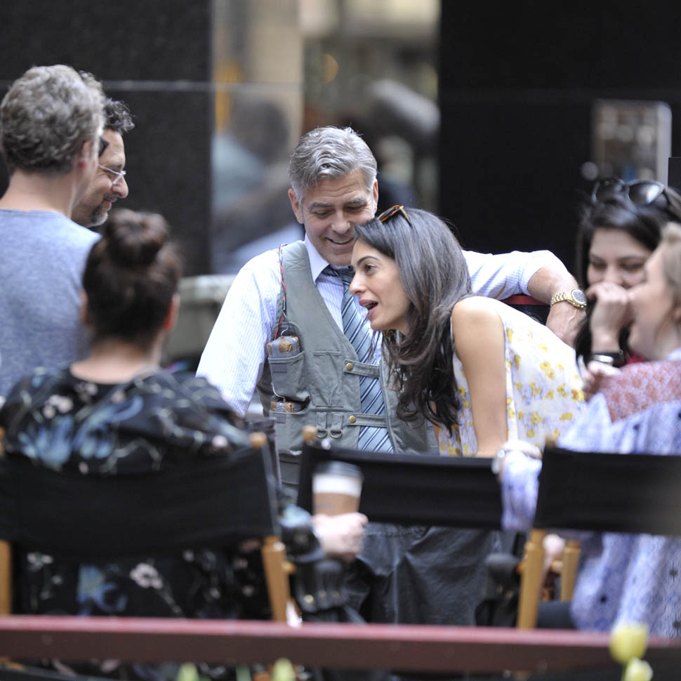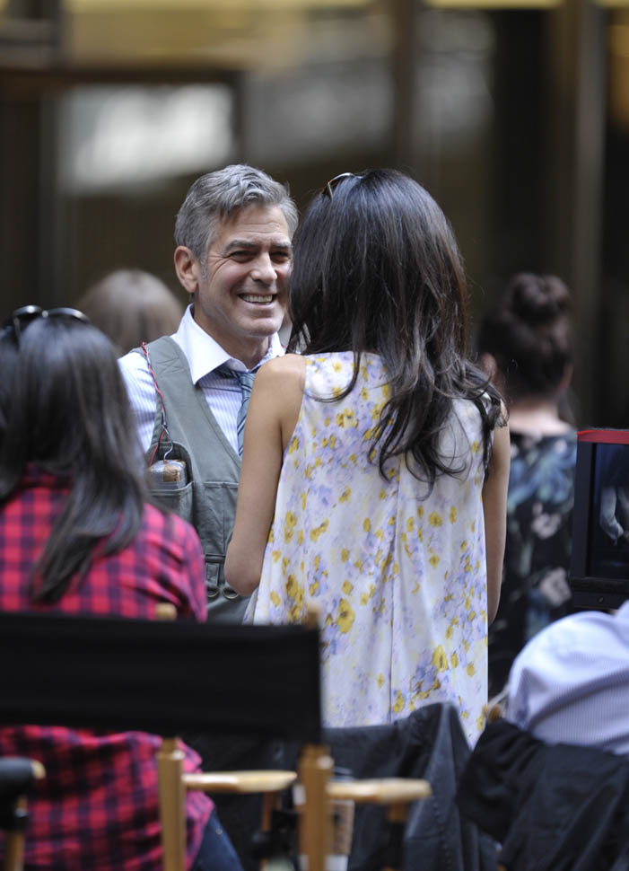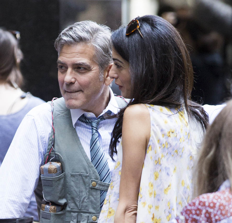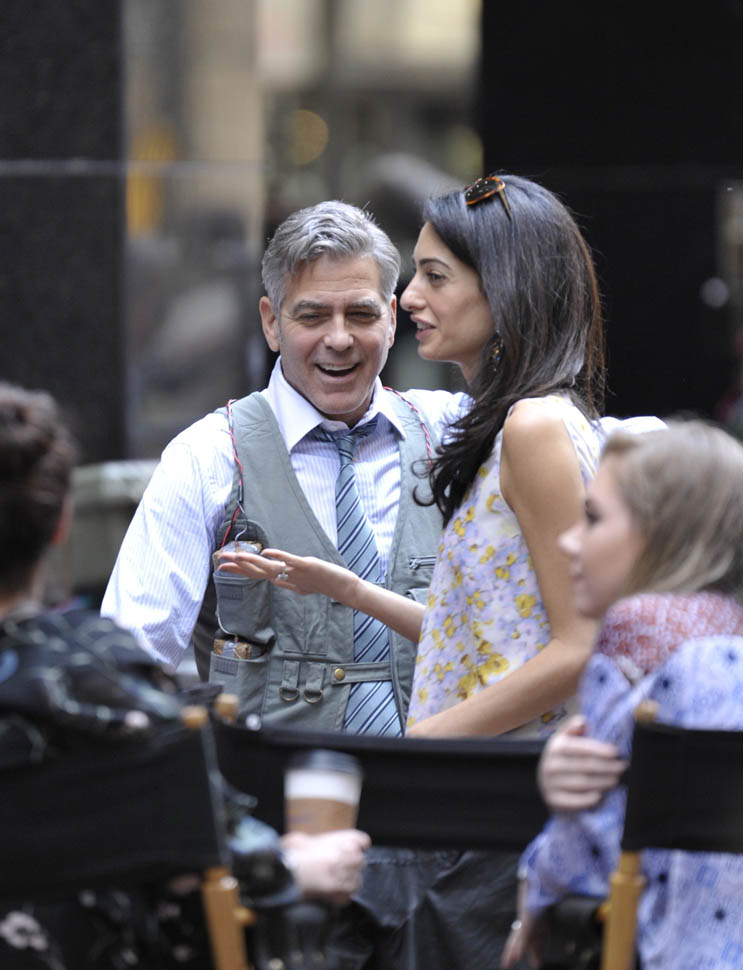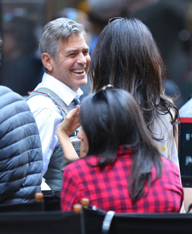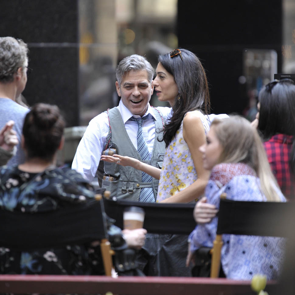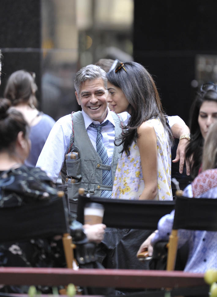 George Clooney was at work again this past weekend on Money Monster in New York. And Amal came to visit again. And something must have been really funny because there were big laughs and, as you can see from George’s various facial expressions, they’re still honeymooning because I don’t think he’s ever found a woman so interesting. At least not when the cameras are around.