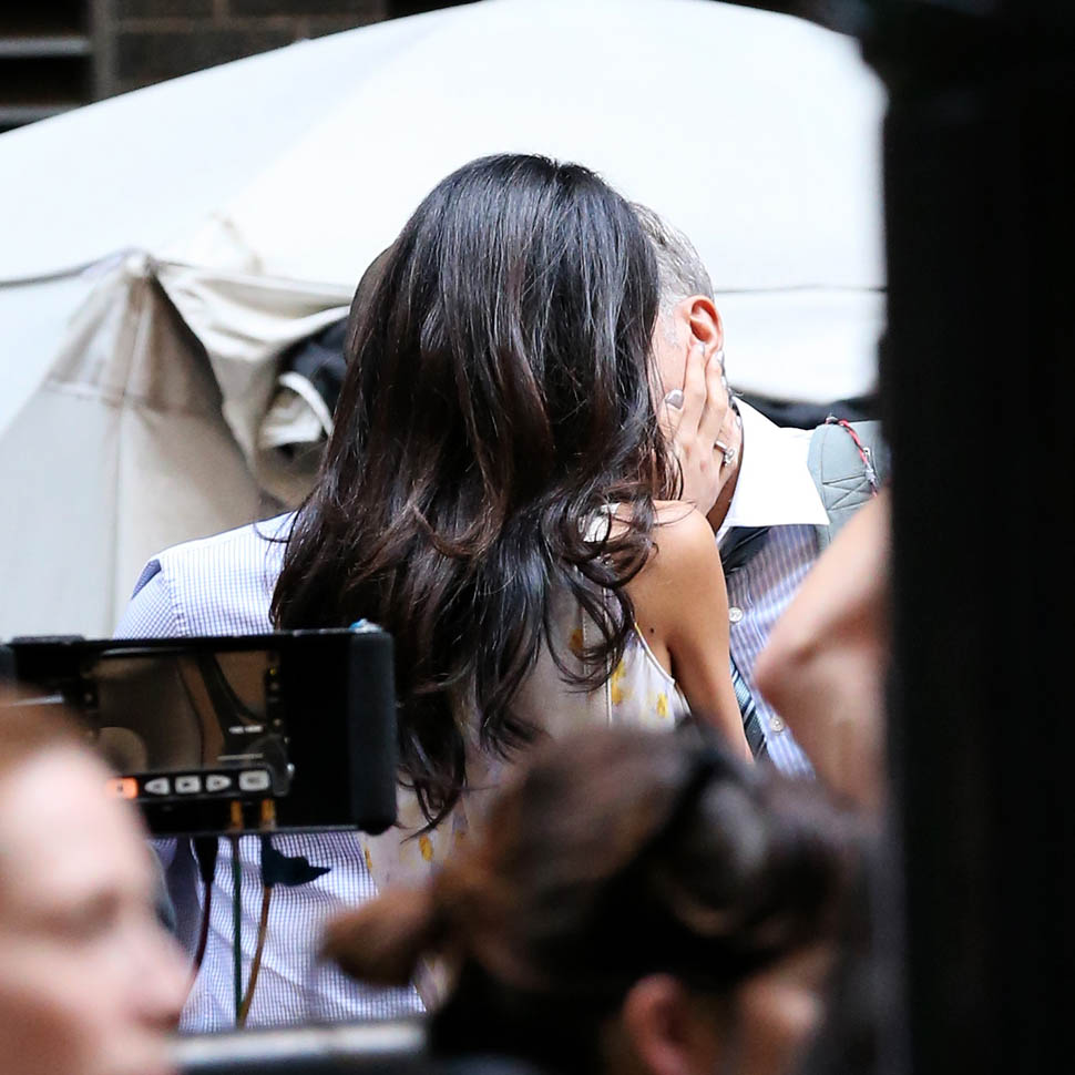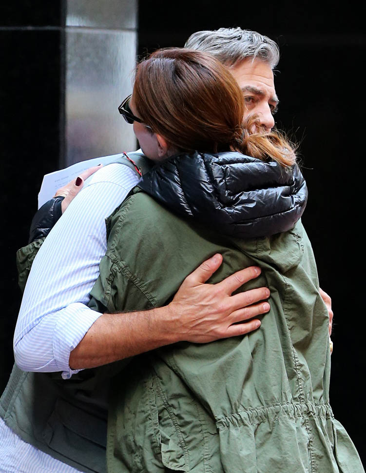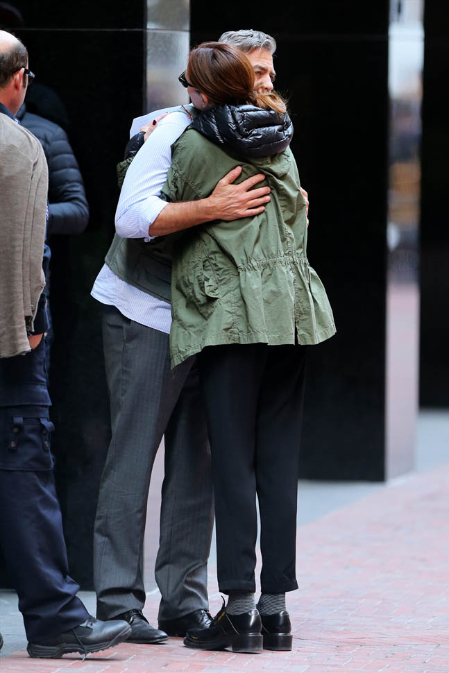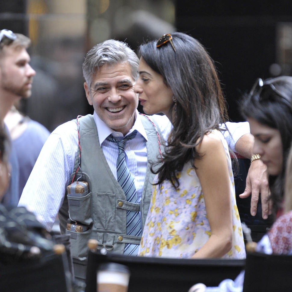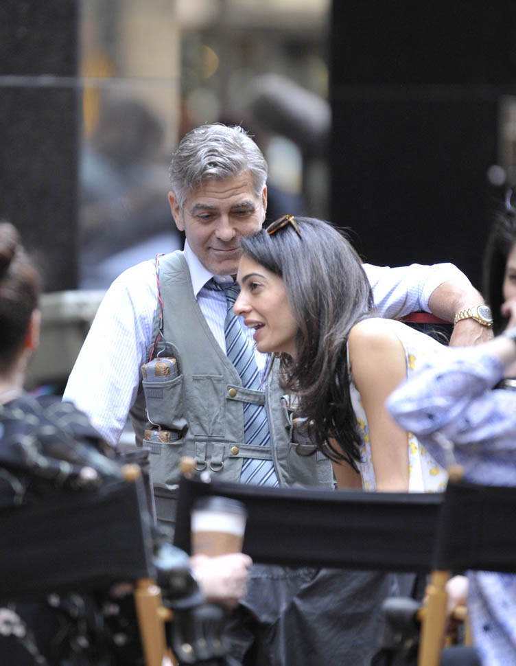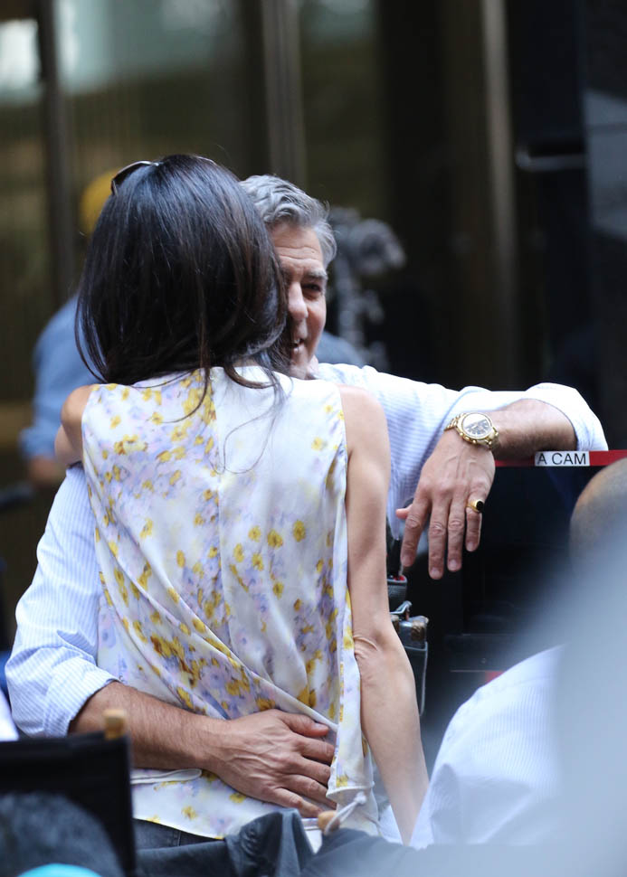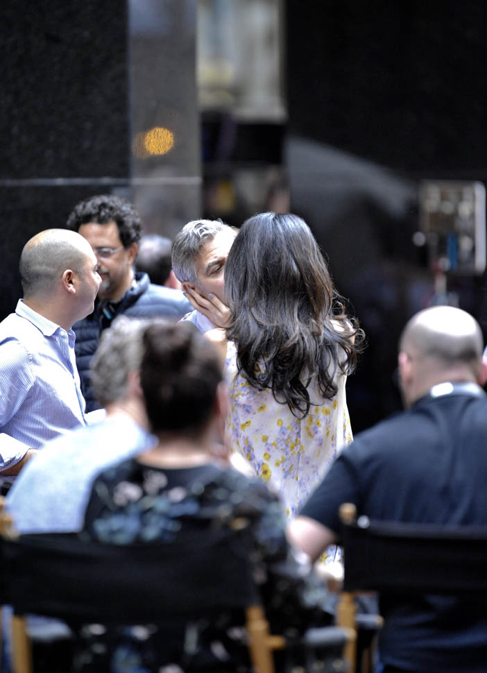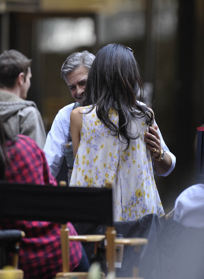 George Clooney was at work again this past weekend on Money Monster in New York. And Amal came to visit again. And something must have been really funny because there were big laughs and, as you can see from George’s various facial expressions, they’re still honeymooning because I don’t think he’s ever found a woman so interesting. At least not when the cameras are around.