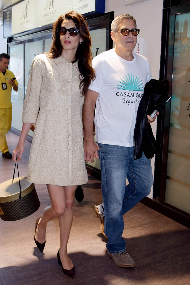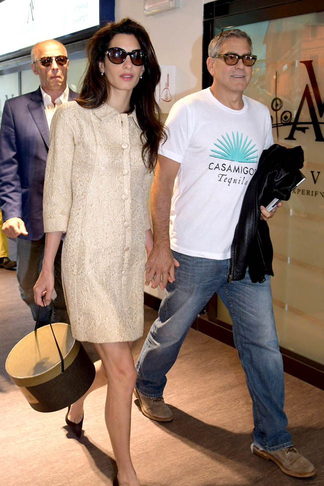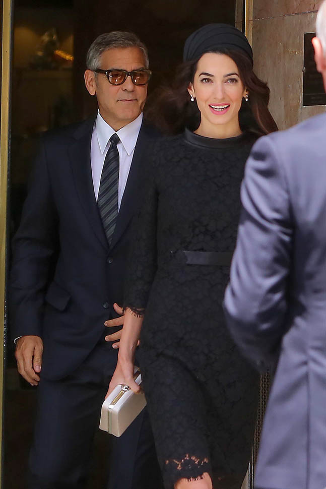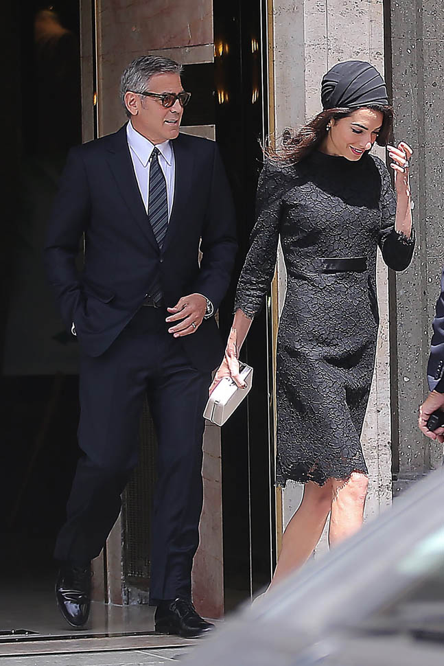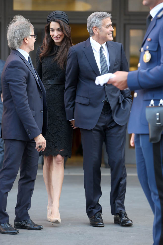 During their stay in Rome, the Clooneys went out for dinner a few times, Amal in various outfits. My favourite, I think, is the diagonal striped dress with one shoulder slipping off. The pillbox turban for their meeting with the Pope is pretty spectacular though. That’s how you see it too, right? With more angles than a turban but not quite the structure of a pillbox. And definitely reminiscent of Mrs Jackie Kennedy? Or just me?