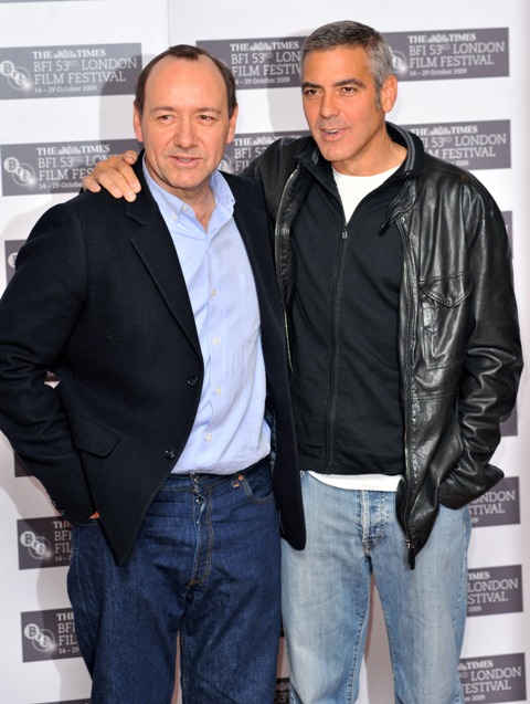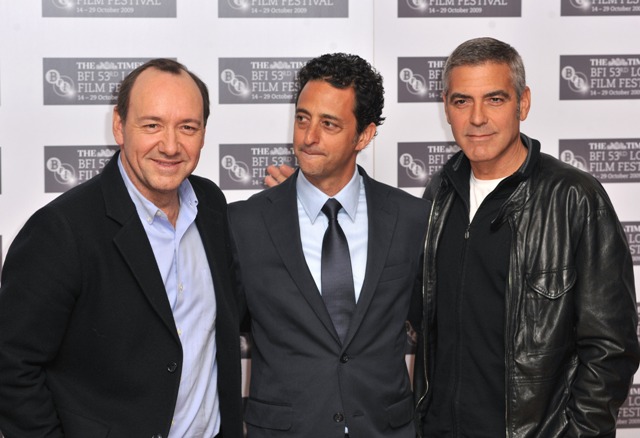 Anyway, another day, another film. Today in London, George was at a press event for The Men Who Stare At Goats due for release early next month. Here he is with Kevin Spacey – George is too old for him – and Grant Heslov looking rather fresh for a man who was out and up all night. Eli’s juice is a tonic.