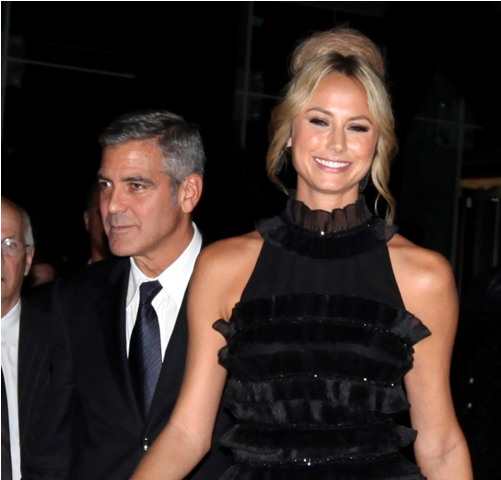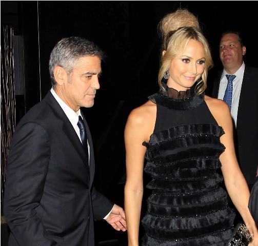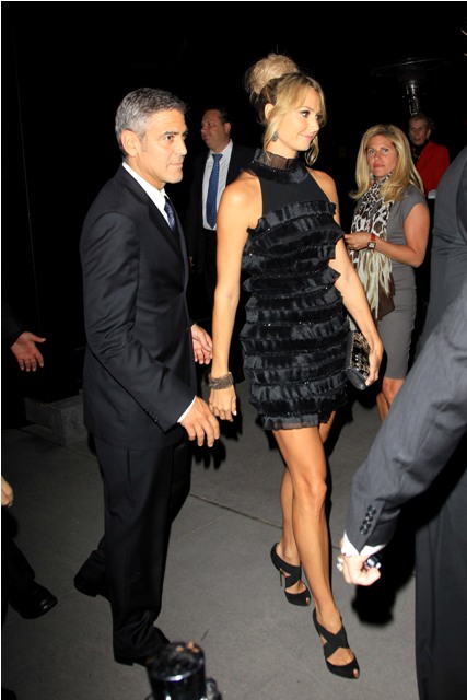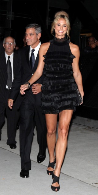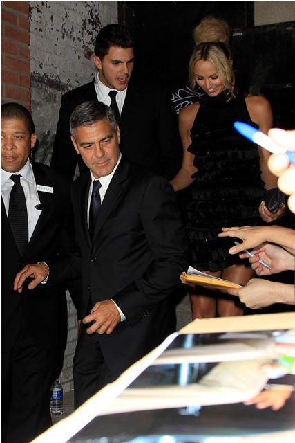 Anyway, I'm jumping all over the place. Sorry. There's just so much. Let me start at the beginning. They arrived with Bono. George and Bono talked, just the two of them, for at least 30 mins. Stacy sat behind them, not pouting, not bored, not fidgety but hanging out with friends, or employees. I'm not sure. It did cross my mind whether or not that's pre-arranged. That he has someone or more than one to be part of the entourage specifically assigned to his escort so that she never appears to have nothing to do when he's tied up in his own conversations. Whatever it is, she made it work for her. That girl is animated, always smiling, laughs a lot, seemingly very self-assured, not needy at all, never pulling on his coat for attention, never once appearing to be out of place. She really, really looked like she belonged. In spirit if not in style. Ew. The hair. I STILL DON’T UNDERSTAND IT.