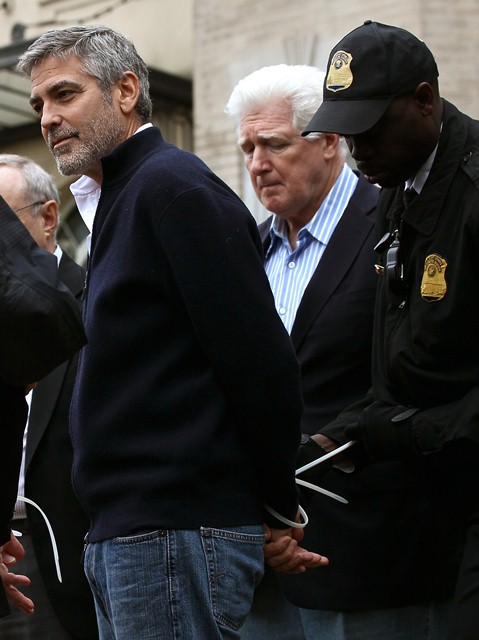The two Clooneys, Jim Moran (Virginia), and NAACP President Ben Jealous were asked three times to not cross the police line outside the embassy. They were then arrested for civil disobedience.