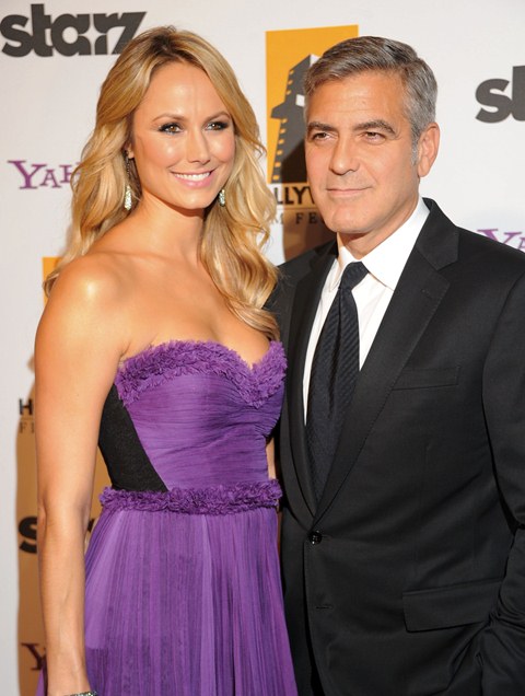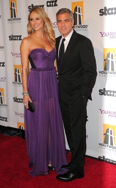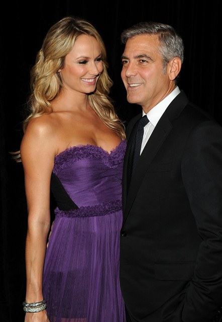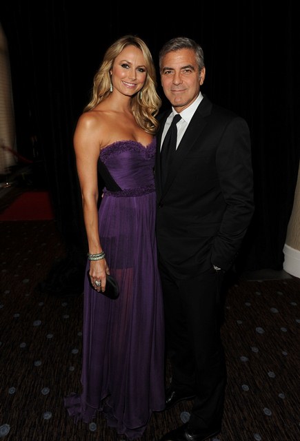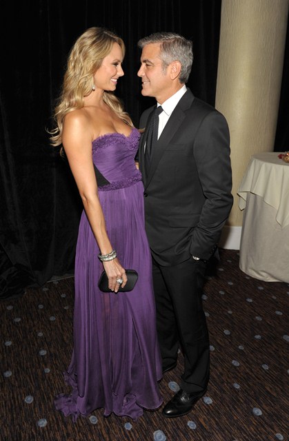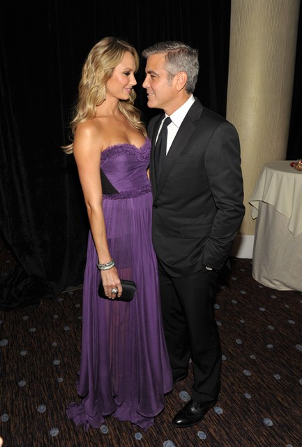 George Clooney is GREAT at this, see? All by himself. And yet... he doesn’t want to be by himself. This season he’s decided he won’t be by himself with Stacy Keibler who, quite obviously, is now expected at every stop on the campaign circuit until they get to the Kodak Theatre in February. Stacy, who was able to show some restraint early on in their arrangement, can’t seem to contain herself anymore on Twitter, tweeting last night she was wearing purple at the Hollywood Film Awards to support her Baltimore Ravens and gushing about meeting Mary Steenburgen and Ted Danson. Would you be invited if not for your boyfriend?
