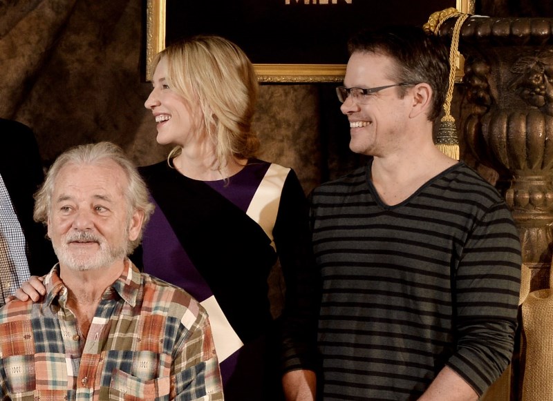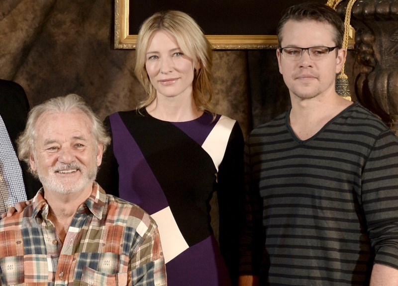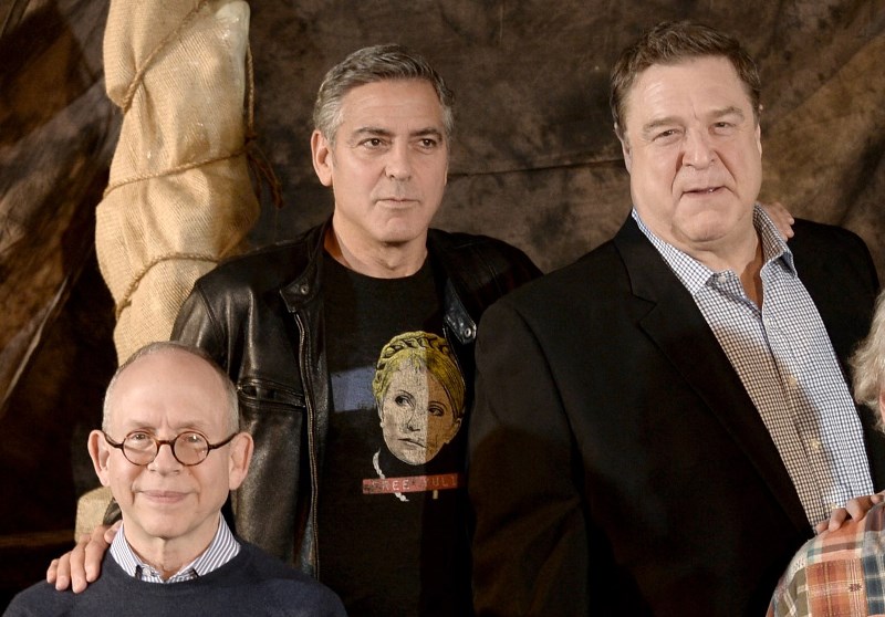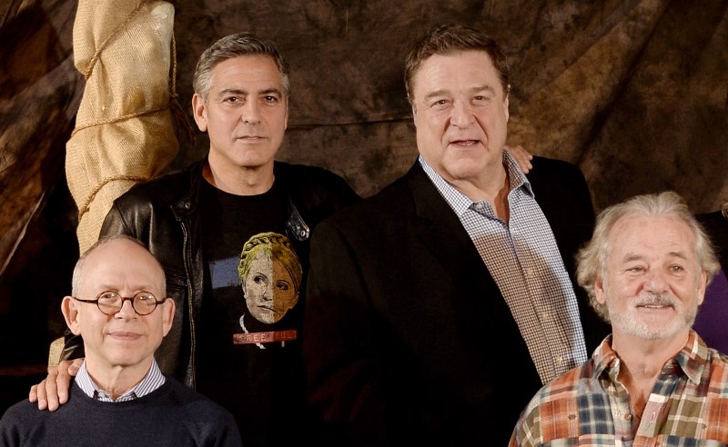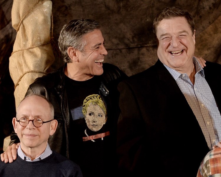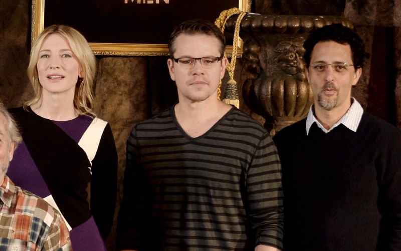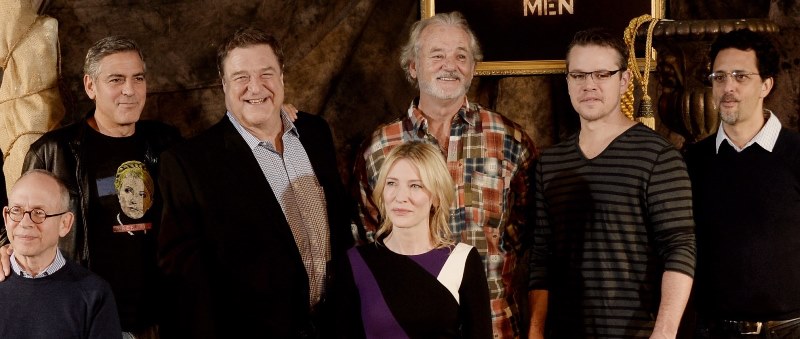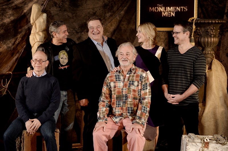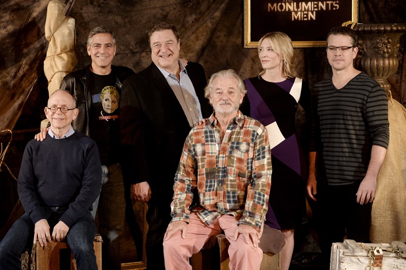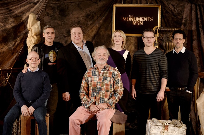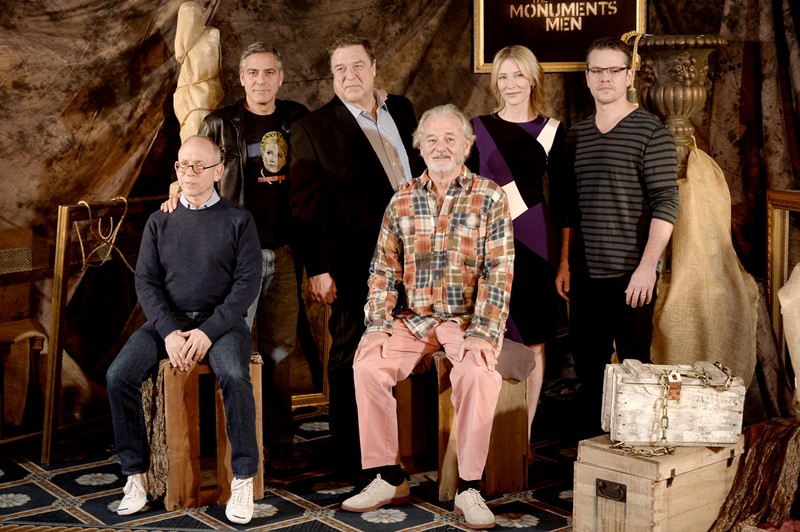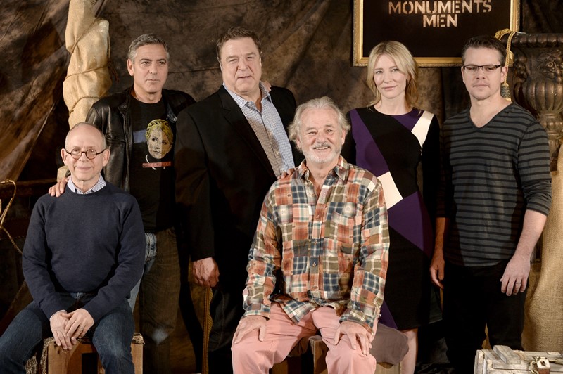 Portrait session for The Monuments Men yesterday. George Clooney put a political message on under a leather jacket. But he’s been overshadowed. By Cate Blanchett? No. Not even Cate Blanchett.