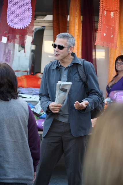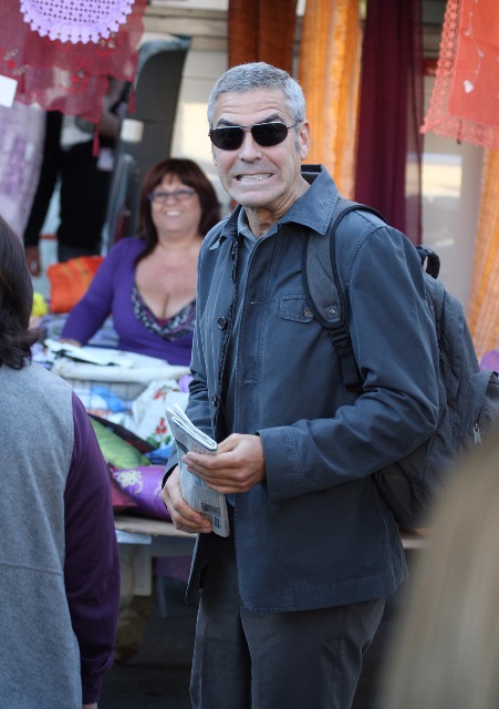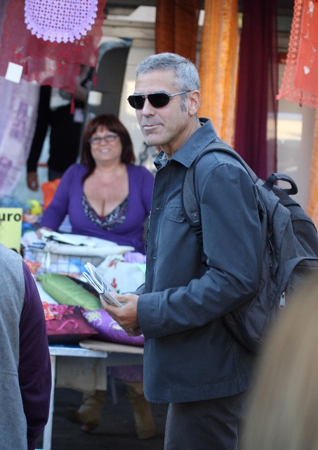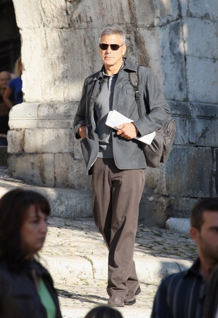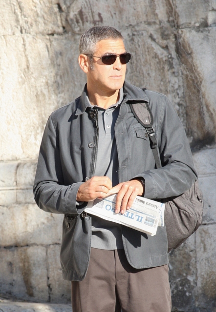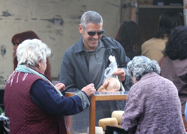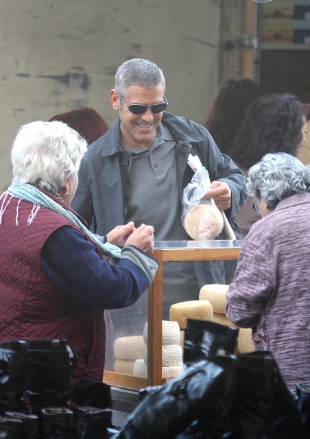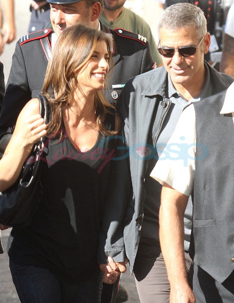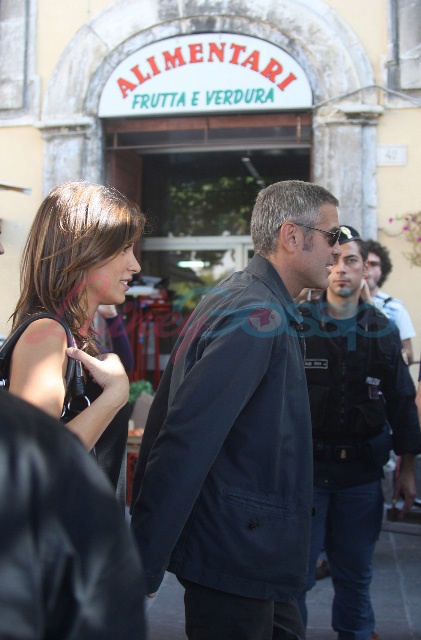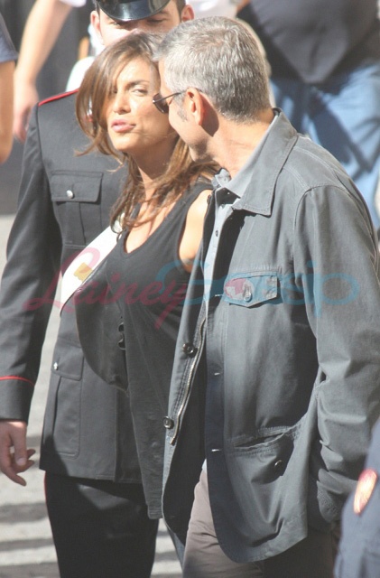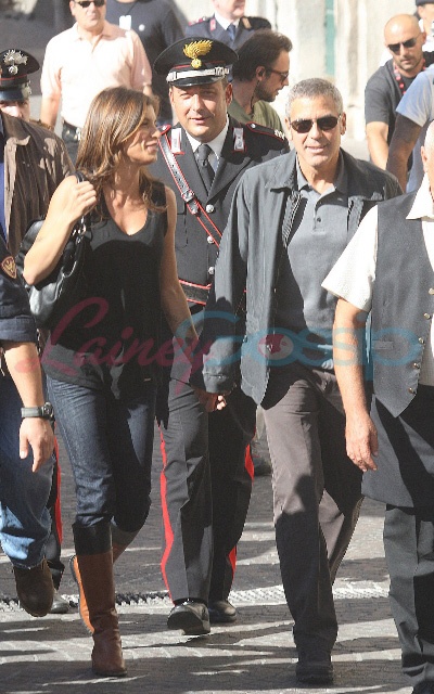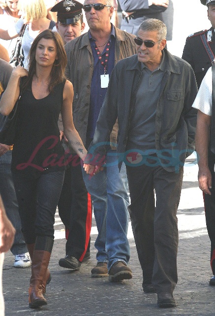 Sulmona, Italy. George Clooney continues to shoot The American. And it’s convenient too because, as you know, Elisabetta Canalis is Italian, and she’s become a fixture now, sighted on set with him, hand in hand, even though he knows the paps are around, in between scenes.