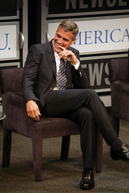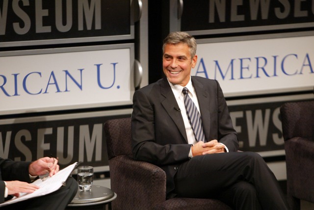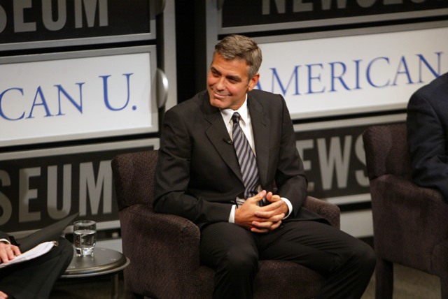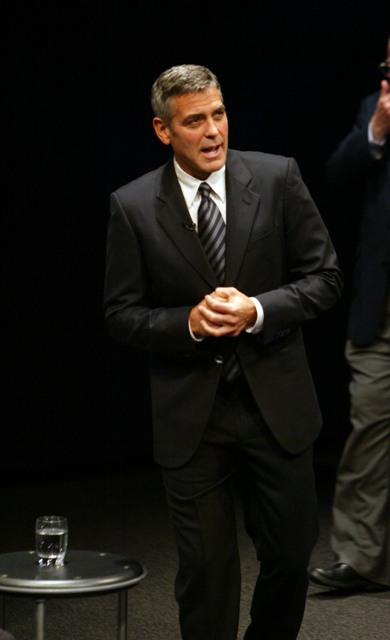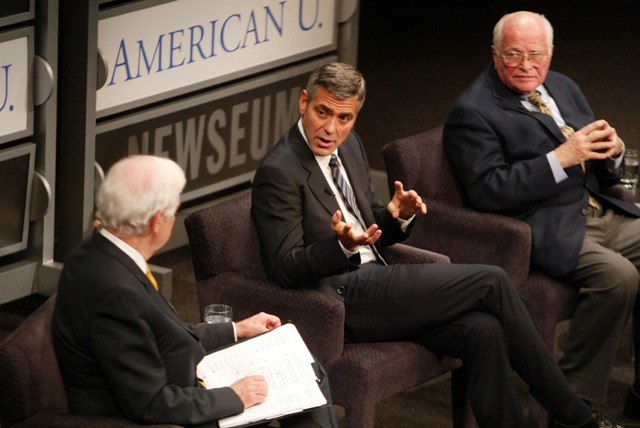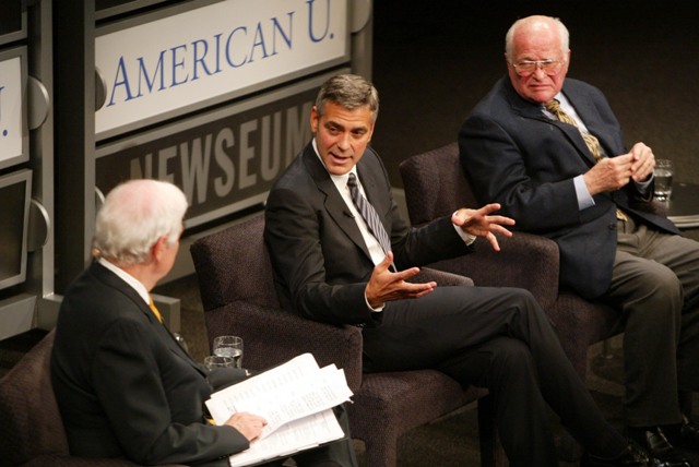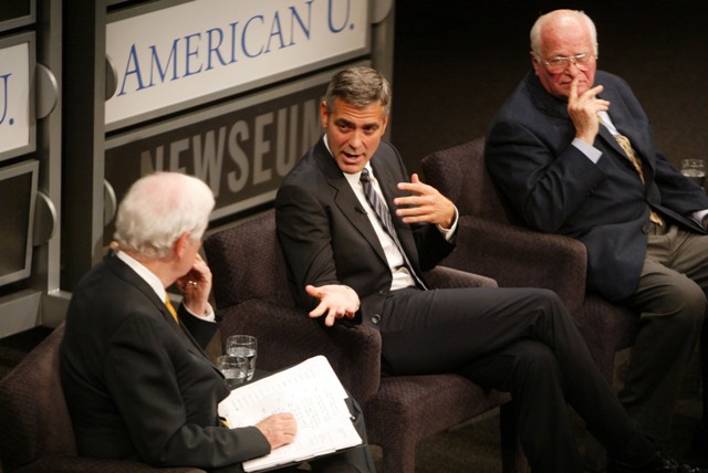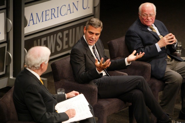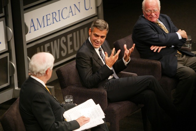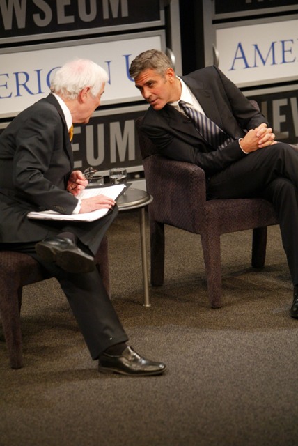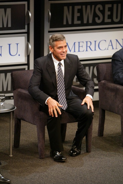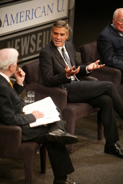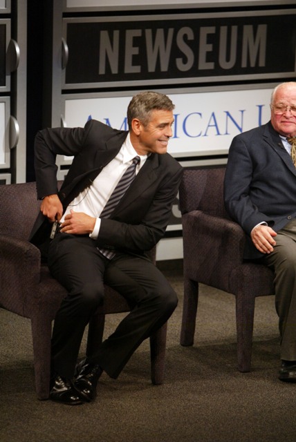 After shooting scenes for the final episode of ER last week, George Clooney flew back to Washington yesterday to attend a screening for his film Good Night and Good Luck and participate in a discussion at the Newseum and the American University School of Communication moderated by his dad Nick Clooney.