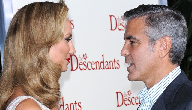 Anyway, here’s George Clooney with Stacy Keibler, always now, at the premiere of The Descendants last night. Kissing her hand. Oh la, Mr President (of Hollywood). That’s quite the display of affection. Can we expect another gear?