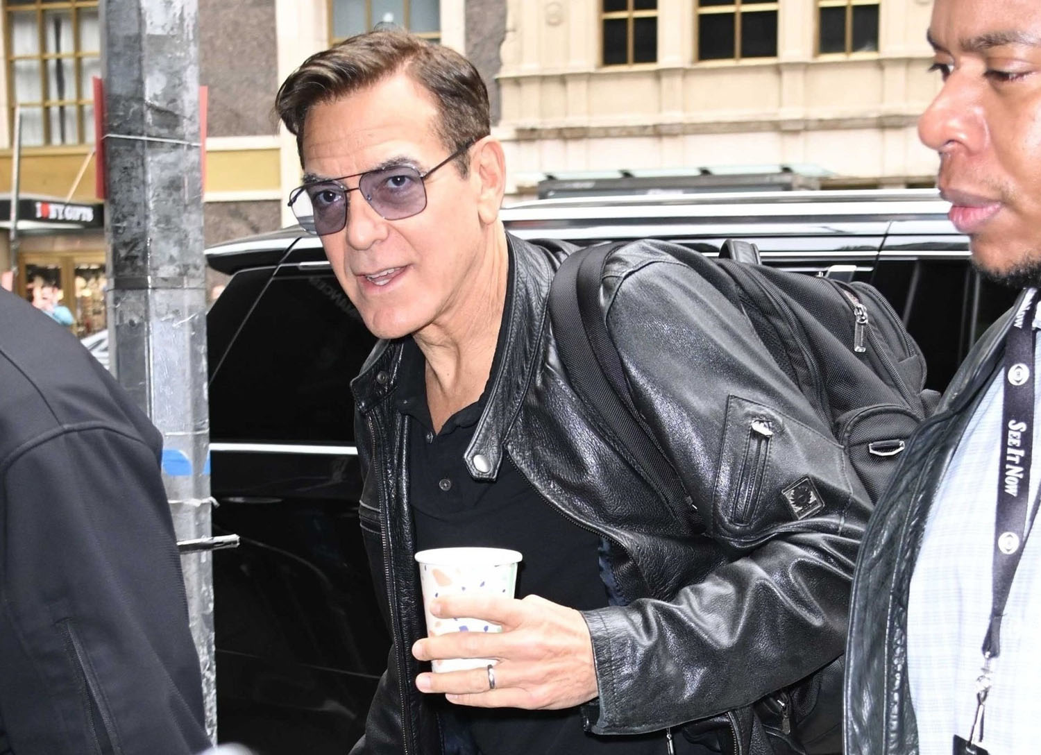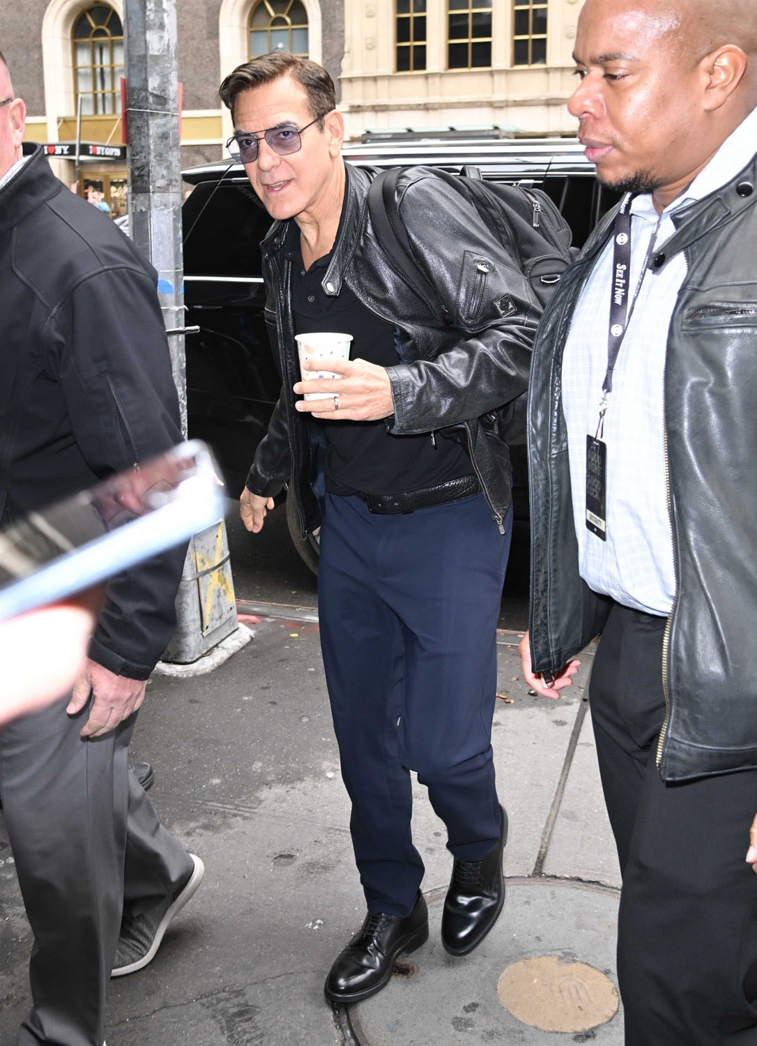 Here are some shots from a couple of days ago of George Clooney in New York where he is currently performing in previews for Good Night, and Good Luck on Broadway. Opening night is April 3. George and his producing partner Grant Heslov co-wrote the play based on their own film from 2005. In the film George played Fred Friendly; on stage he’s Edward R Murrow. And for the role, he’s dyed his hair dark.
