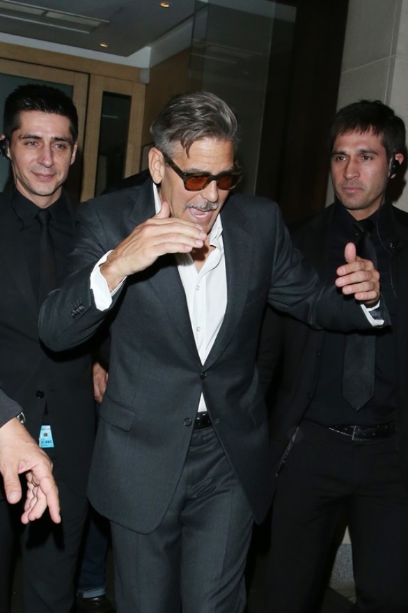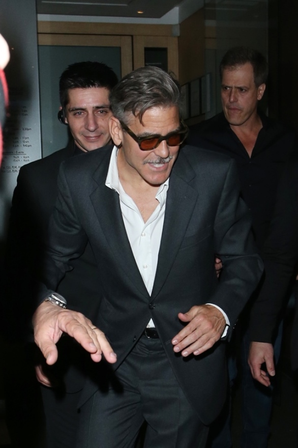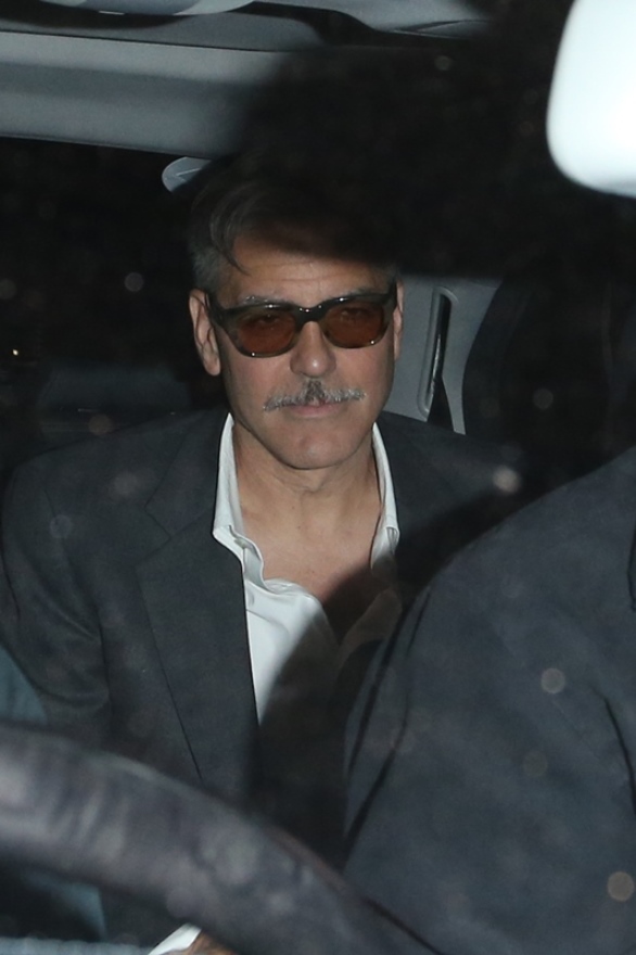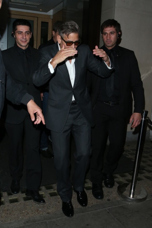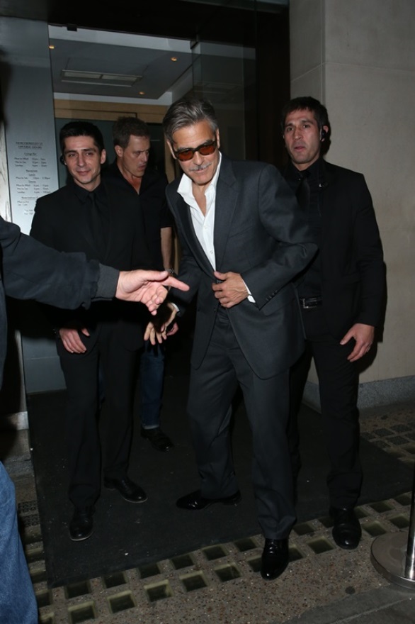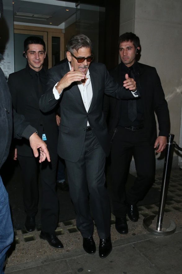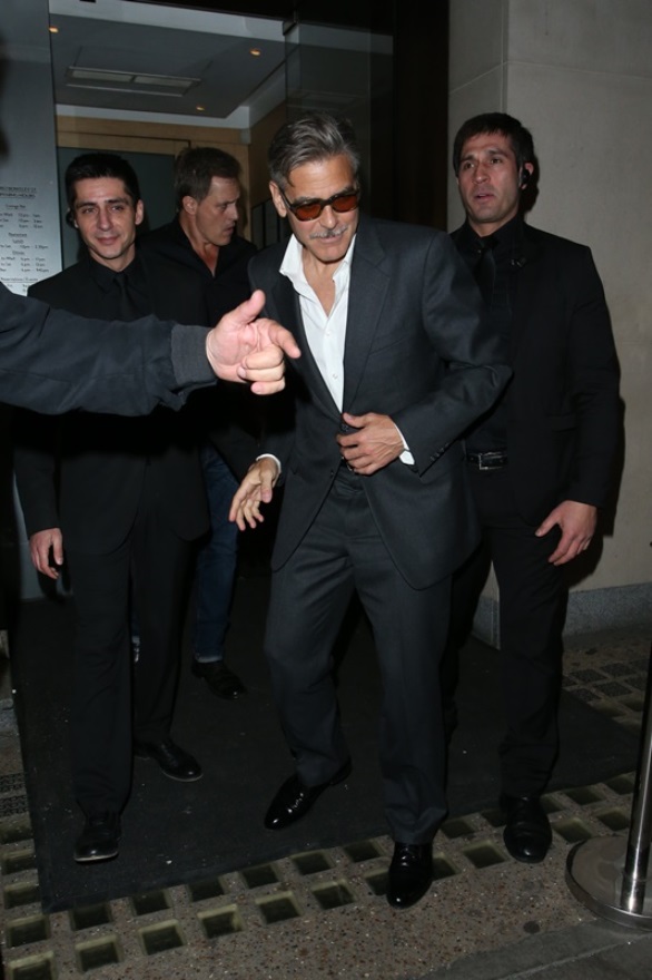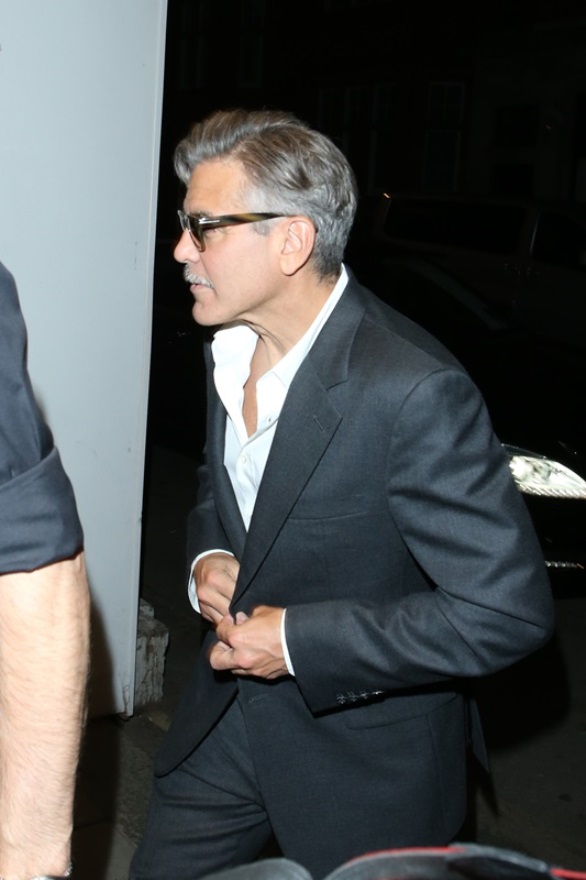 George Clooney was photographed in London last night after dinner with friends. UK gossips have suggested that he seemed unsteady on his feet. I believe it. I’ve seen it. It’s a good time when George goes out. For the last few months, George has been directing The Monuments Men. We last saw him hanging out in Italy, at his summer home in Lake Como. Click here for a refresher. He was with his boys, as usual, and no Stacy Keibler.