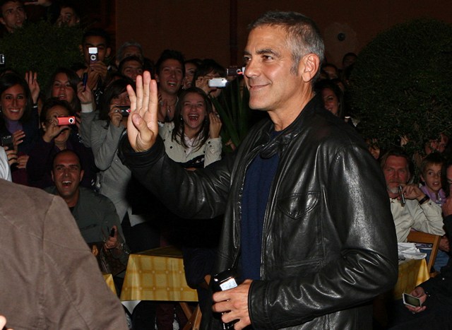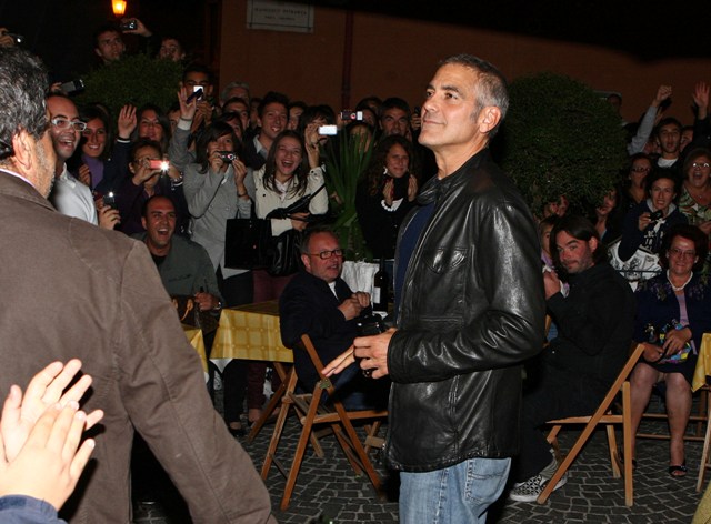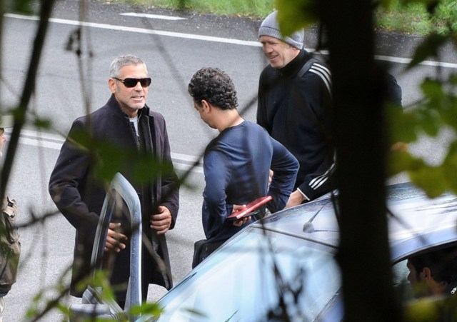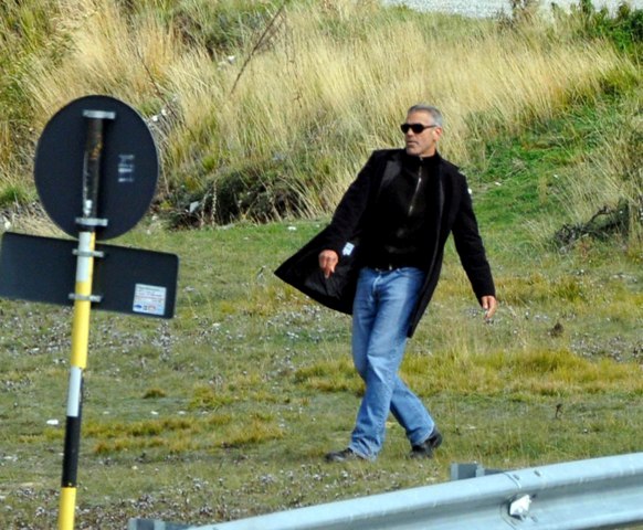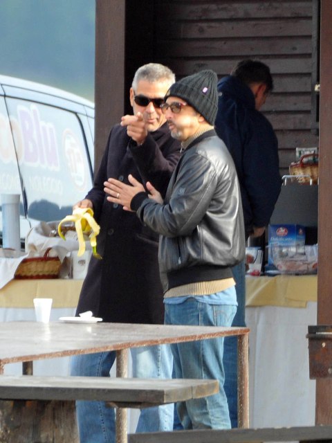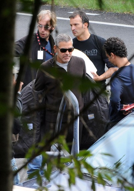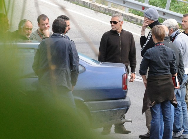 Making good on his promise to help galvanise the Italian community devastated by the earthquake last spring, George Clooney is there to work on a new film called A Very Private Gentleman. After spending some time in LA following TIFF, with Elisabetta Canalis at his side, George and his whitewashed piece of a fiery ass were photographed on set this weekend. Cue up the next bullsh-t story on People.com. Perhaps something about Elisabetta bringing cookies and sandwiches for crew members and reading to the children.