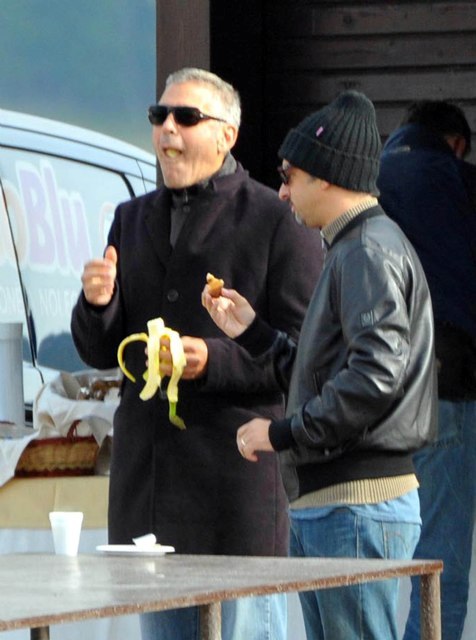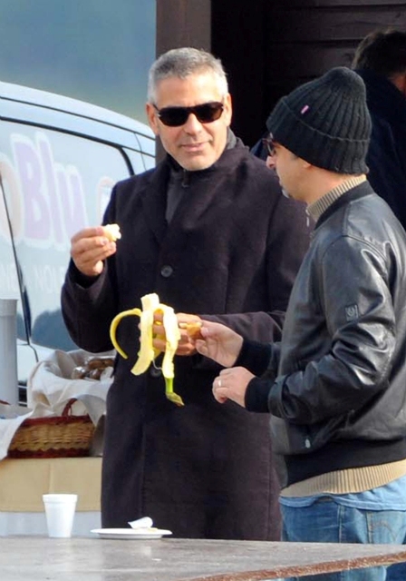 This is George on a break from filming eating a banana and of course in his usual manner charming the locals like a proper movie star. This is the way they are supposed to behave. I cannot stress how impressed people in Toronto were about his behaviour when he was at the film festival going out of his way to make sure no one felt left out. He remembers their names, he talks to the “minions”, he is kind and considerate and very, very chill. Doesn’t freak out around the paps, the fans, his energy is calm so that those surrounding him are calm which is why he moves around without drama.