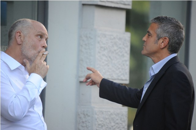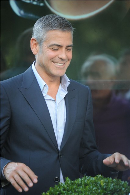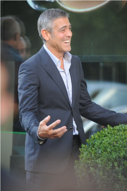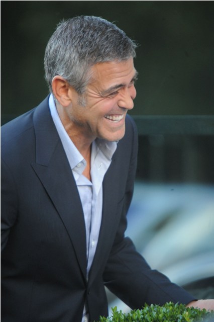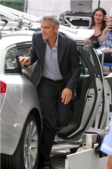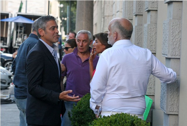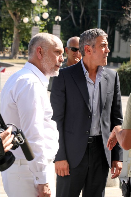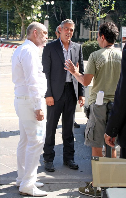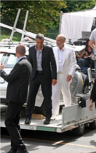 George Clooney was joined by John Malkovich yesterday in Italy on the set of his newest Nespresso ad. George was in great spirits, delighting the crew, enjoying a man moment with John, showing no concern about the Italian Queen’s current scandal. And why should he be concerned? No one in America cares about the sh-t they say in Italian, especially not when People Magazine only translates the good parts.