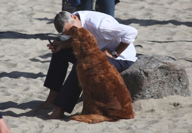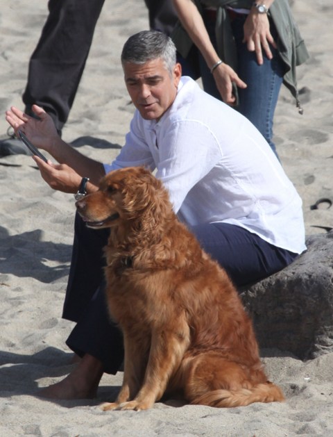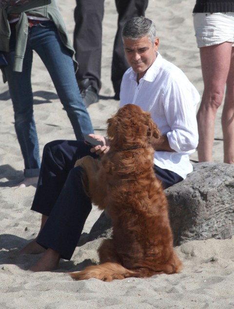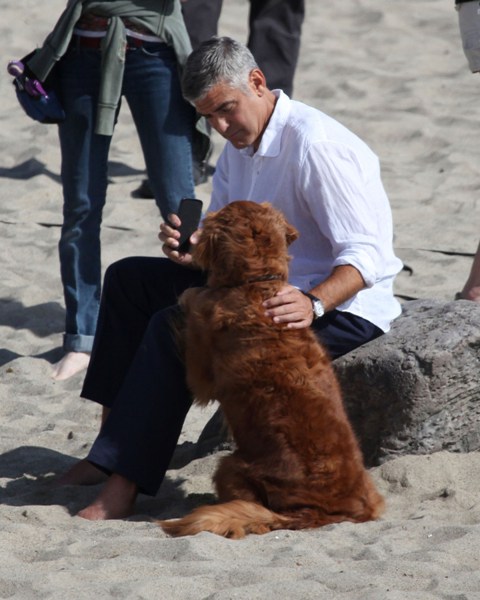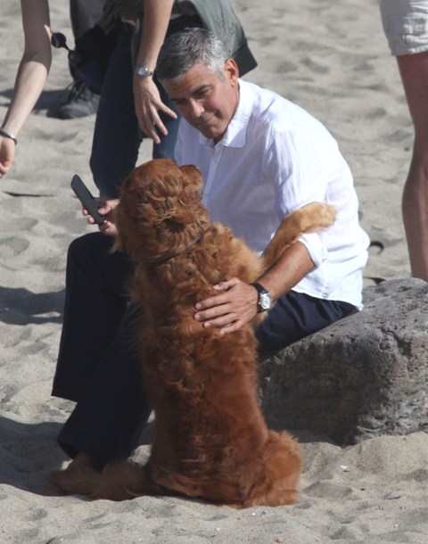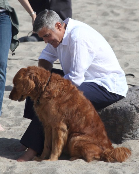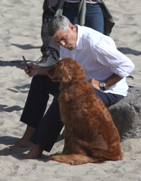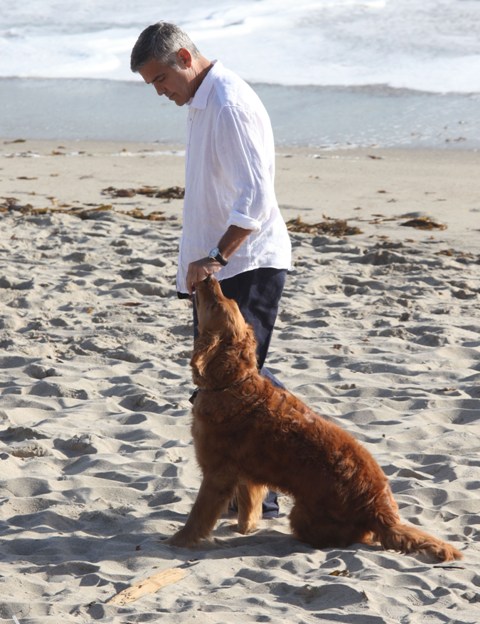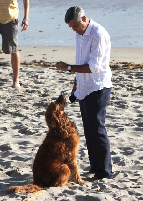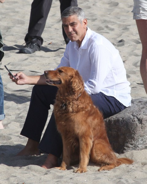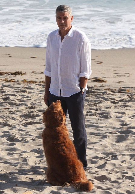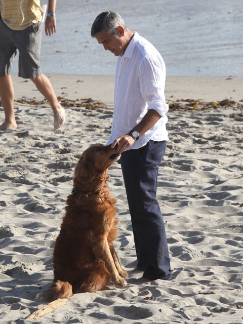 And here’s George Clooney with an actor dog on the beach shooting a commercial the other day. George has his own dog, Einstein so, as you can see, he knows how to talk to them. That’s my weakness: a man who can talk to dogs. Jacek can talk to any dog. Jacek will allow any dog to slobber themselves all over his face. At our house it’s become so pathetic that Marcus and Barney, between 9 and 9:30pm, will find Jacek and ask to be tucked in bed. By tucked in I mean he has to get into bed, lift up the covers like a servant, wait for them to position themselves all over his legs, groom themselves until it’s just right, and leave only when they put their heads down and start snoring, otherwise the whole process has to start over again from the beginning.
