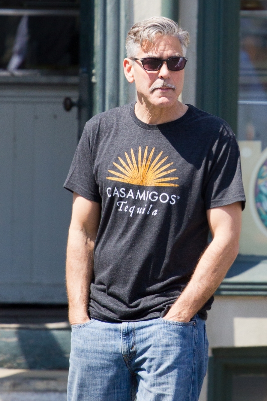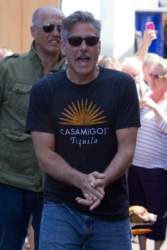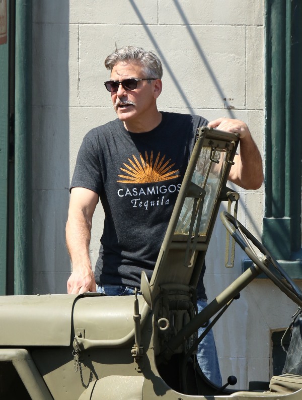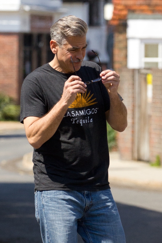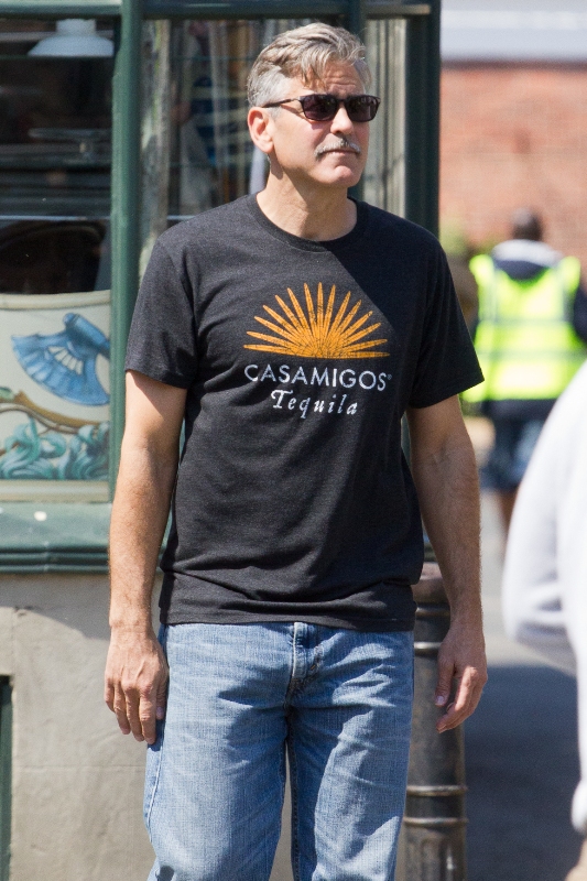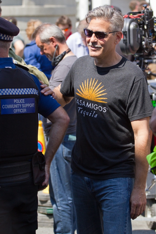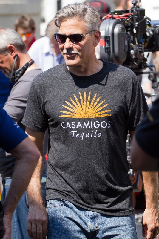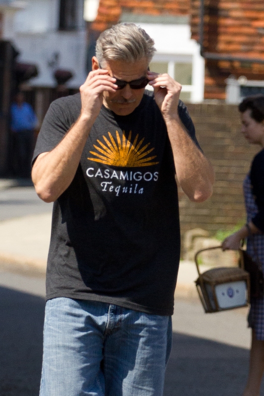 Here’s George Clooney in England today shooting Monuments Men wearing a t-shirt promoting his tequila company. Might as well, right?