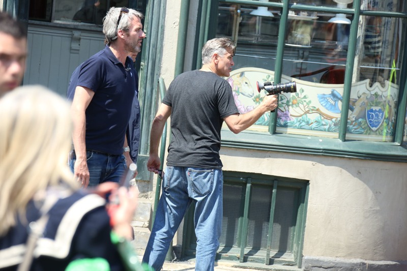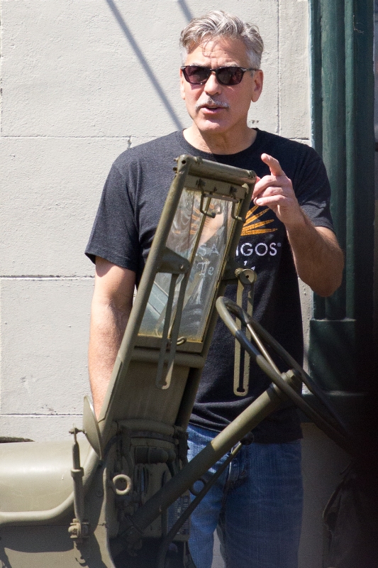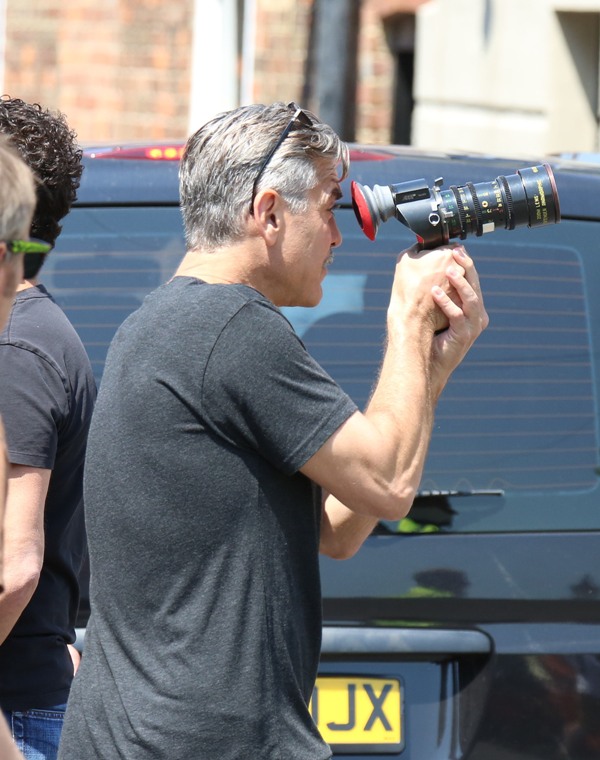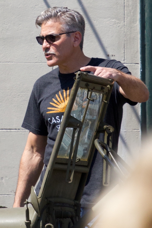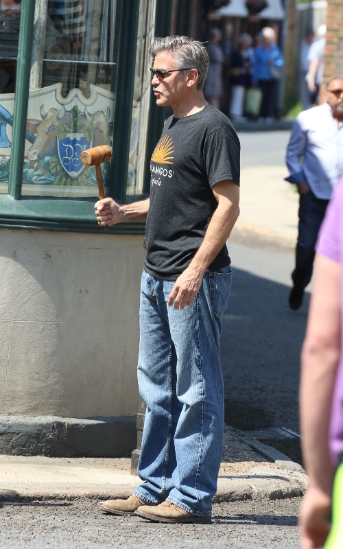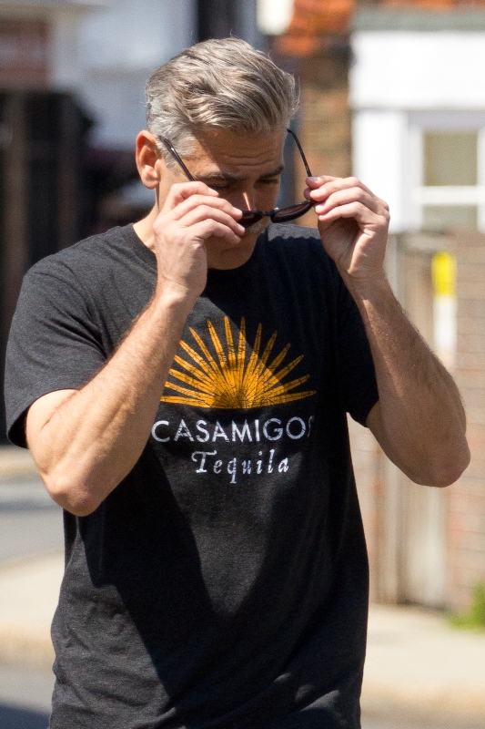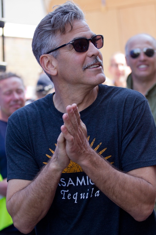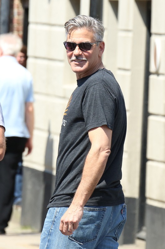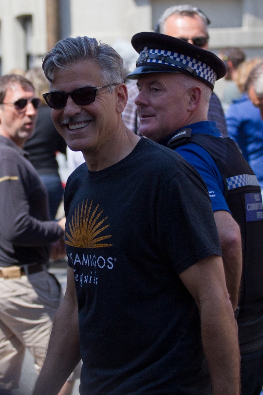 Here’s George Clooney in England today shooting Monuments Men wearing a t-shirt promoting his tequila company. Might as well, right?