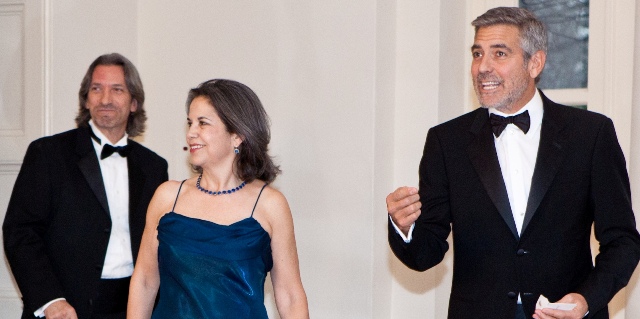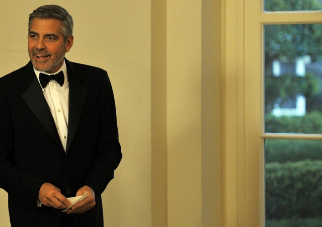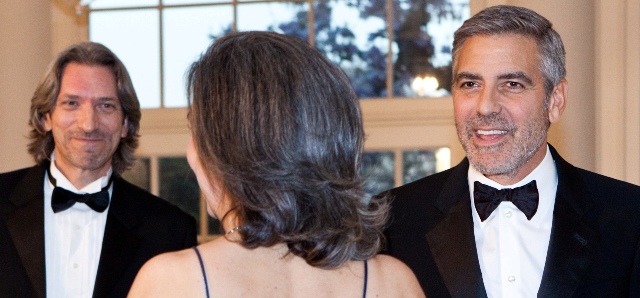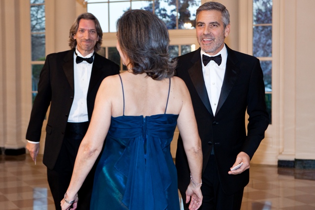 Instead, George’s DC constant companion, his date, if you will, has been John Prendergast. And they look great together, don’t they? Here they are, side by side, at the hearing where George wore a really, really lovely tie, and also arriving together at the President’s event in the evening.