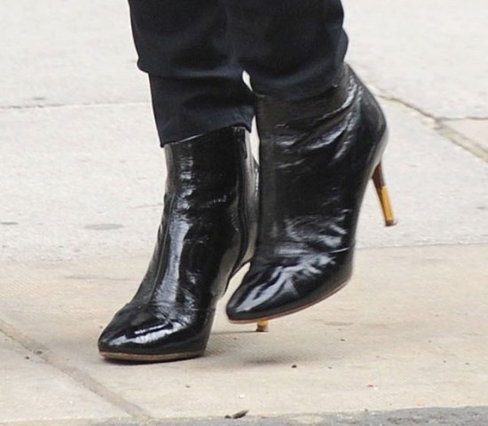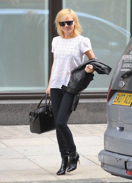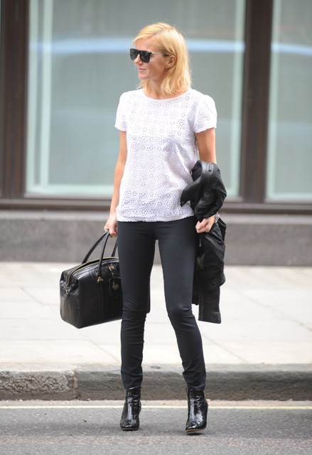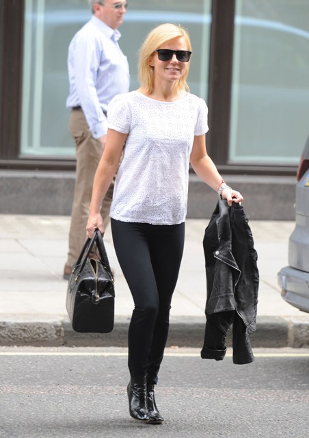 Ginger Spice turned 40 yesterday. Today she stepped out in black fitted pants and a really cute white eyelet blouse. Everything works...but those boots.