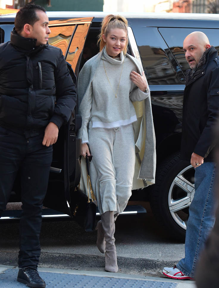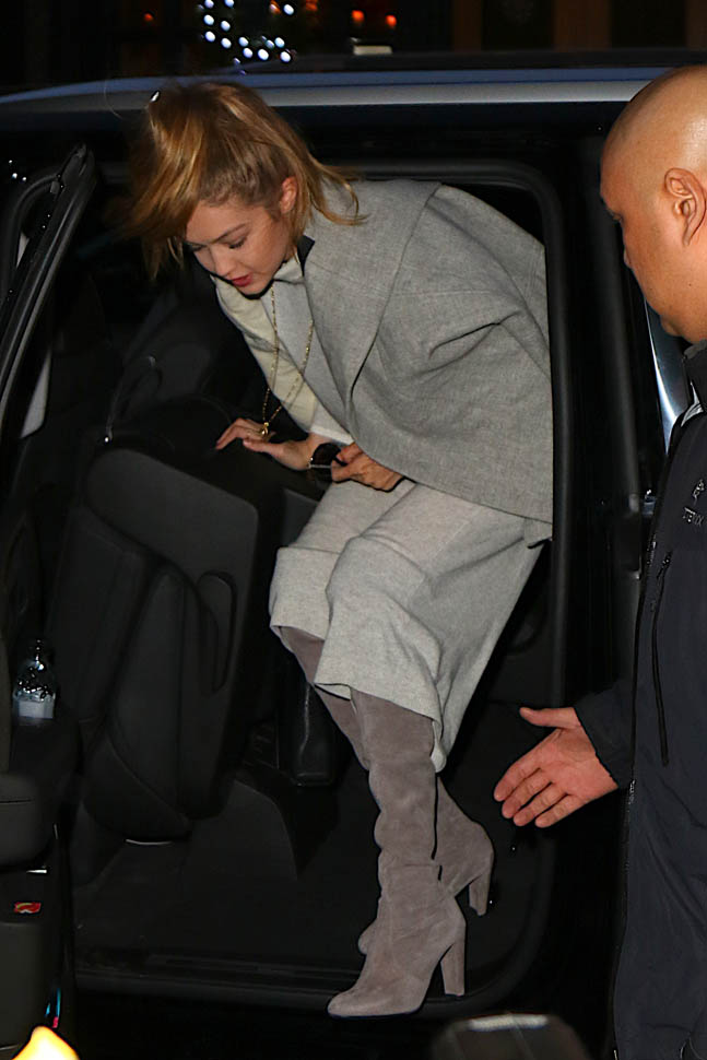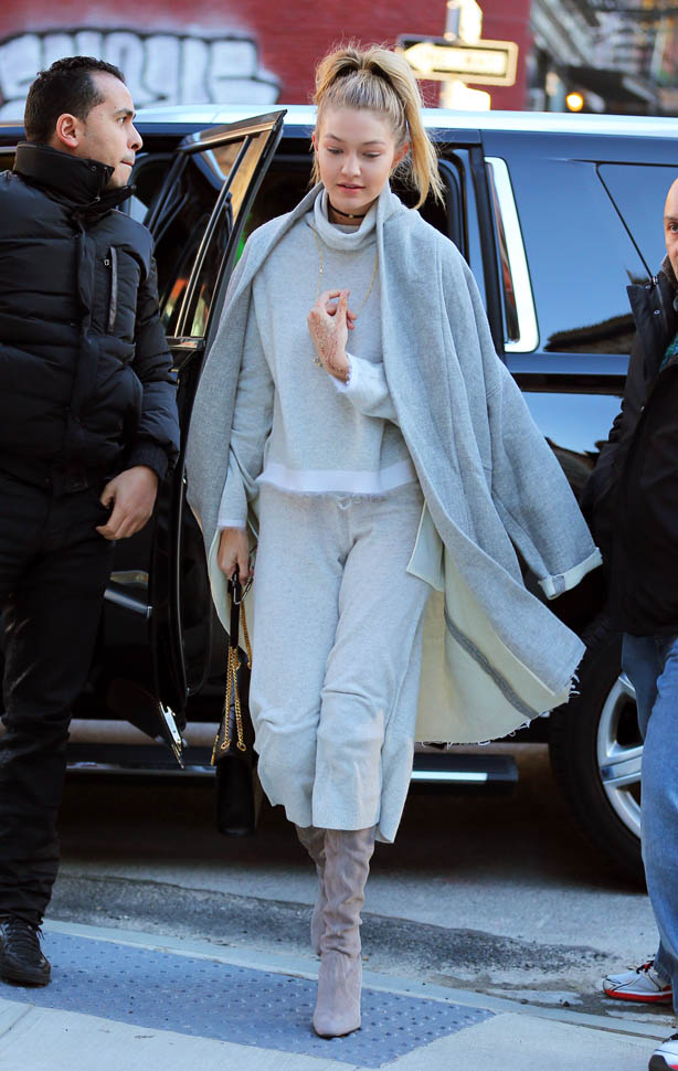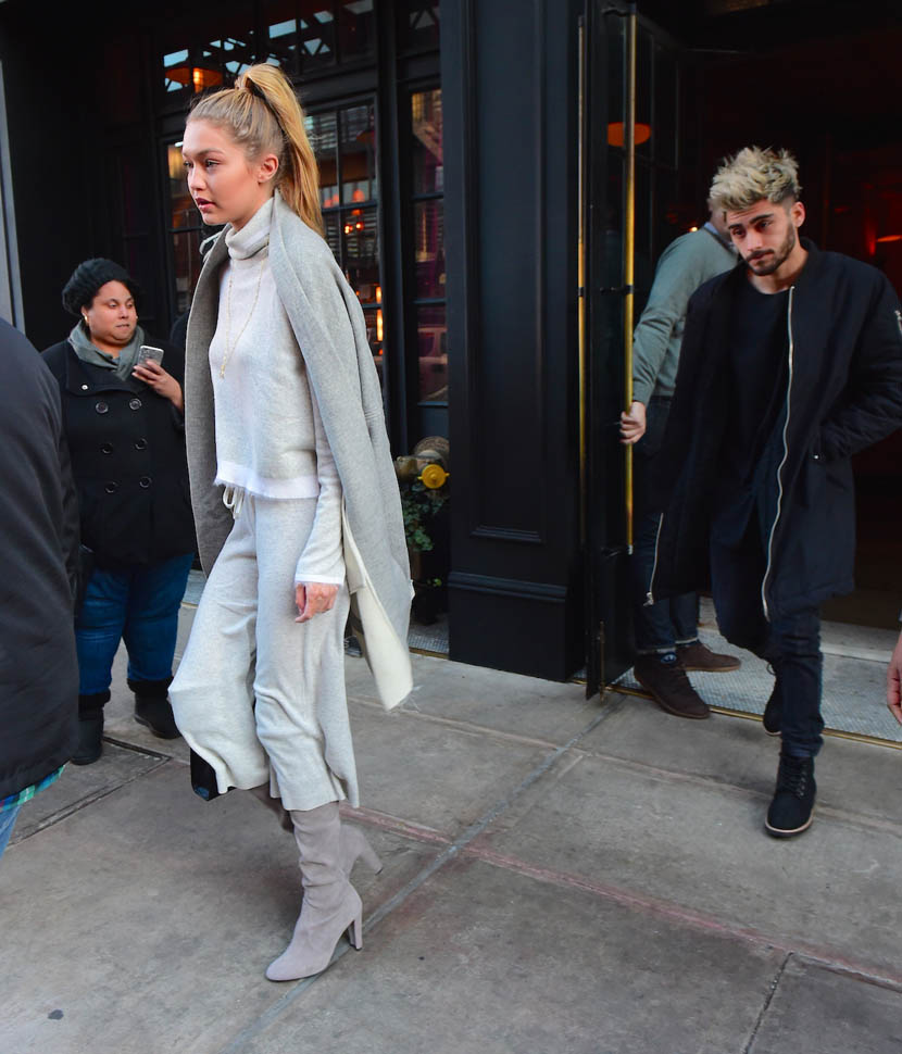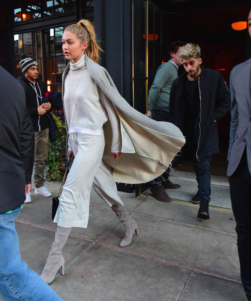 Gigi Hadid and Zayn Malik were in New York yesterday keeping the paps busy. They went shopping, they went to look at some apartments, they hit up Soho House for lunch…and the whole time, that beautiful coat, which she wore as a cape, never slipped off her shoulders. This is why models are freaks of nature. Because that sh-t never works on regular people. I have tried! I will, however, never try to wear cut off sweatpants over knee-high suede boots. Not that it’s not a good look. On her it’s a great look. On HER.