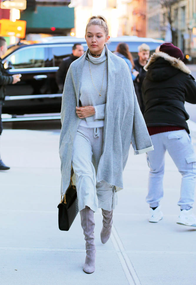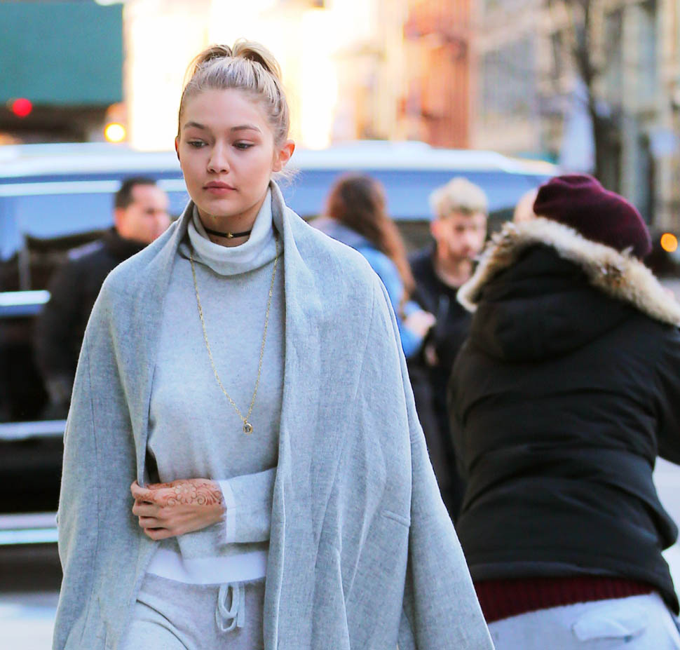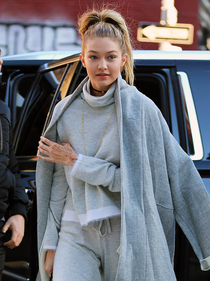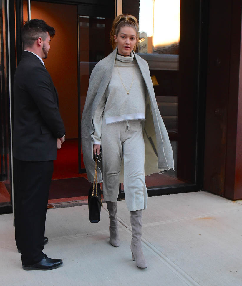 Gigi Hadid and Zayn Malik were in New York yesterday keeping the paps busy. They went shopping, they went to look at some apartments, they hit up Soho House for lunch…and the whole time, that beautiful coat, which she wore as a cape, never slipped off her shoulders. This is why models are freaks of nature. Because that sh-t never works on regular people. I have tried! I will, however, never try to wear cut off sweatpants over knee-high suede boots. Not that it’s not a good look. On her it’s a great look. On HER.