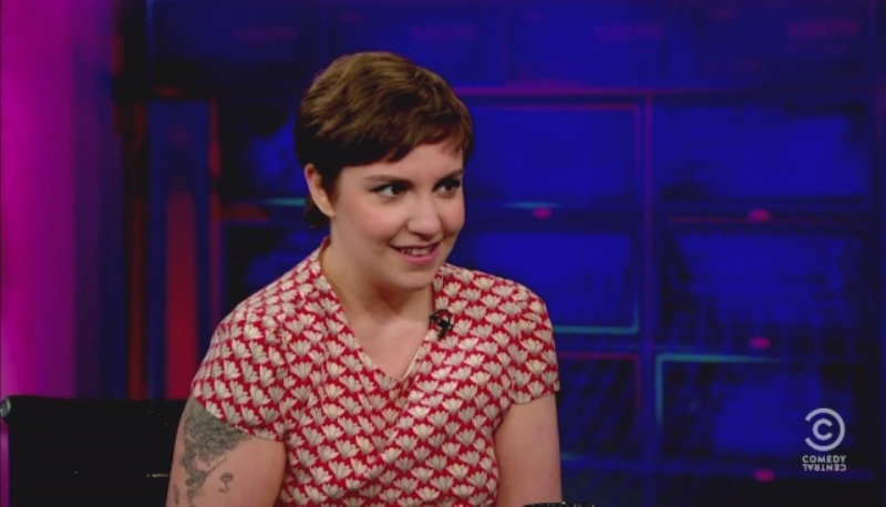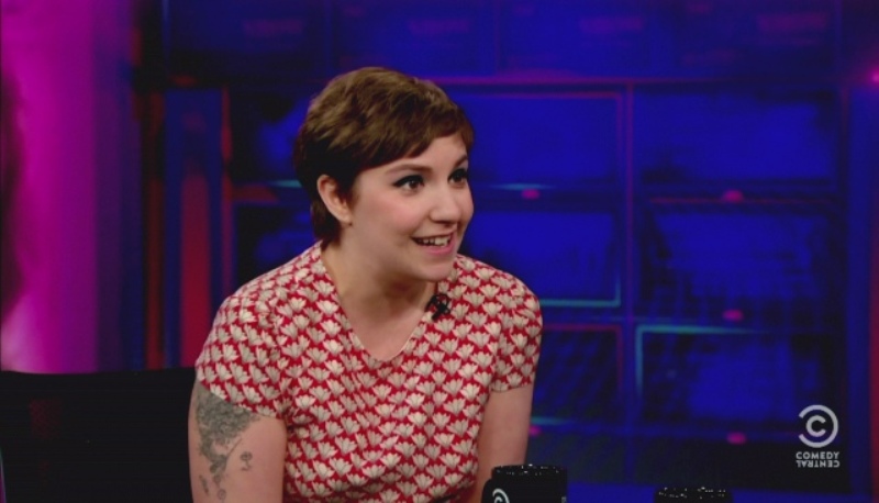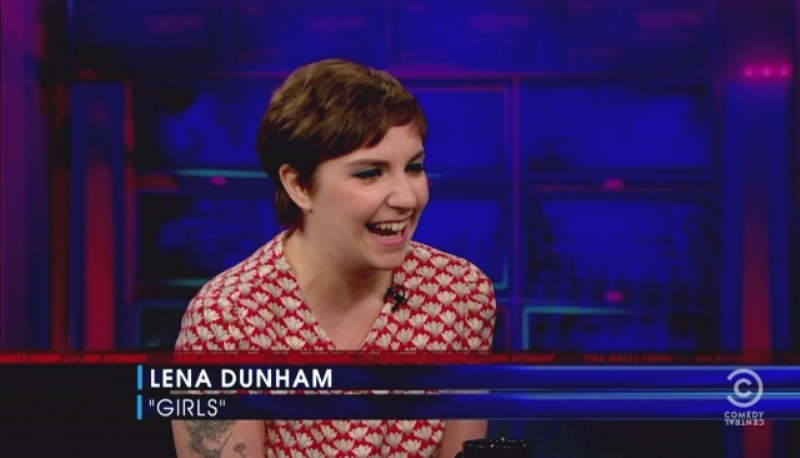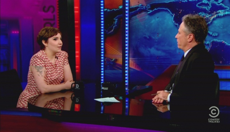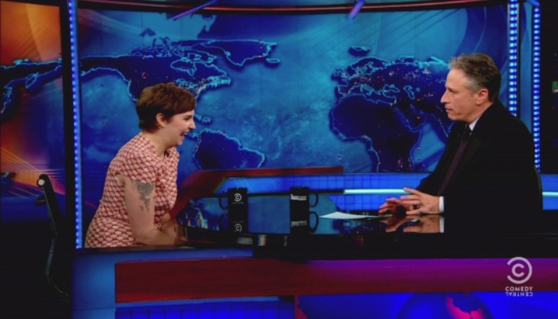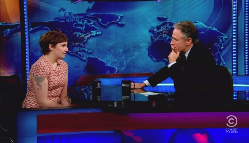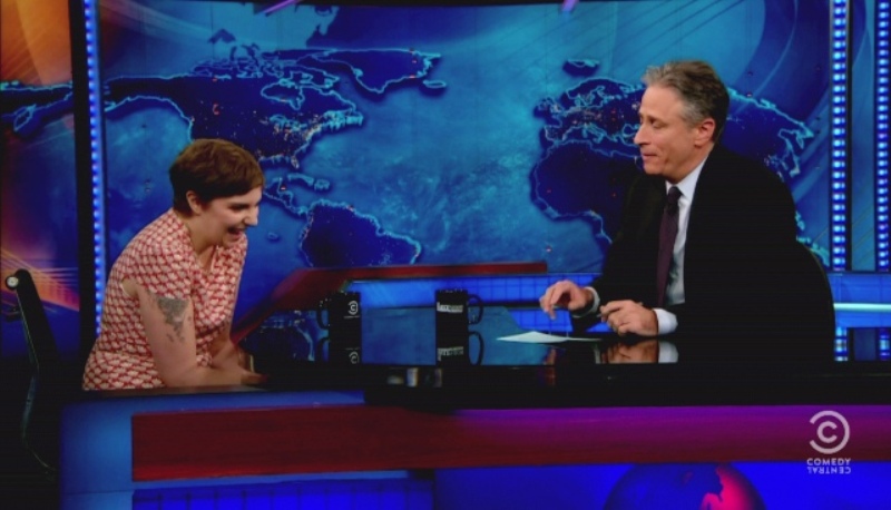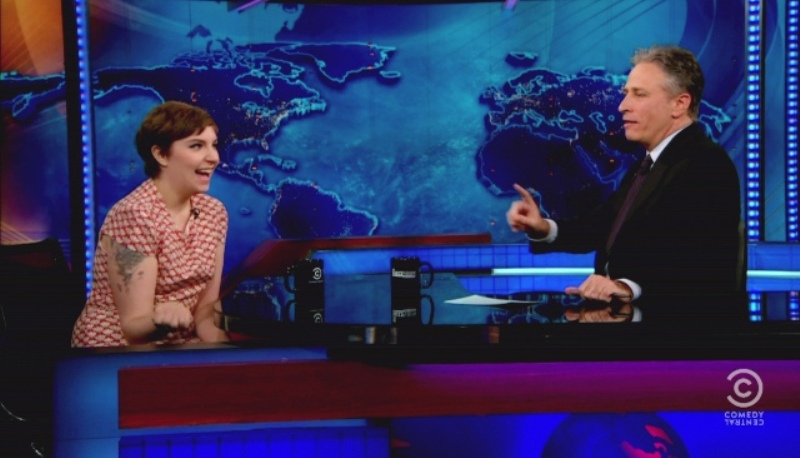 Attached - Lena Dunham with Jon Stewart last week.