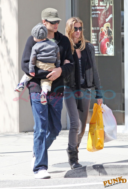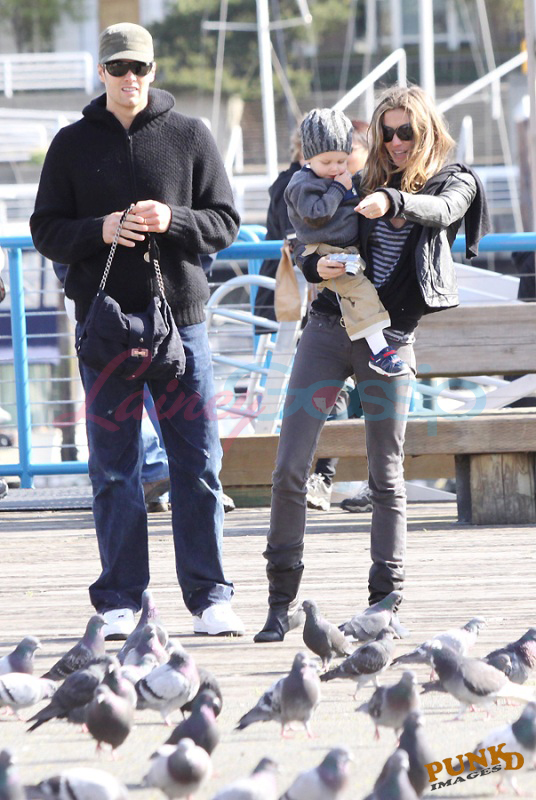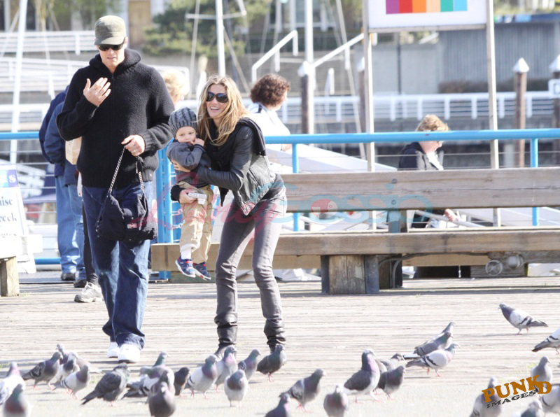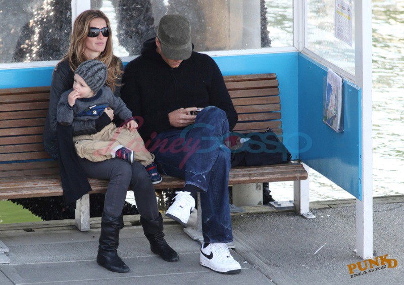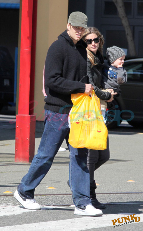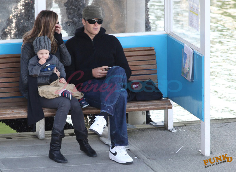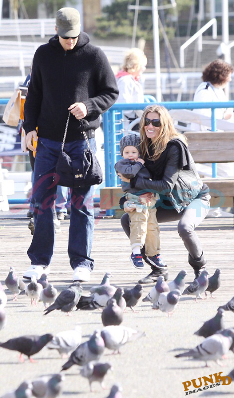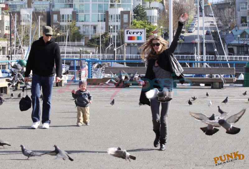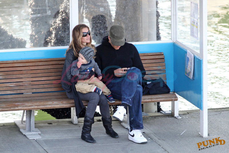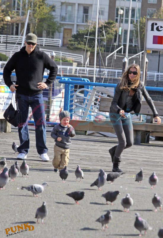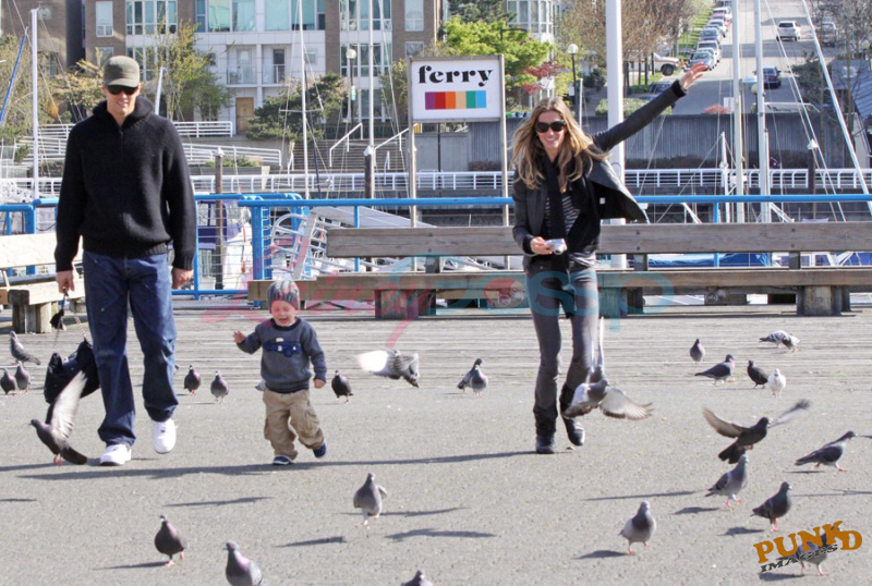 Bridget Moynihan is in town shooting Ramona and Beezus with Selena Gomez. So newlyweds Tom Brady and Gisele Bundchen flew in for a couple of days to spend time with the baby. It was beautiful in Vancouver on Friday. They spent the afternoon exploring the city, took the ferry over to Granville Island, chased pigeons on the pier – as you can see from these exclusives, they’re sickeningly gorgeous all three.
