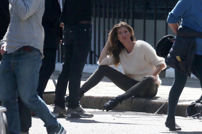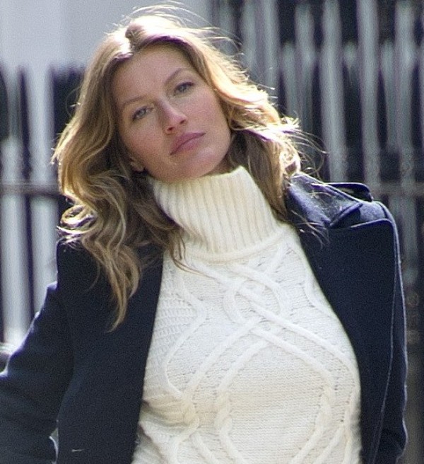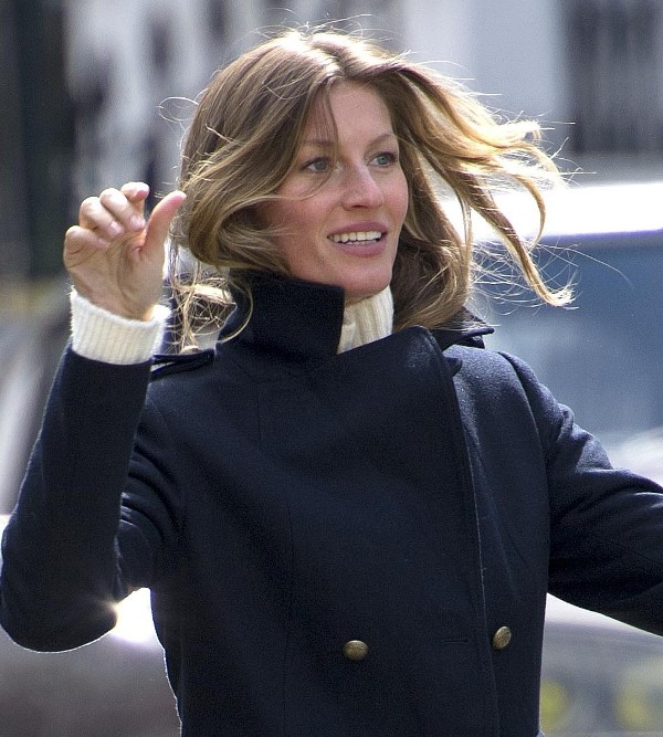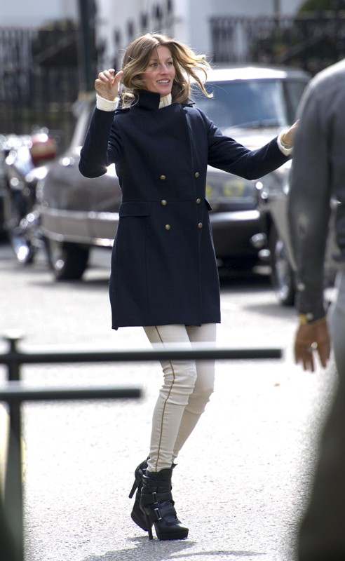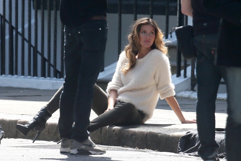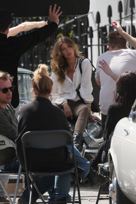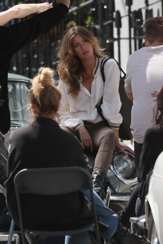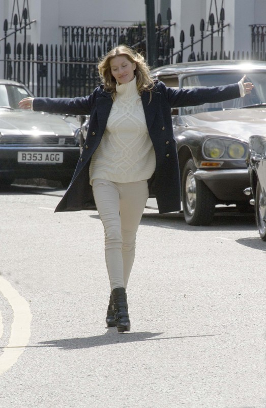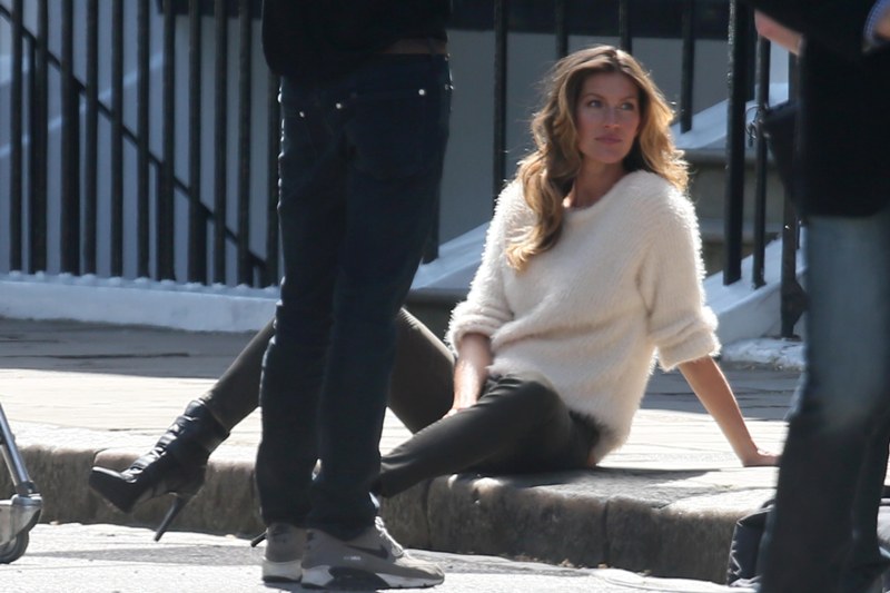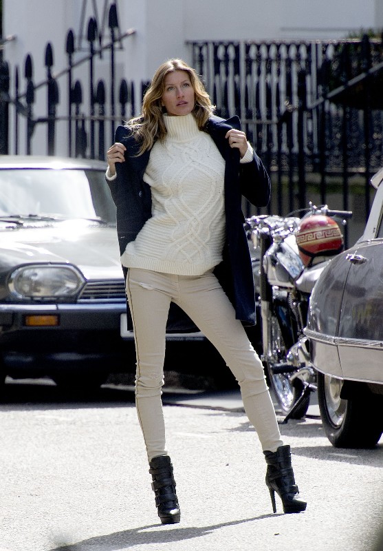 Gisele Bundchen was in London today working on a photo shoot for H&M dressed primarily in neutrals. The same could be said for the face. Here’s why they say supermodels are freaks of nature: she barely has any makeup on.