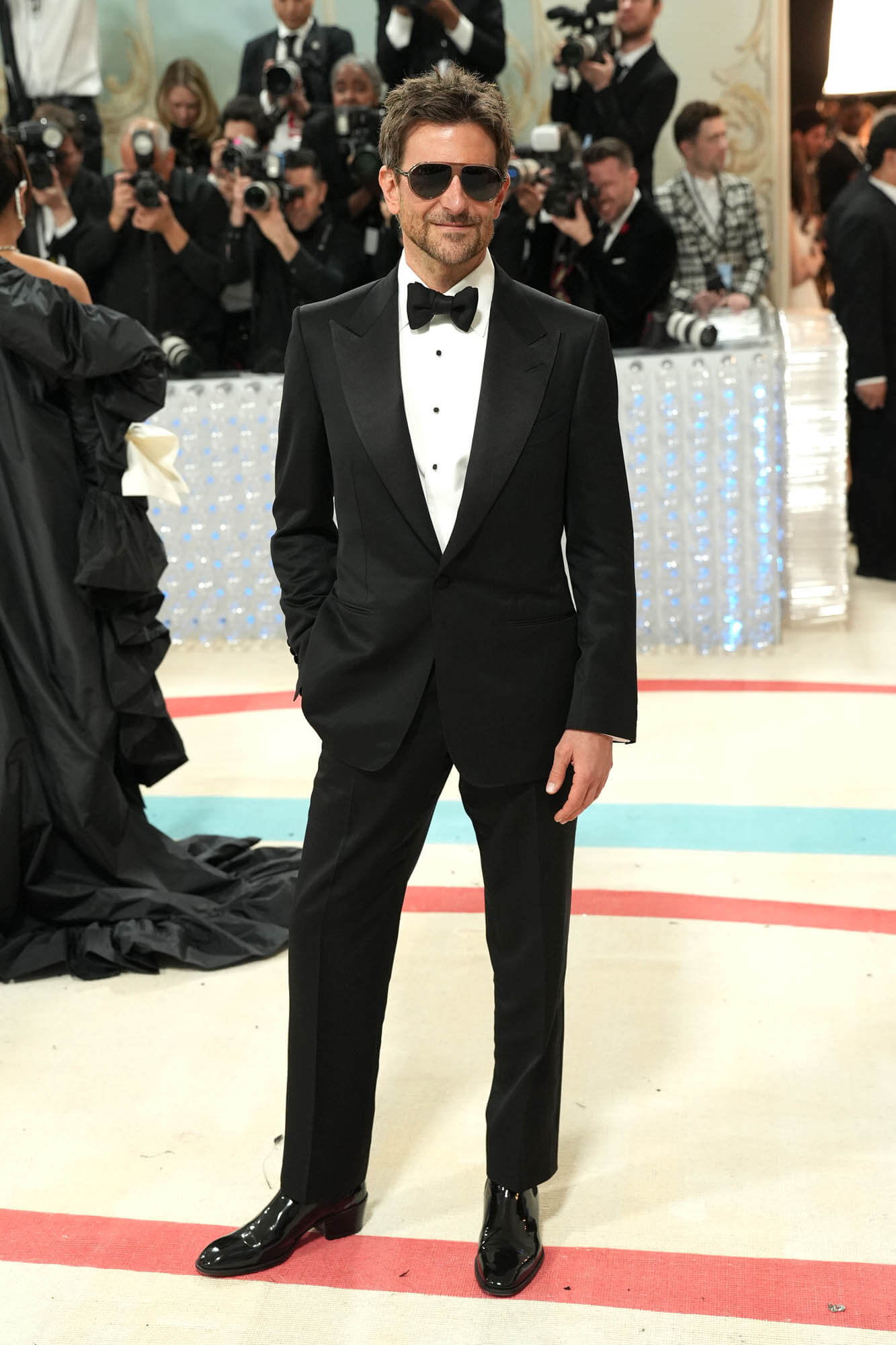 Can I nominate Bradley Cooper? BCoop is a Met Gala regular and he showed up last night in a classic black tuxedo on his own, though Irina Shayk was there, in a look I do not understand at all. Like what even is this? What are these shoes?!