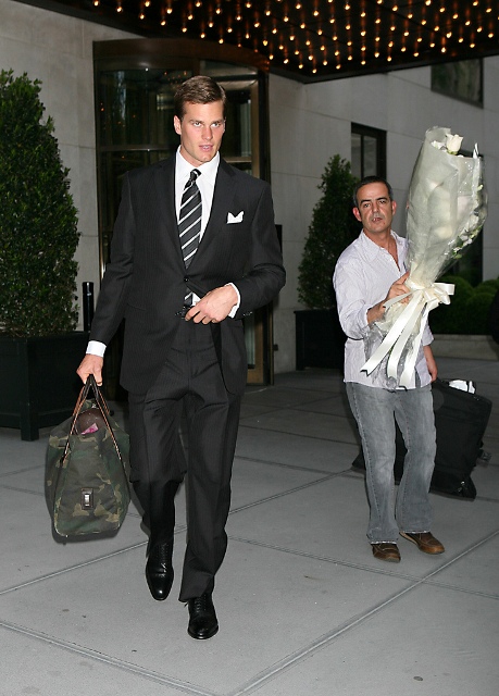 For Gisele Bundchen and Tom Brady, the situation was a little different. They came together, they got out of the limo, he ducked his head and dashed up the stairs – too quickly for still photographers to even notice, I caught a glimpse of him just as he dashed into the ballroom… SO CUTE. Hair combed and parted like a little boy going to church! (here he is on his way to pick her up - with flowers!)